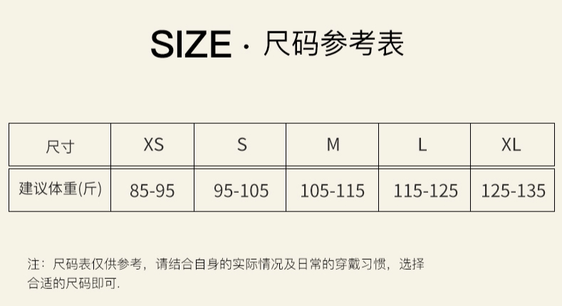 Size XS (suitable for 75-100Jin Jin equal to 0.5kg),S (suitable for 100-120Jin Jin is equal to 0.5kg),M (suitable for 120-140Jin Jin is equal to 0.5kg),L (suitable for 140-160Jin Jin is equal to 0.5kg),XL (suitable for 160-180Jin Jin equal to 0.5kg)