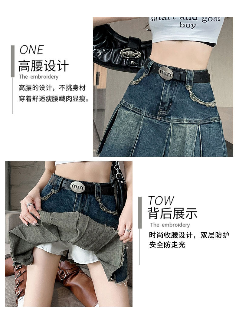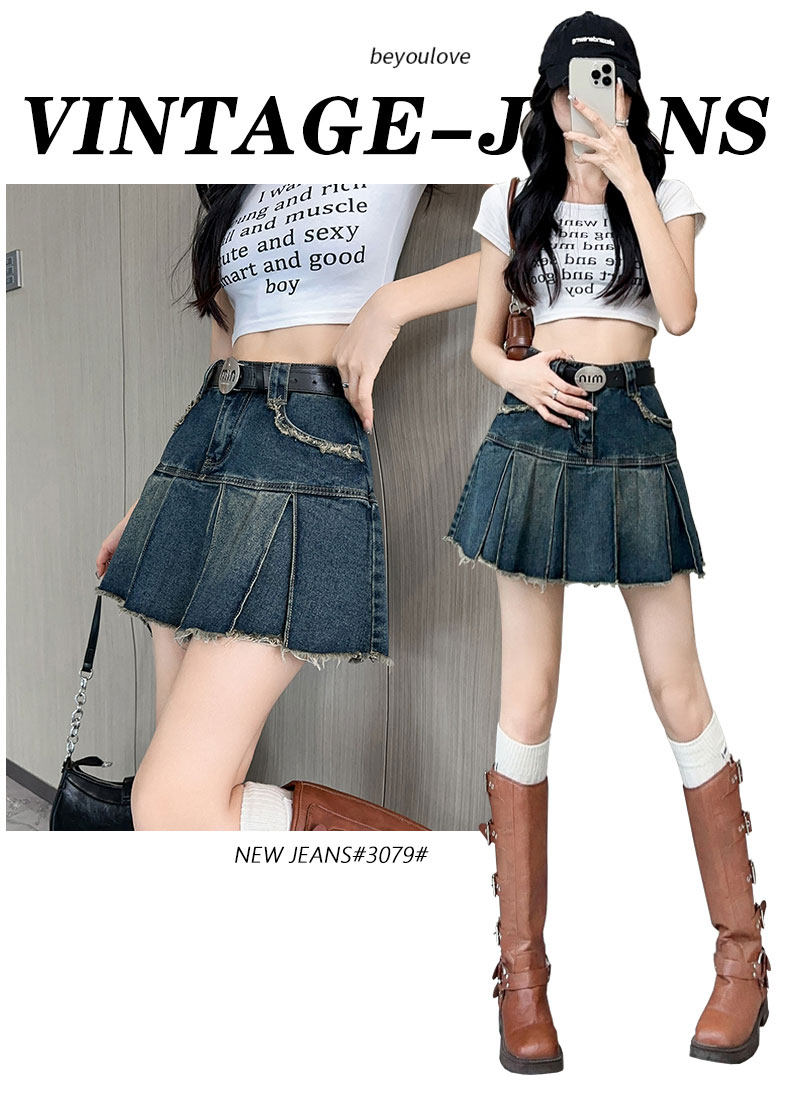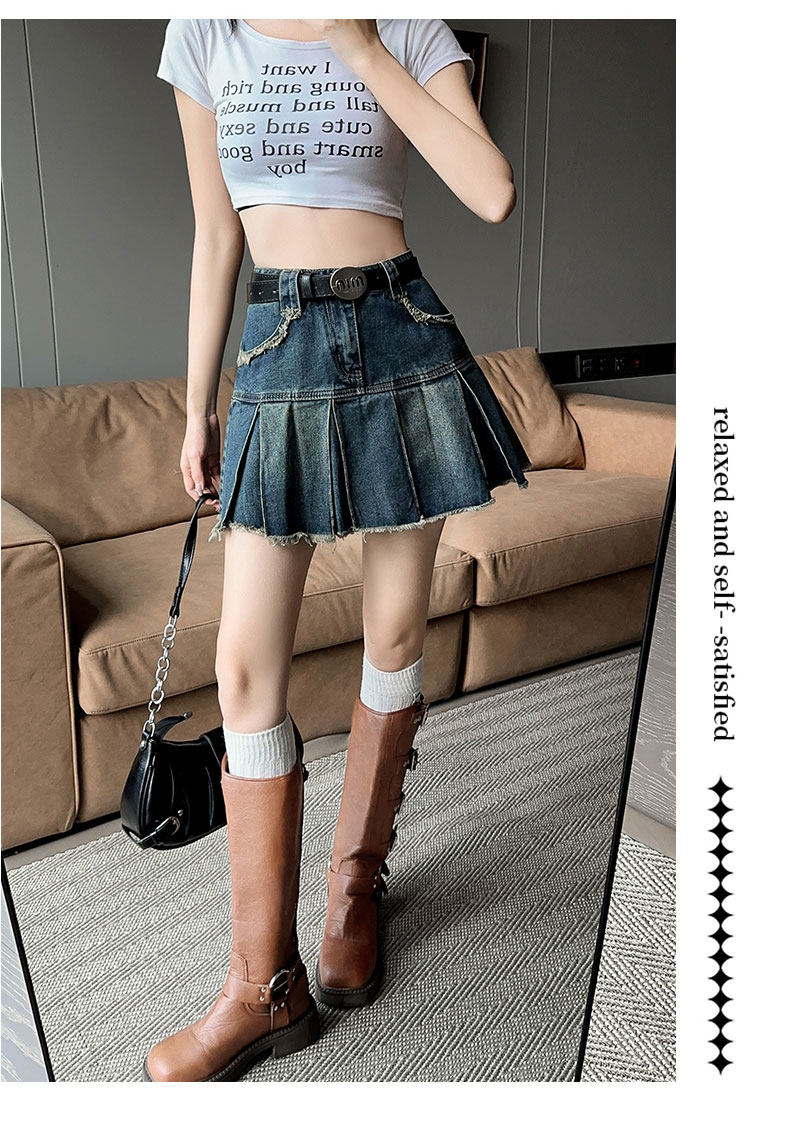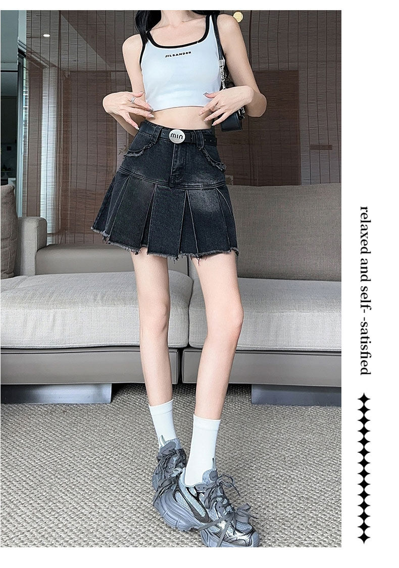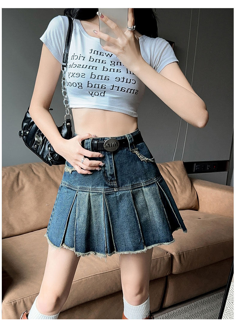 Blue Denim Pleated Short Skirt for Women, Summer Thin, Hip-Hugging, Anti-Exposure, Petite, High-Waisted, Frayed Edge, Spicy Girl A-Line Skirt