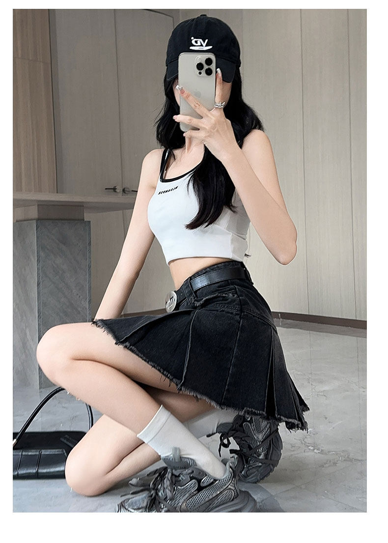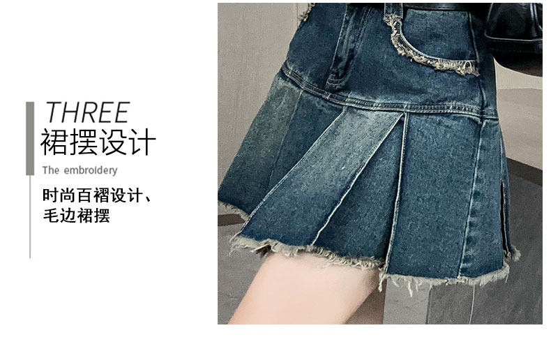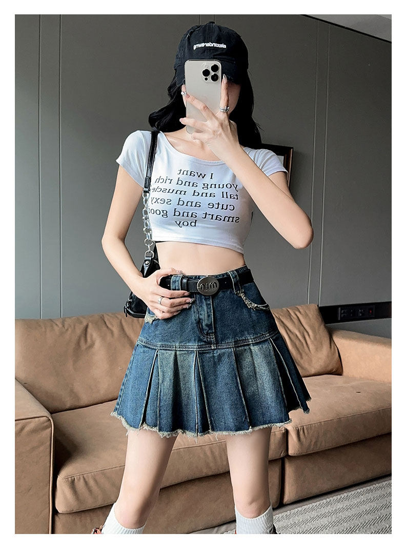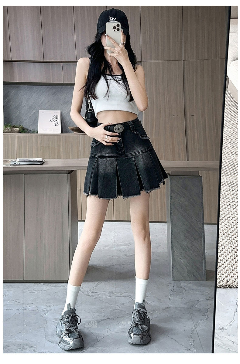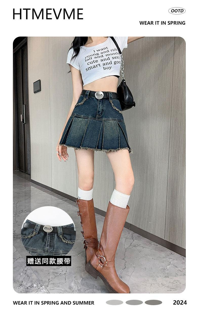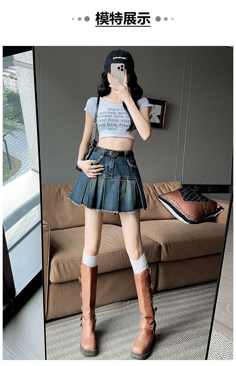 Blue Denim Pleated Short Skirt for Women, Summer Thin, Hip-Hugging, Anti-Exposure, Petite, High-Waisted, Frayed Edge, Spicy Girl A-Line Skirt