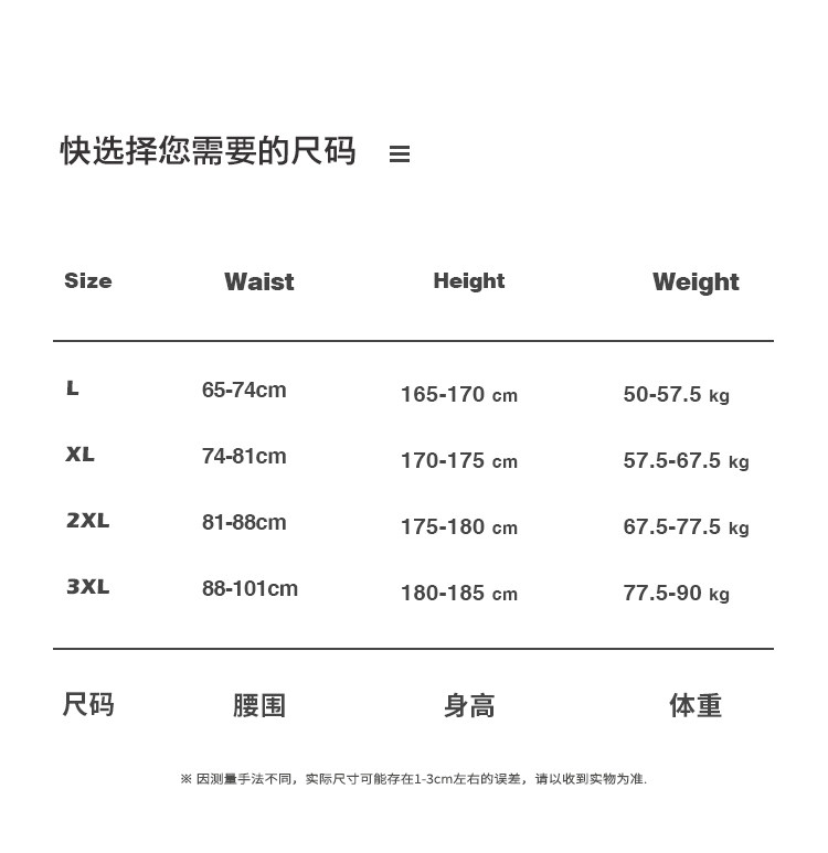China (cm) 165 / 88-90 170 / 96-98 175 / 108-110 180 / 118-122 185 / 126-130