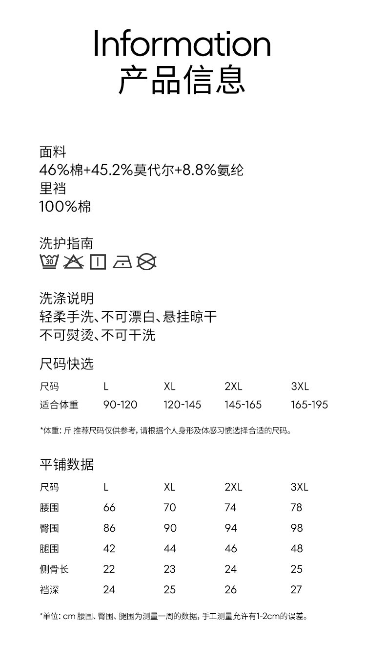 Body Material Composition Cotton 46% Modal Fiber (Modal) 45.2% Polyurethane Elastic Fiber (Spandex) 8.8%