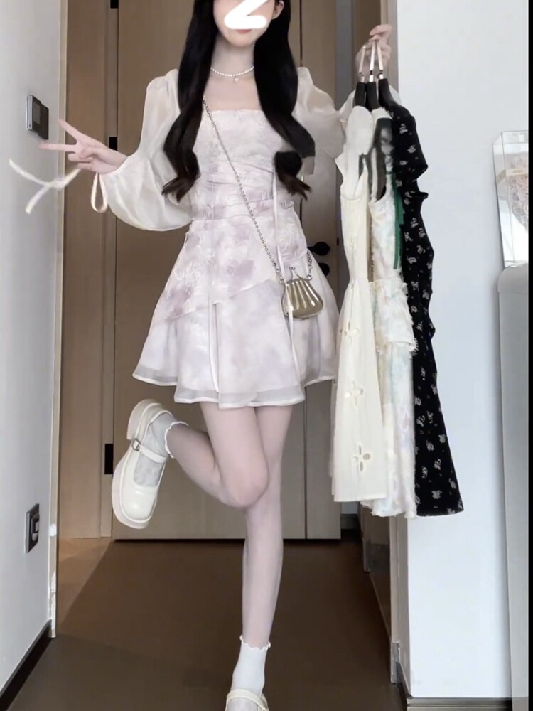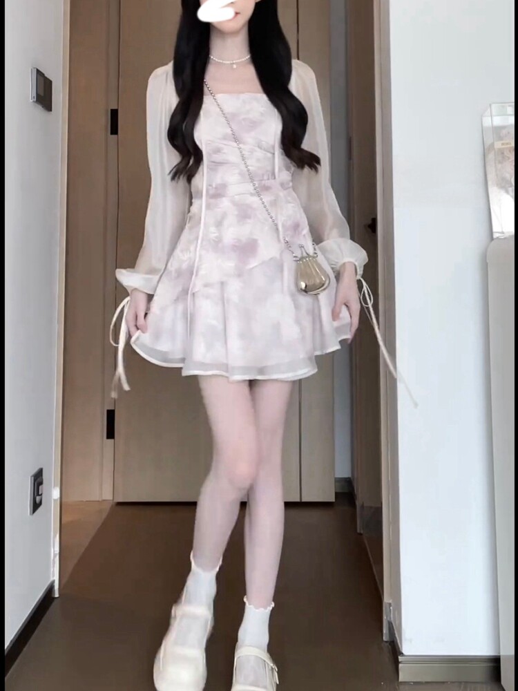 Summer new petite holiday dress suspender skirt with shawl short cardigan jacket two-piece set for women