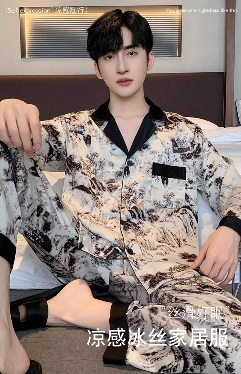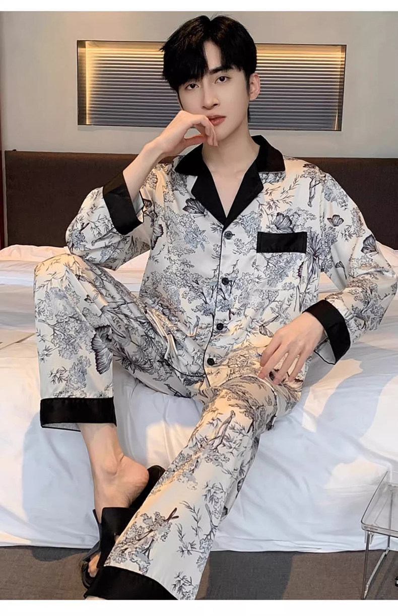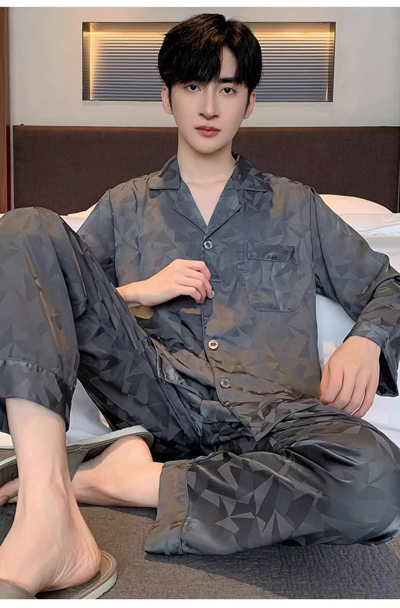 Ice Silk Pajamas for Men, Summer 2026 New Style, Satin Long-Sleeved, Imitation Silk, Suitable for All Seasons, Two-Piece Home Wear Set