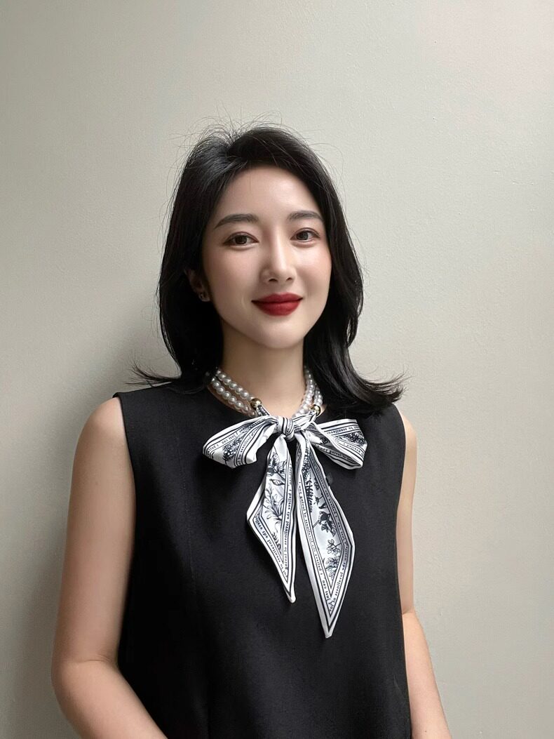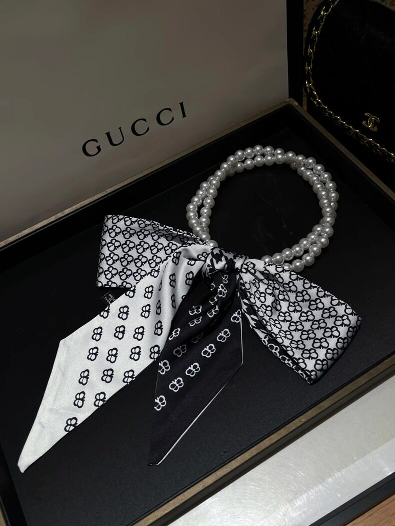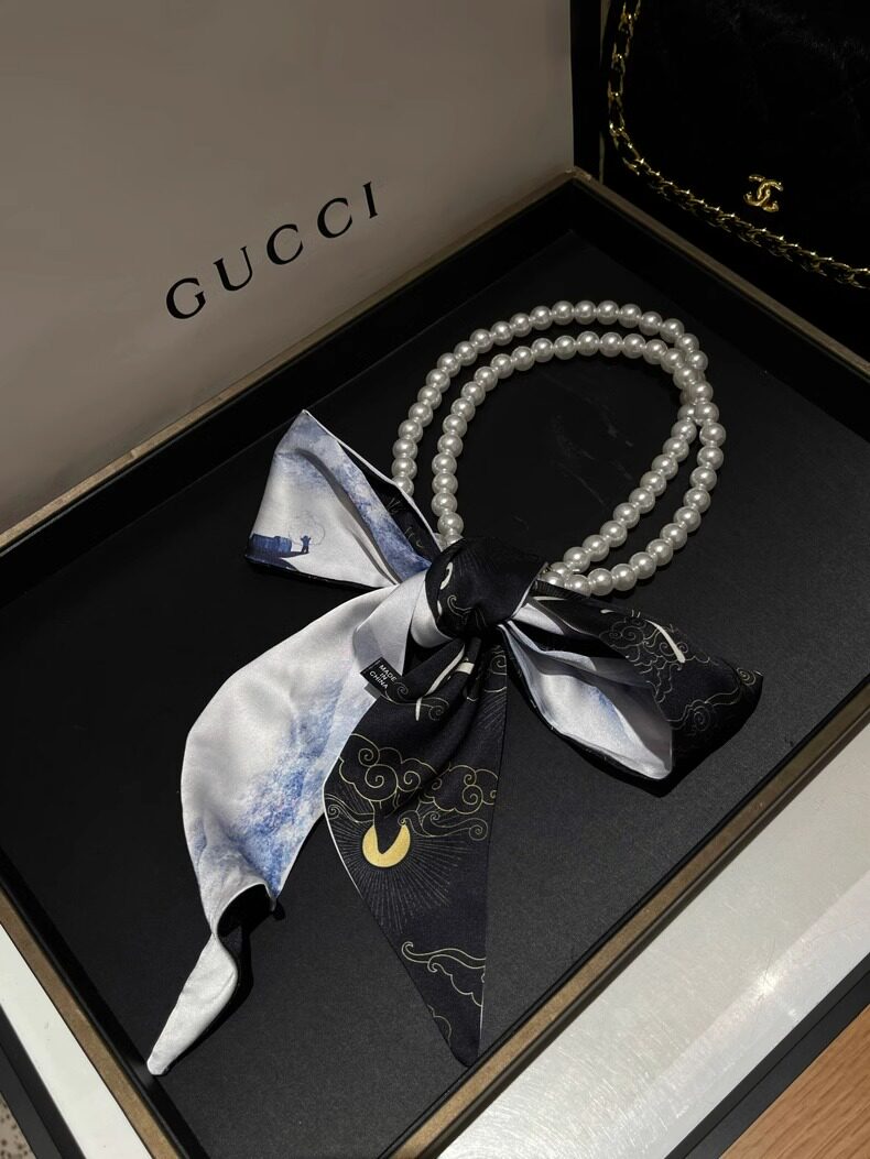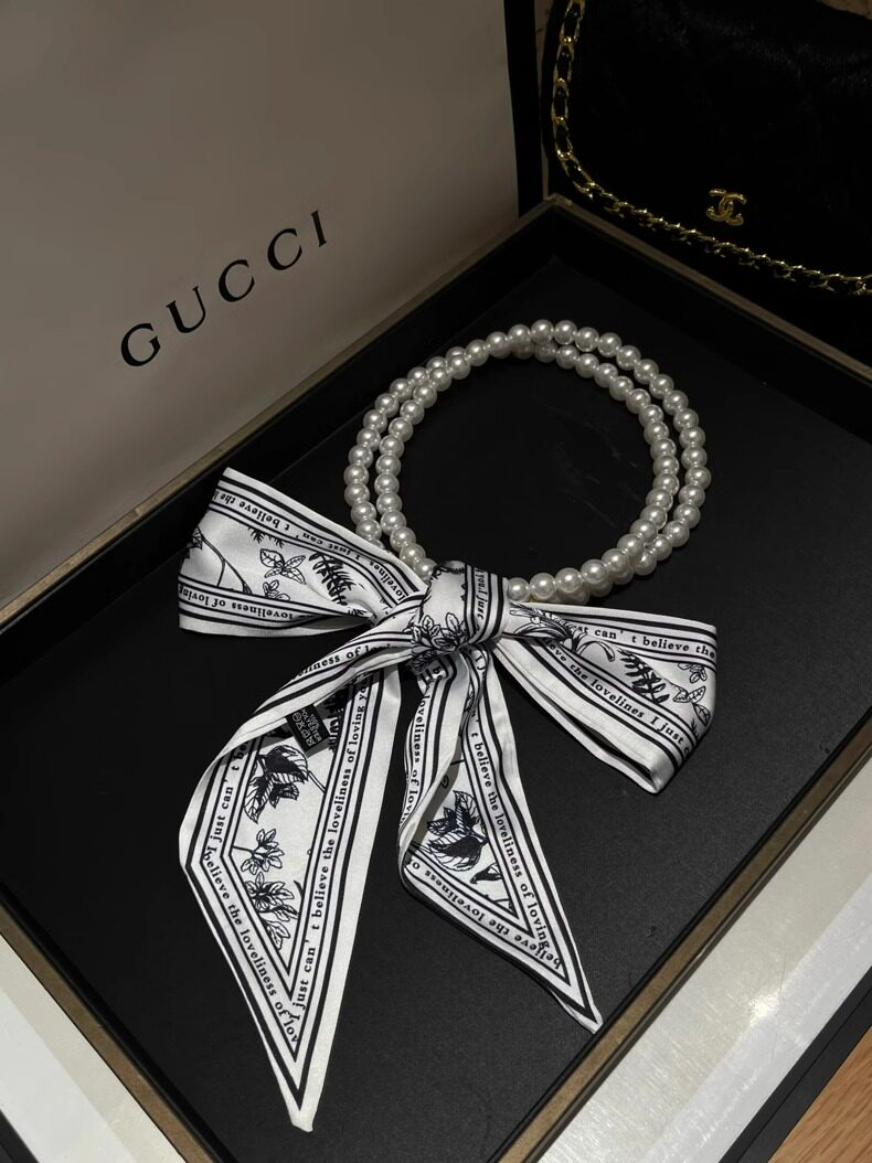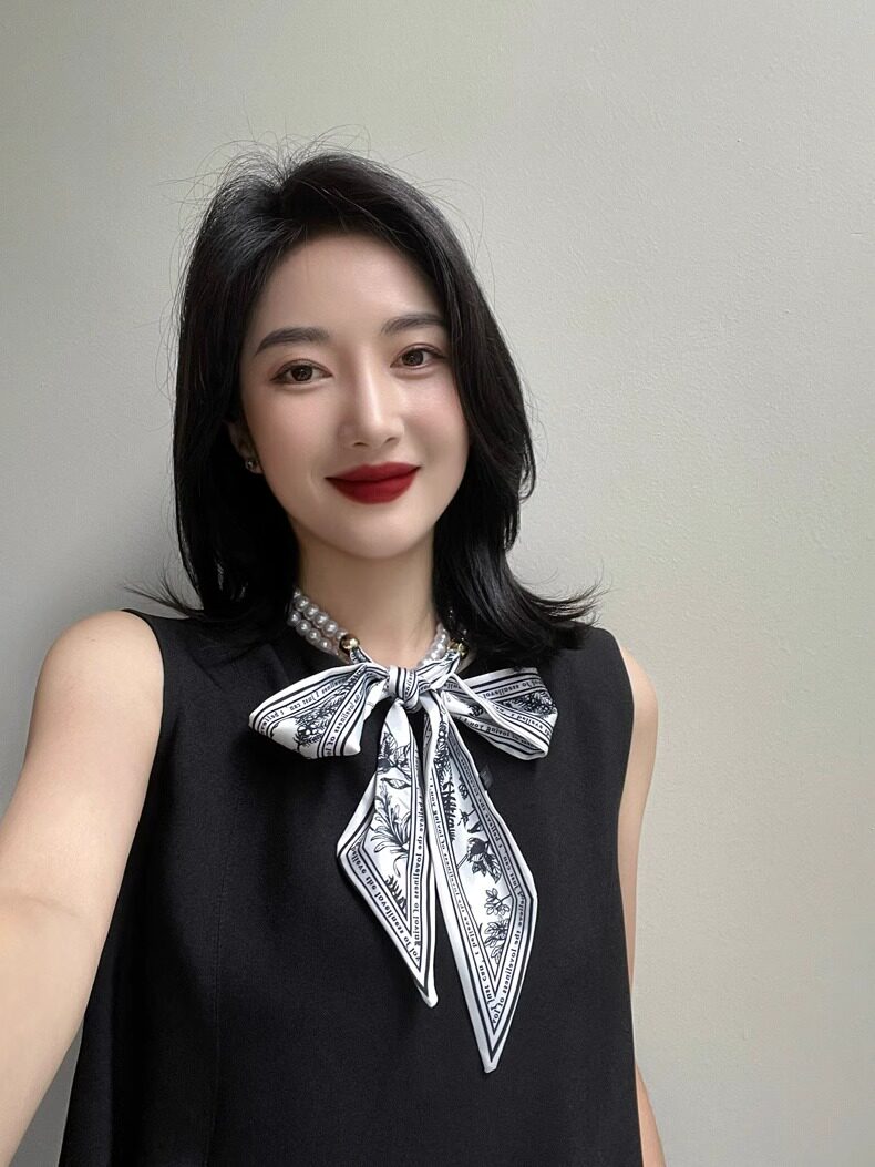 French Retro Spring and Summer Pearl Necklace Silk Scarf Women's Clavicle Chain Ribbon Korean Style Decorative Hair Tie Small Scarf Streamer