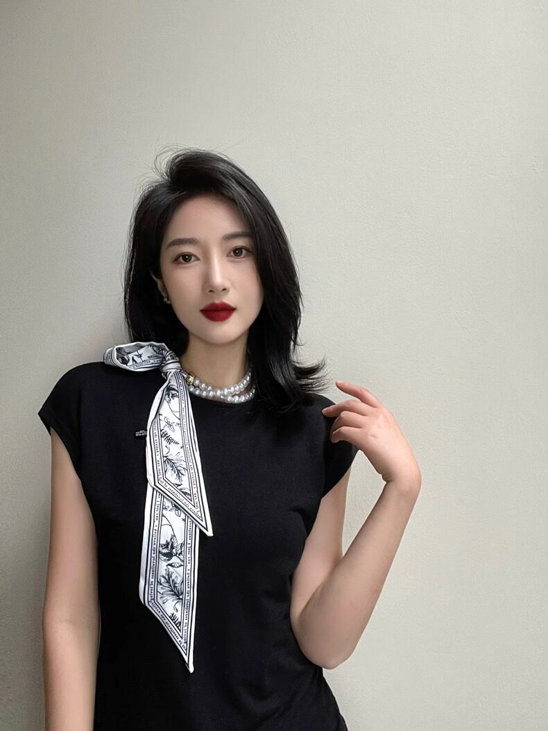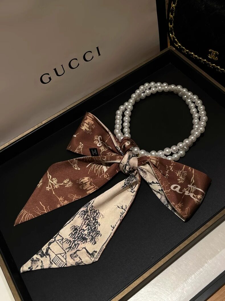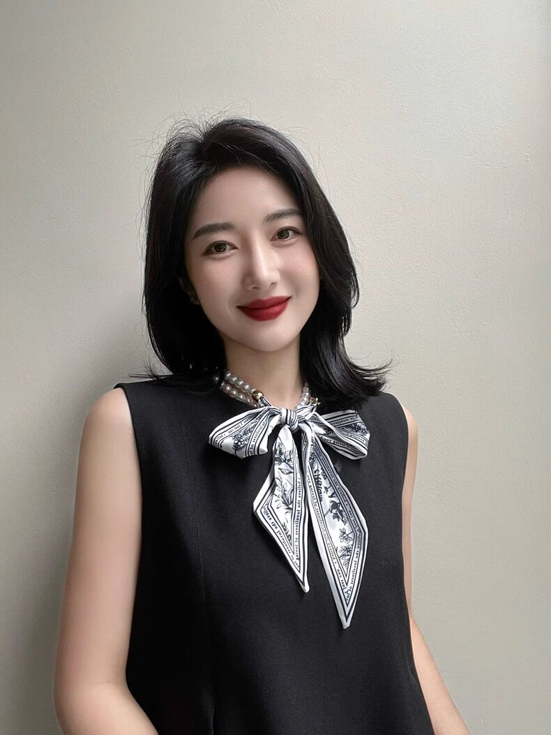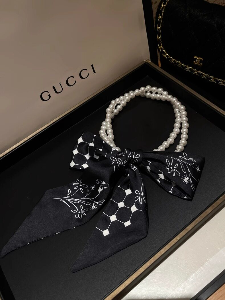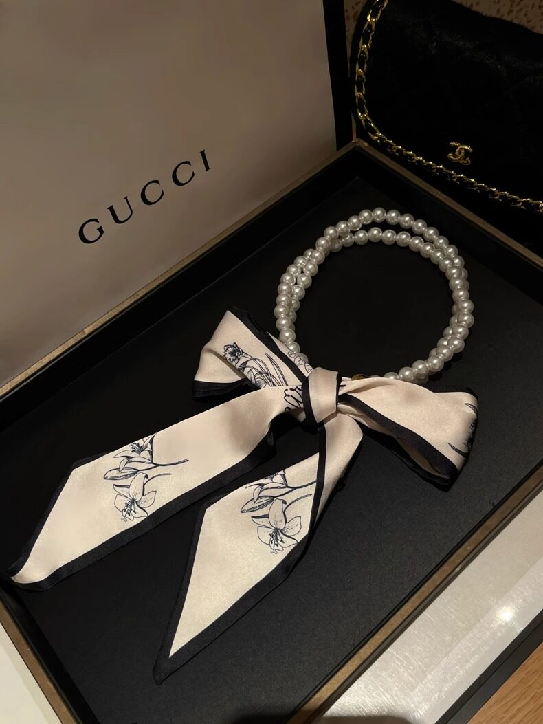 French Retro Spring and Summer Pearl Necklace Silk Scarf Women's Clavicle Chain Ribbon Korean Style Decorative Hair Tie Small Scarf Streamer