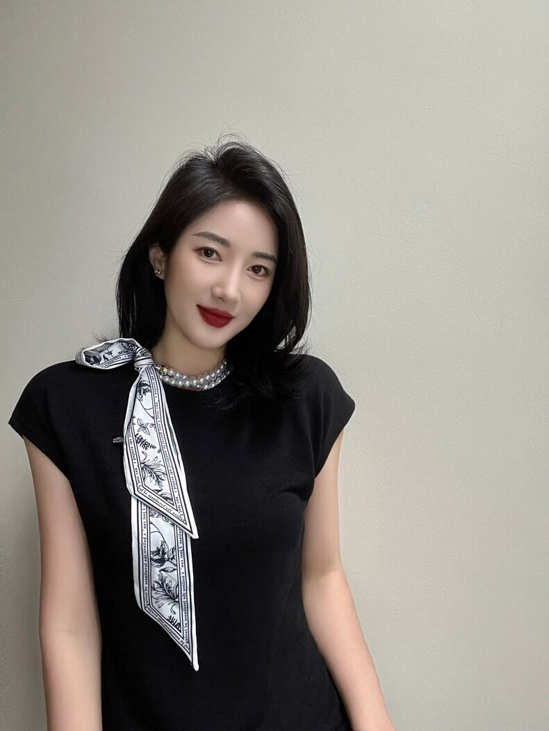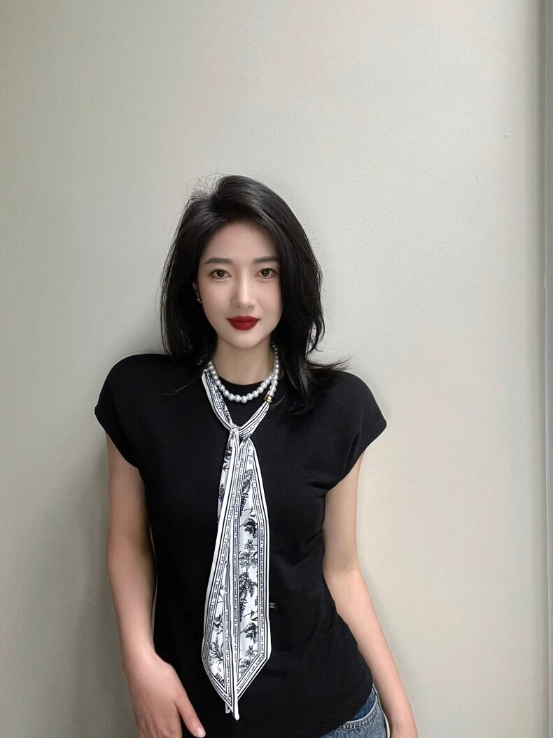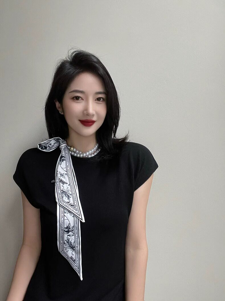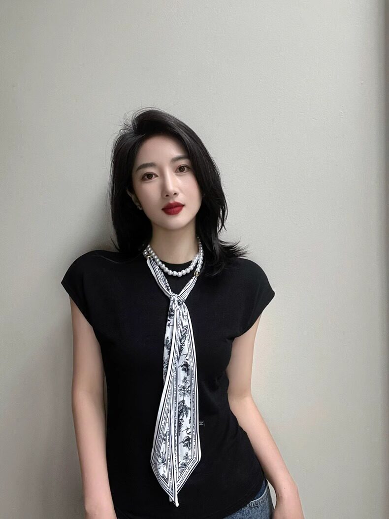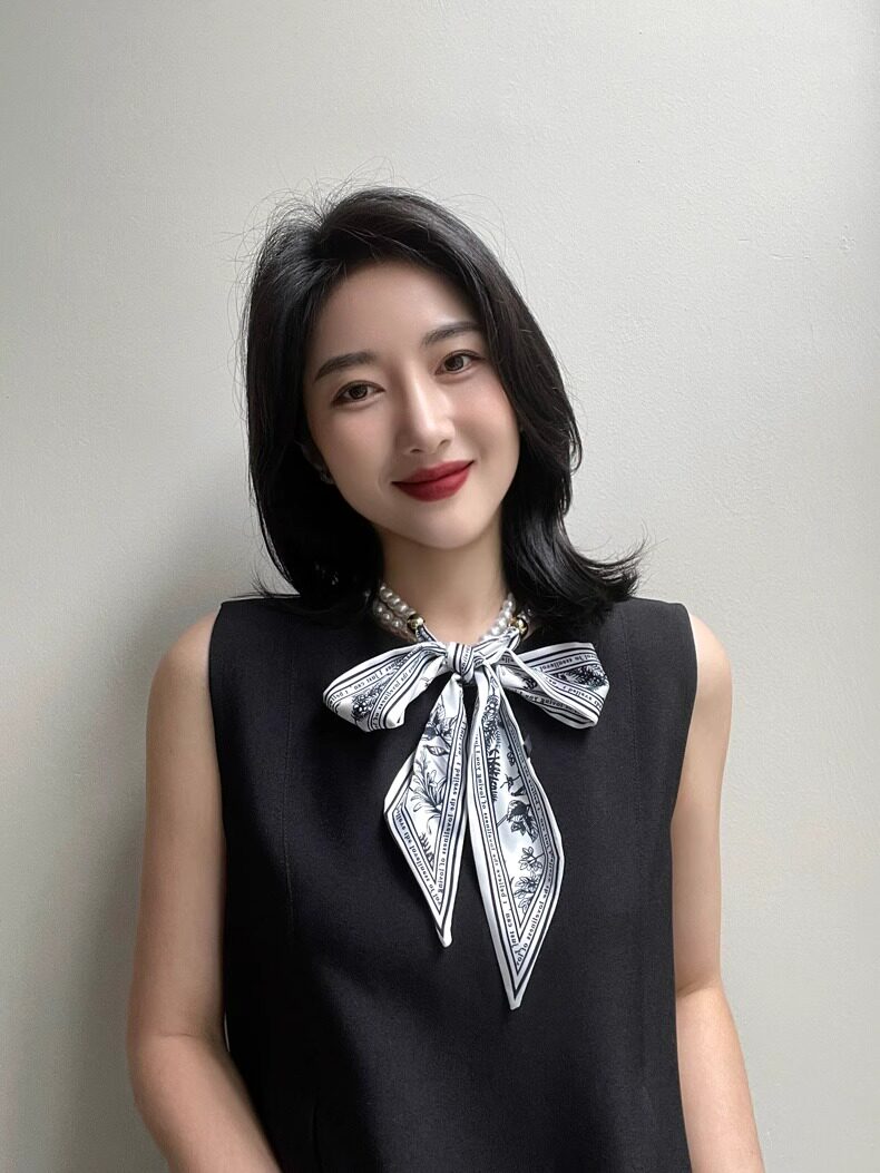French Retro Spring and Summer Pearl Necklace Silk Scarf Women's Clavicle Chain Ribbon Korean Style Decorative Hair Tie Small Scarf Streamer