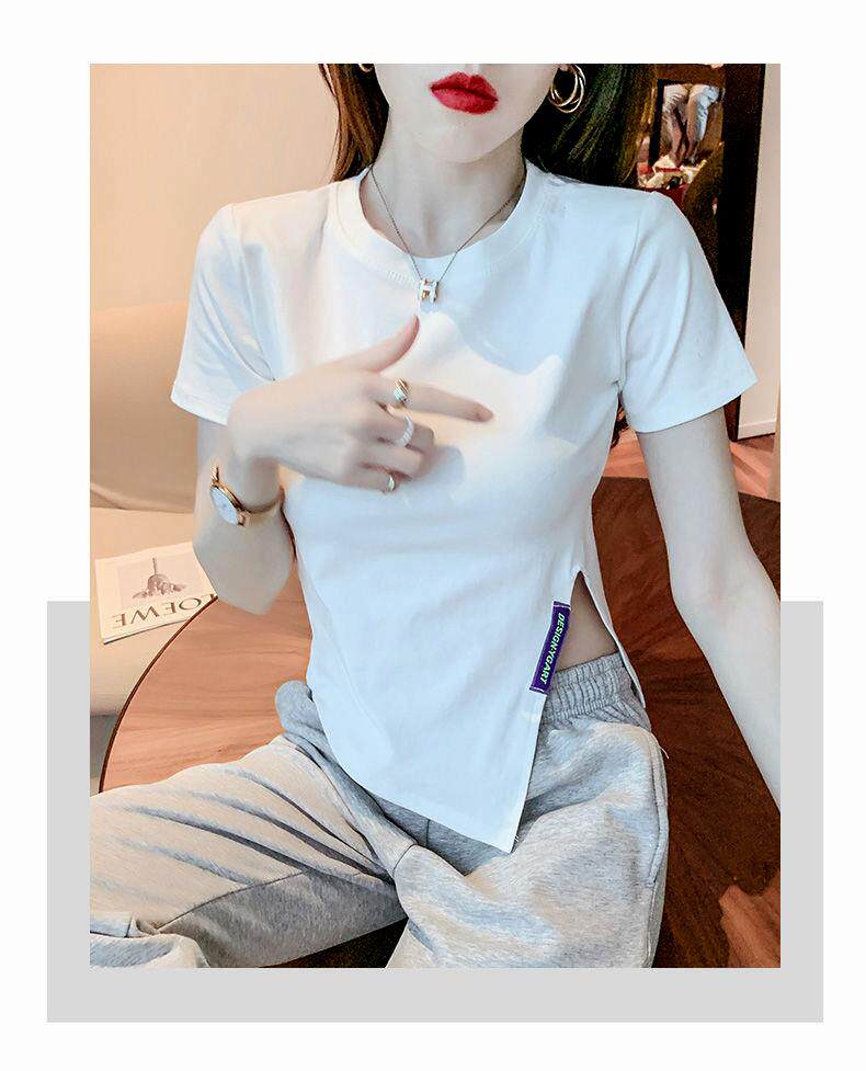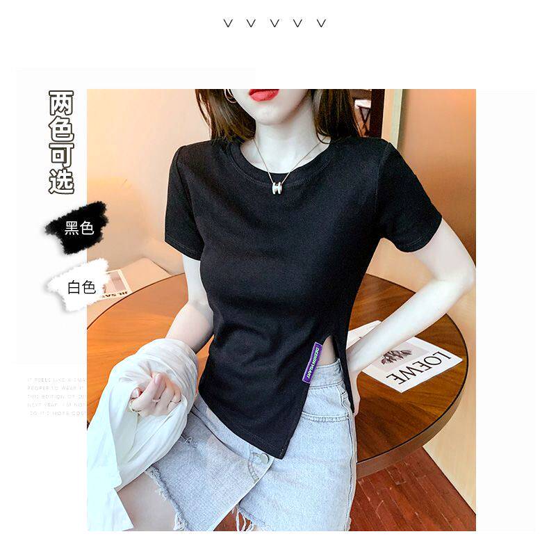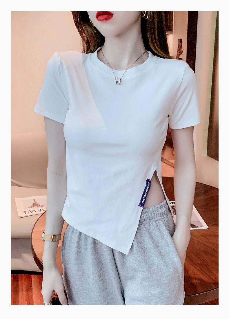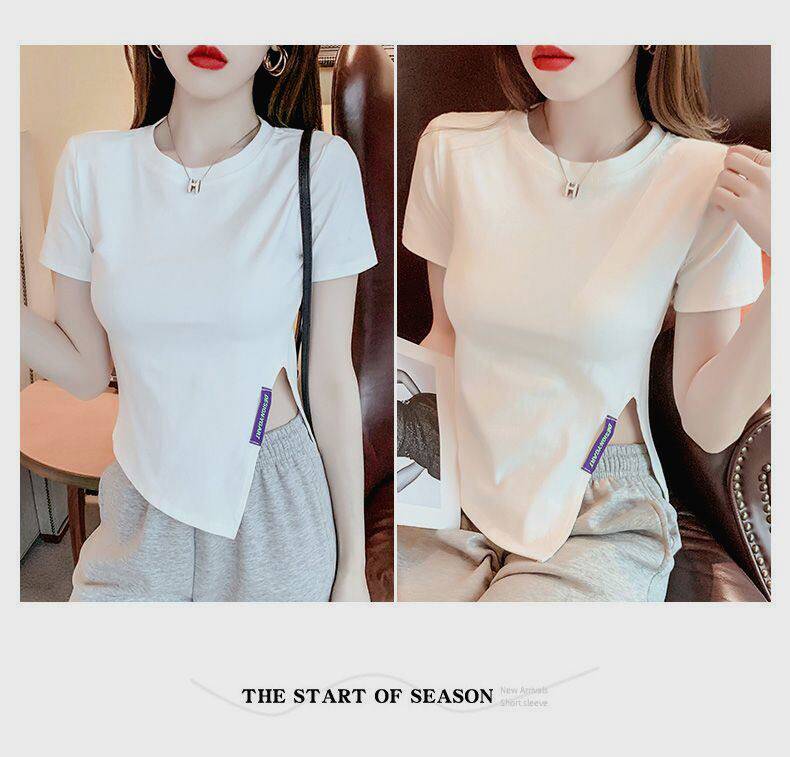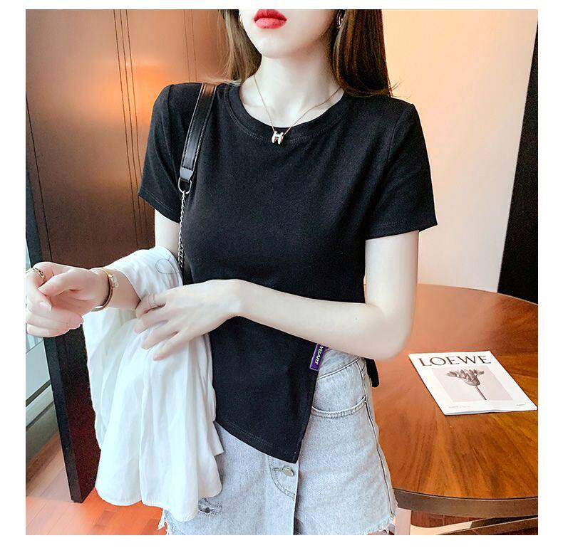 Irregular Short-Sleeved T-Shirt Base Shirt for Women, New Summer Style, Loose and Slimming, Pure and Desirable Design with Slit Top for Women
