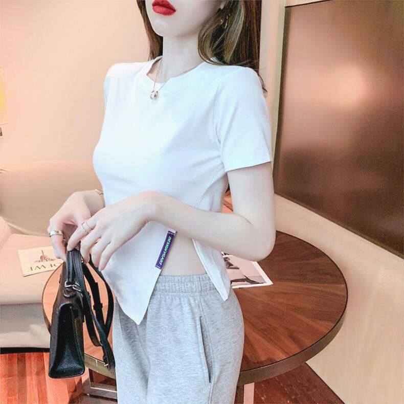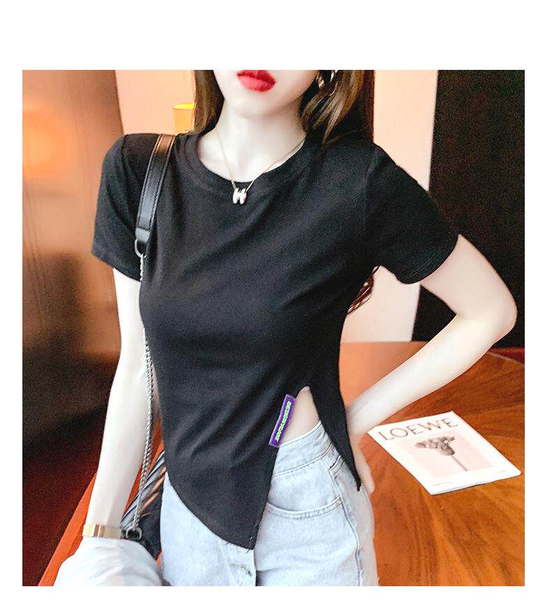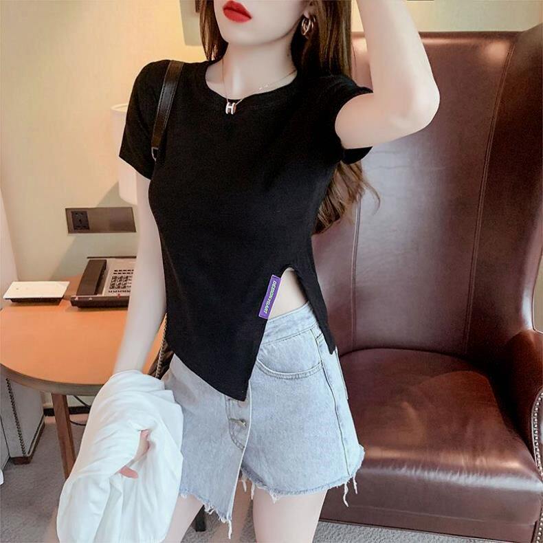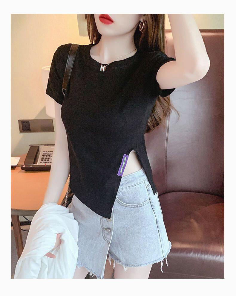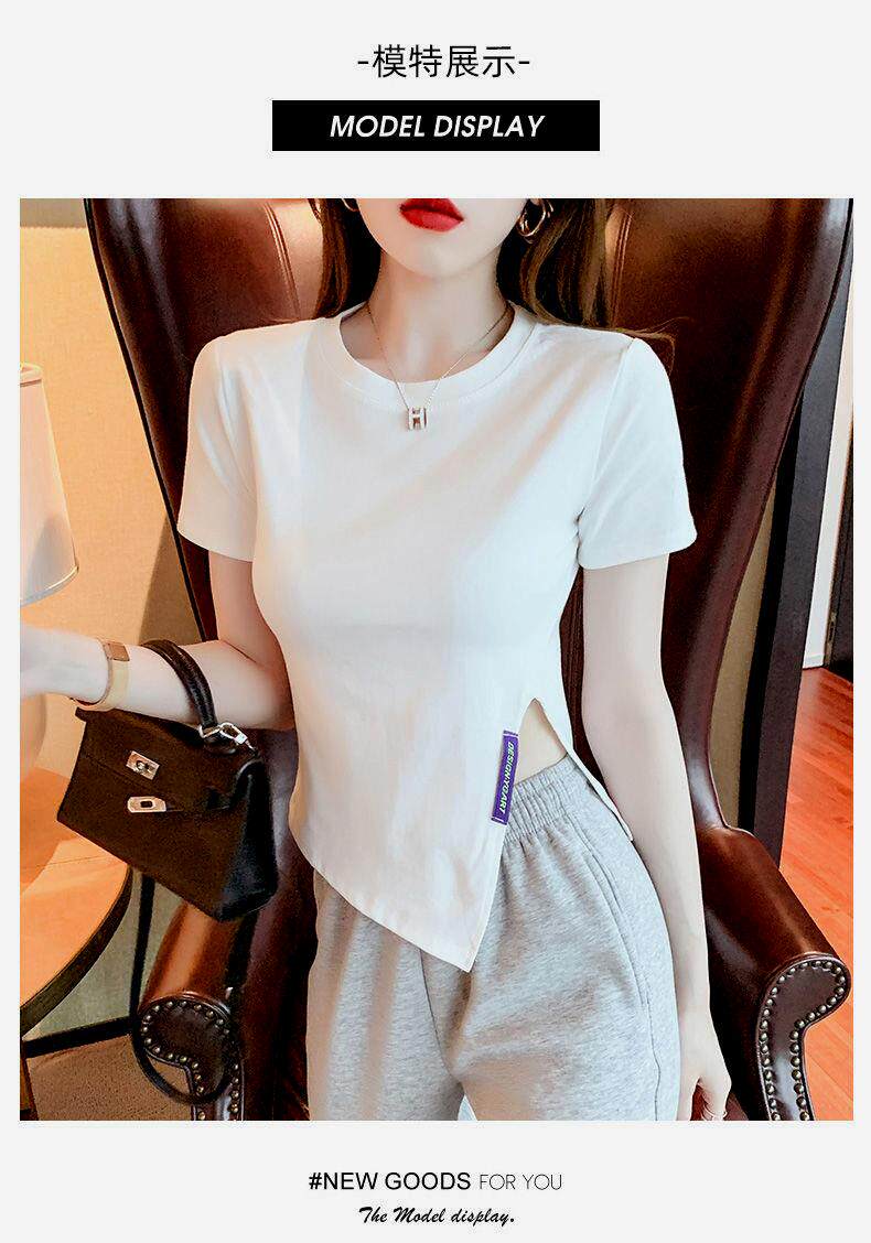 Irregular Short-Sleeved T-Shirt Base Shirt for Women, New Summer Style, Loose and Slimming, Pure and Desirable Design with Slit Top for Women