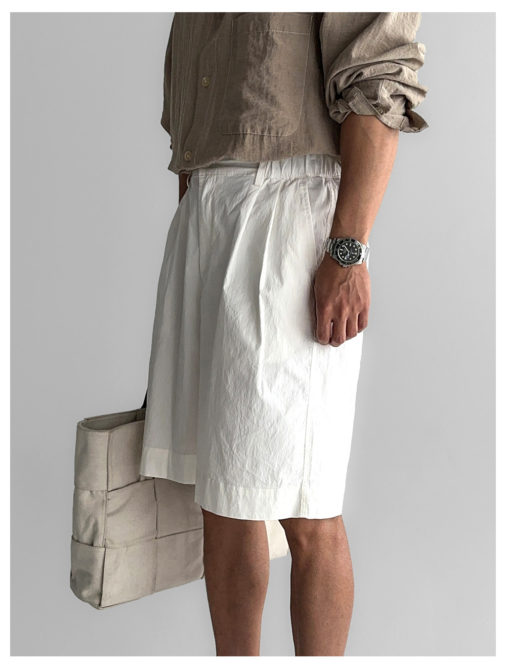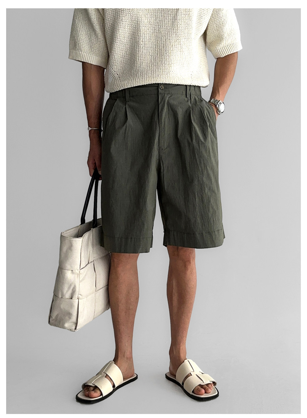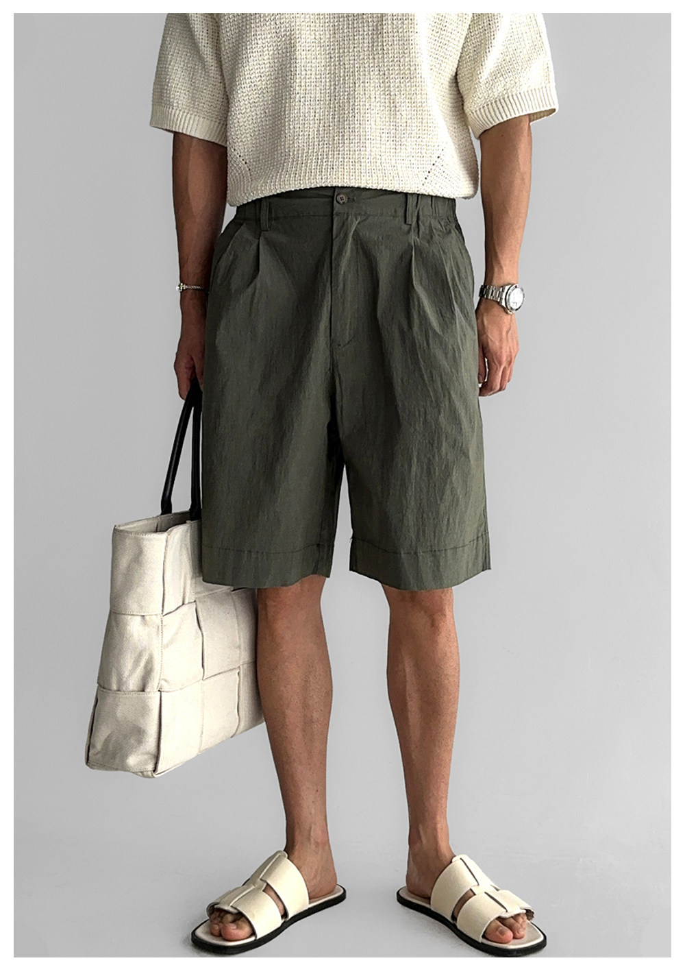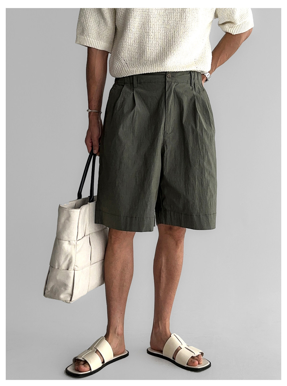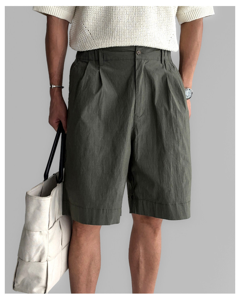 American Retro Elastic Waist Shorts for Men, Summer Nylon Double Pleated Straight Wide-Leg Knee-Length Casual Pants