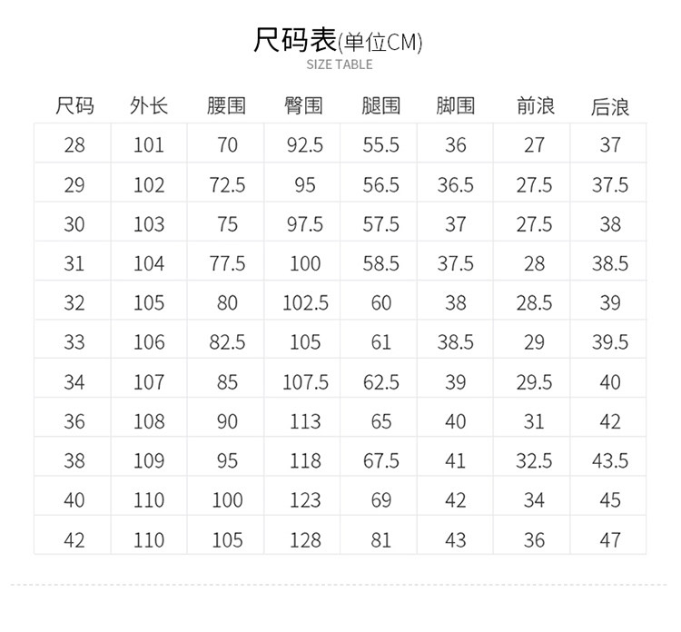 Outseam (cm) 99 cm 101.5 cm 104 cm 106.5 cm 109 cm