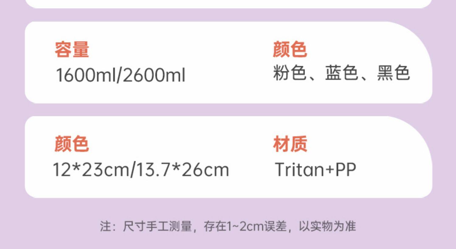 Color Classification Pink 1600ml [Maternal and Infant Product Grade Tritan Material Does Not Contain Bpa],Black 1600ml [Maternal and Infant Product Grade Tritan Material Does Not Contain Bpa],Blue 1600ml [Maternal and Infant Product Grade Tritan Material Does Not Contain Bpa],Pink 2600ml [Maternal and Infant Product Grade Tritan Material Does Not Contain Bpa],Black 2600ml [Maternal and Infant Product Grade Tritan Material Does Not Contain Bpa],Blue 2600ml [Maternal and Infant Product Grade Tritan Material Does Not Contain Bpa]