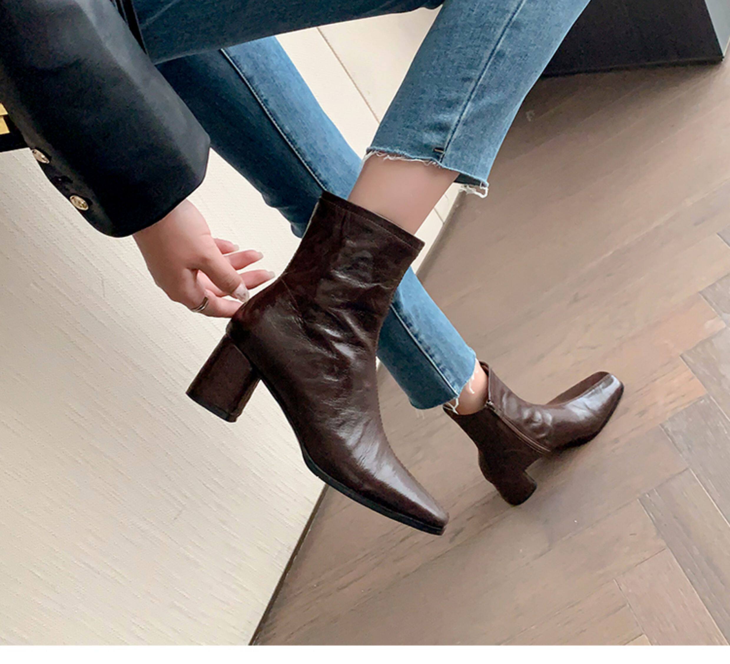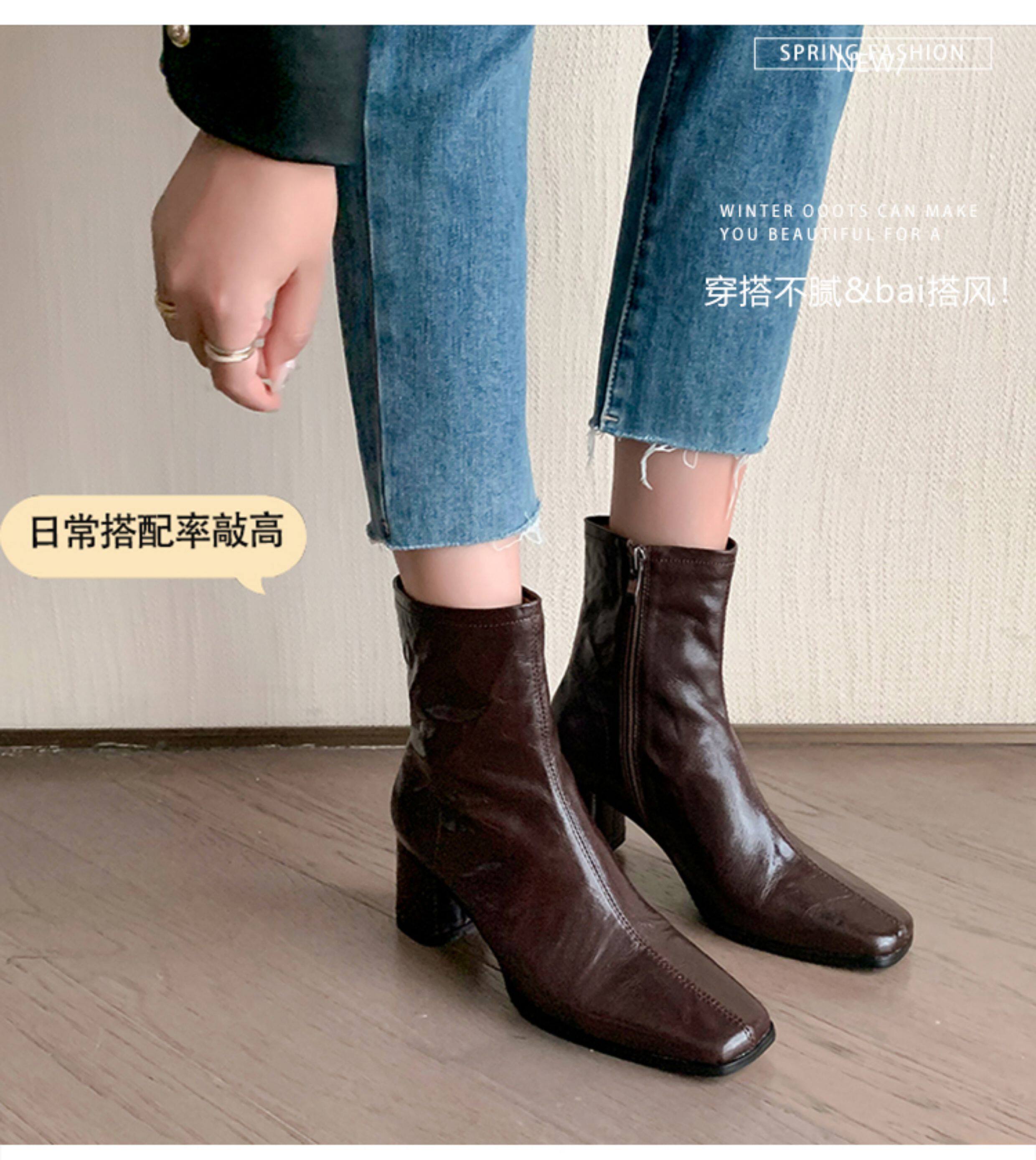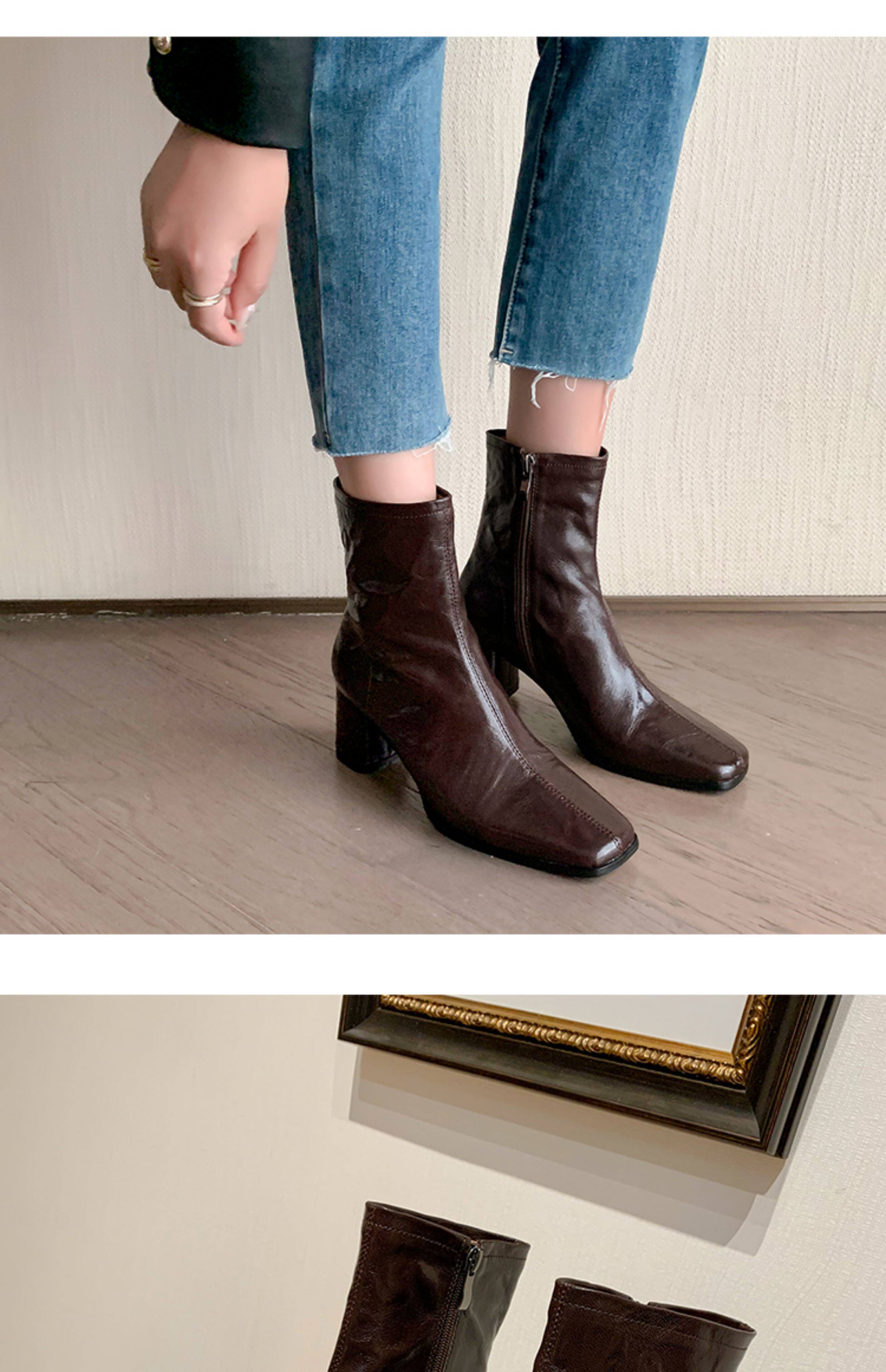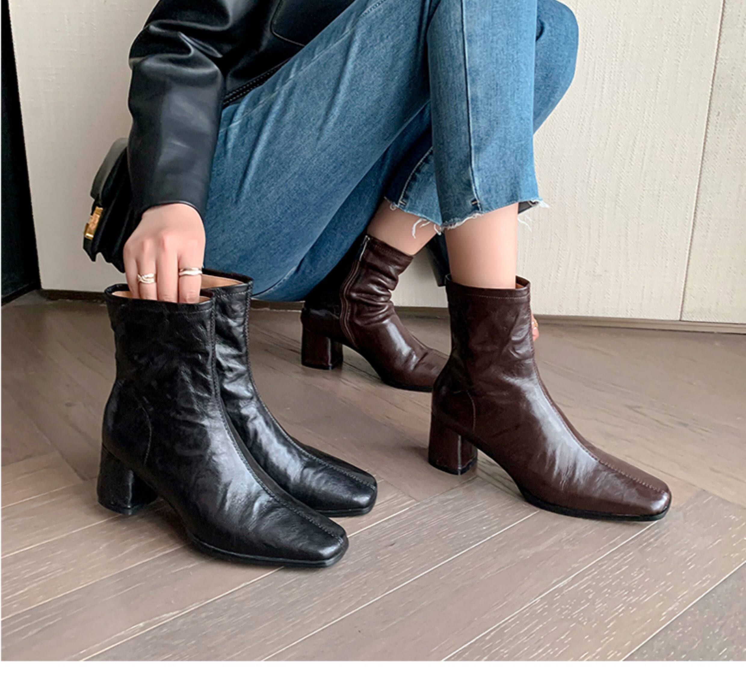 Genuine Leather Chunky Heel Short Boots for Women, Square Toe, 2025 New Spring and Autumn Single Boots, Retro High-Heeled Martin Boots, Chelsea Slim Boots