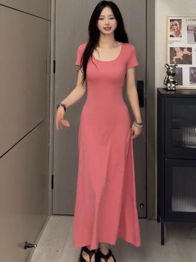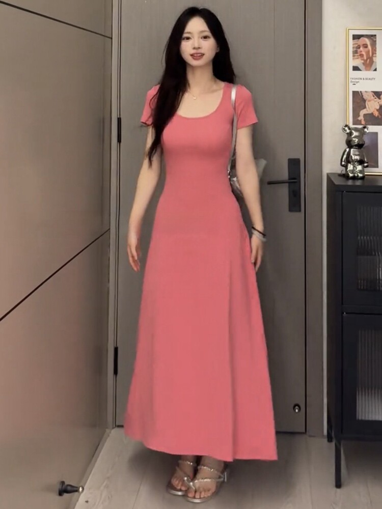 Elegant French-Style Short-Sleeved Summer 2024 New Pink Dress for Women, High-End Long Dress, Waist-Cinching, Slimming A-Line Skirt