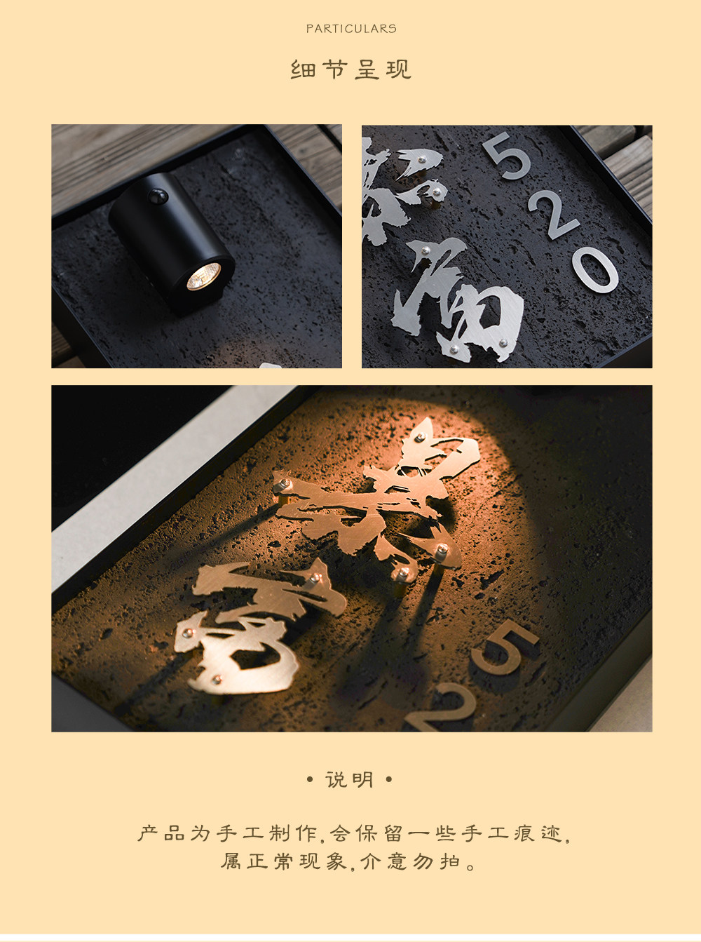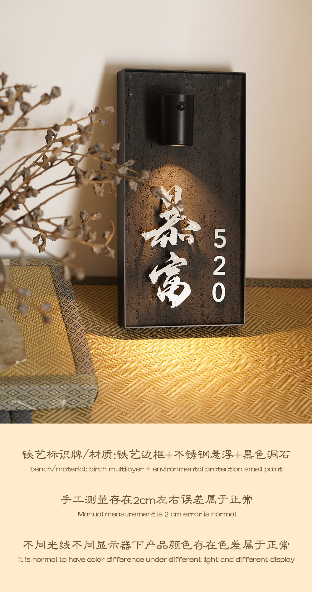 Sort by color Main image size 40*20cm travertine rock slab + stainless steel suspended characters + sensor light,Custom size Consult customer service