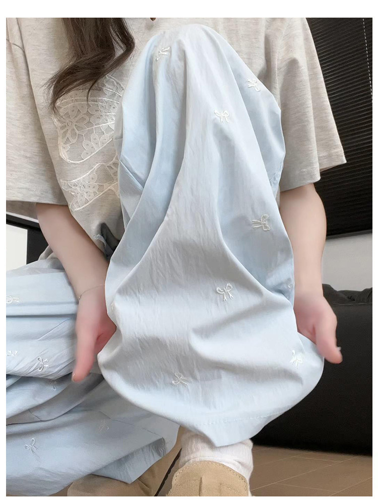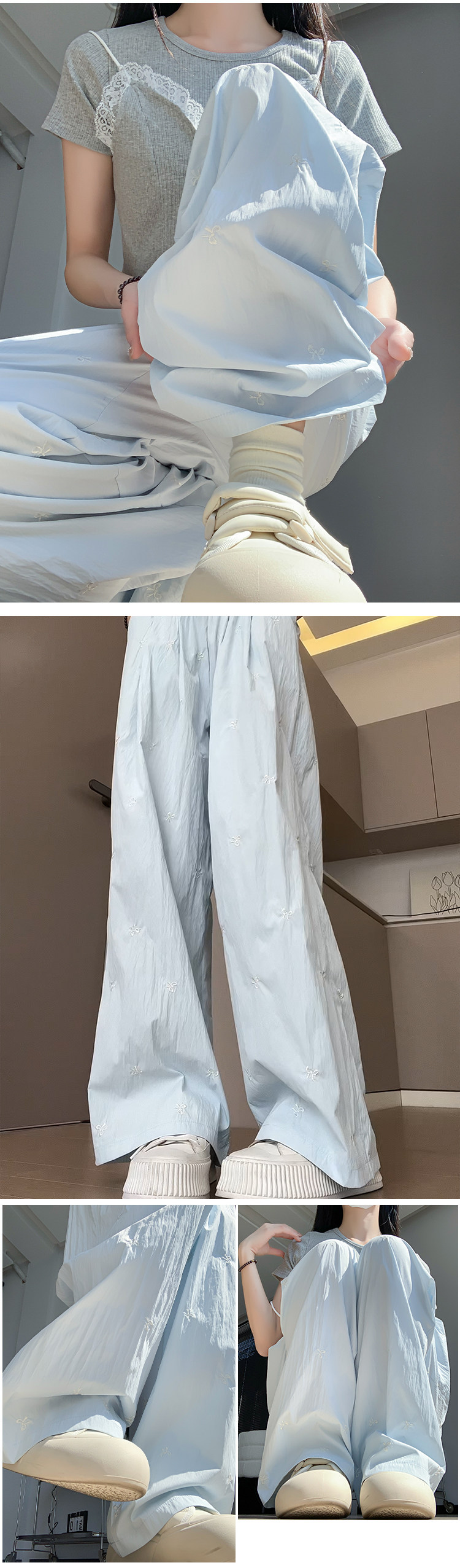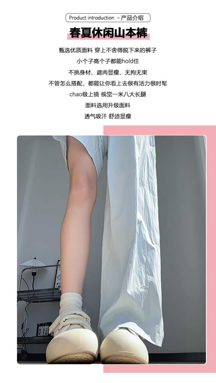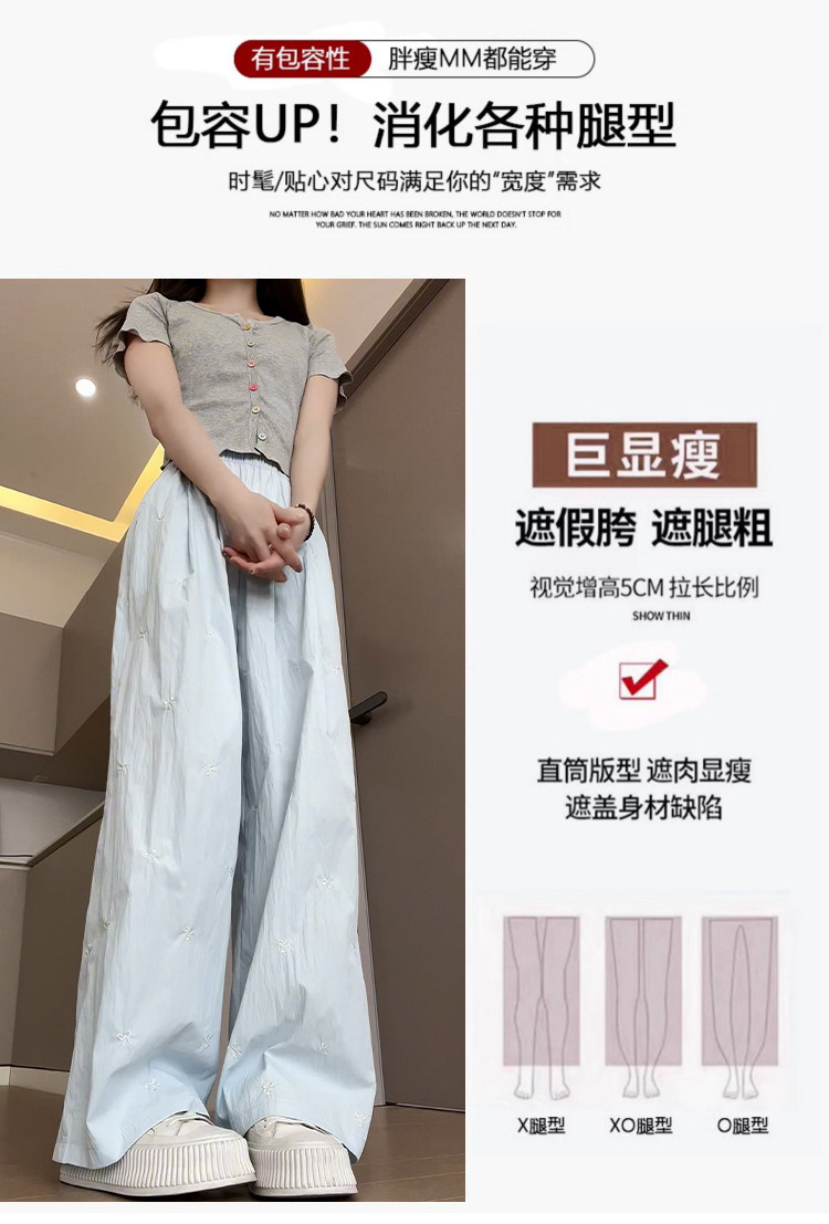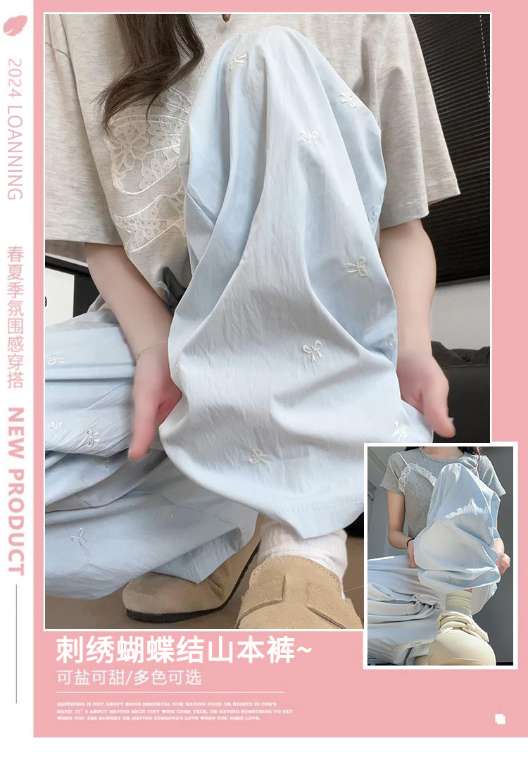 Blue embroidered bow ice silk Yamamoto pants for women summer thin 2024 new casual walking wide leg pants for small people