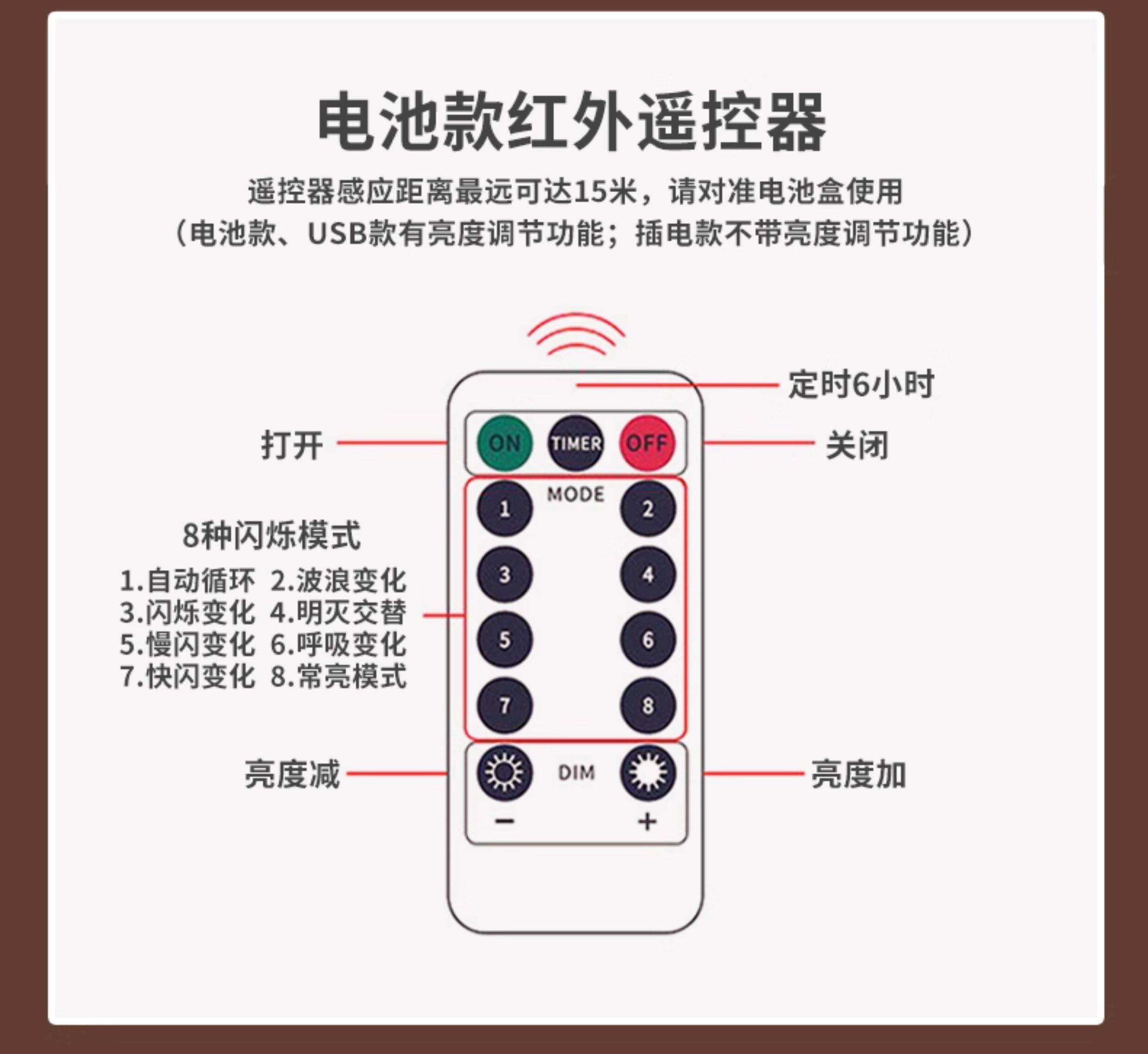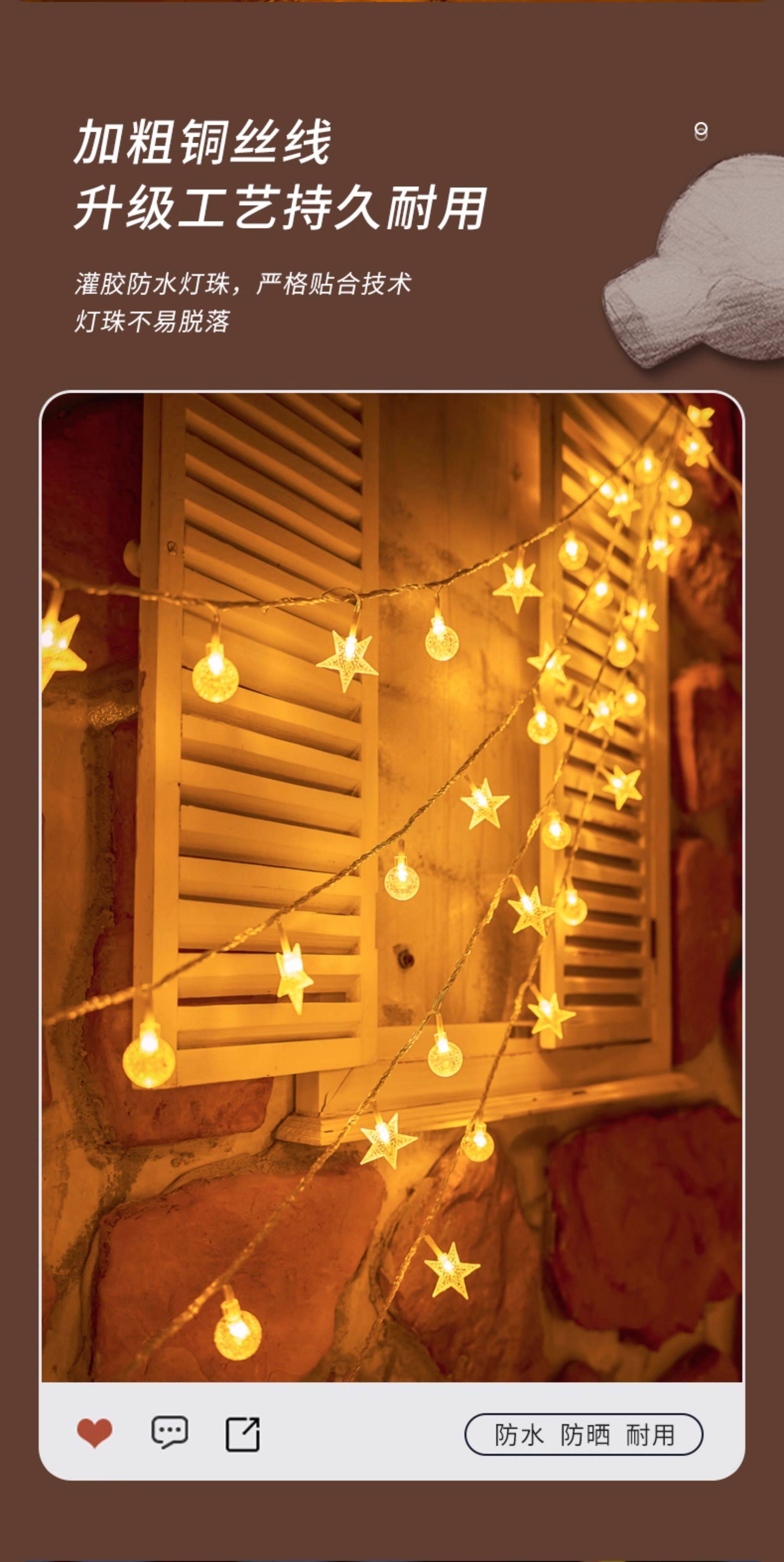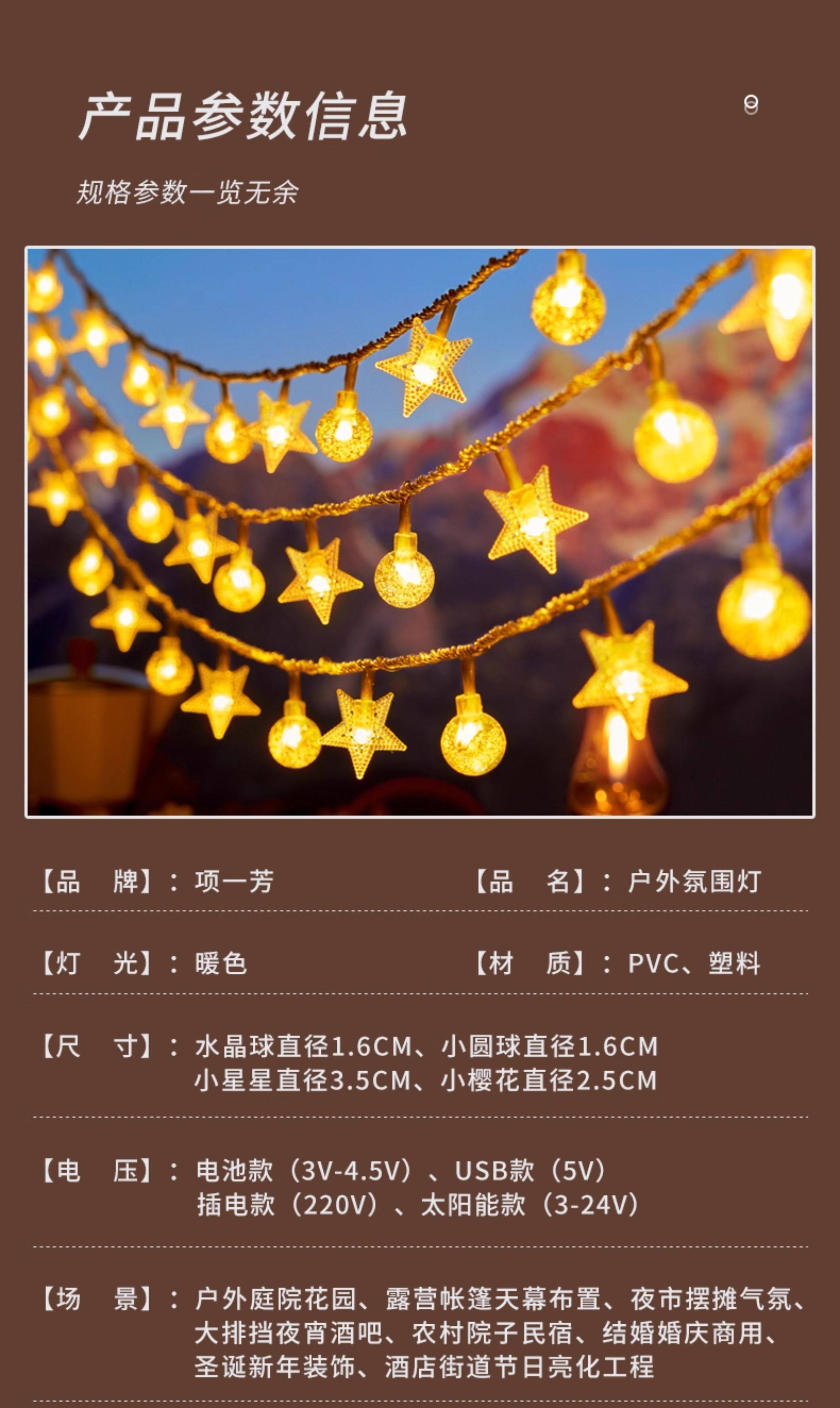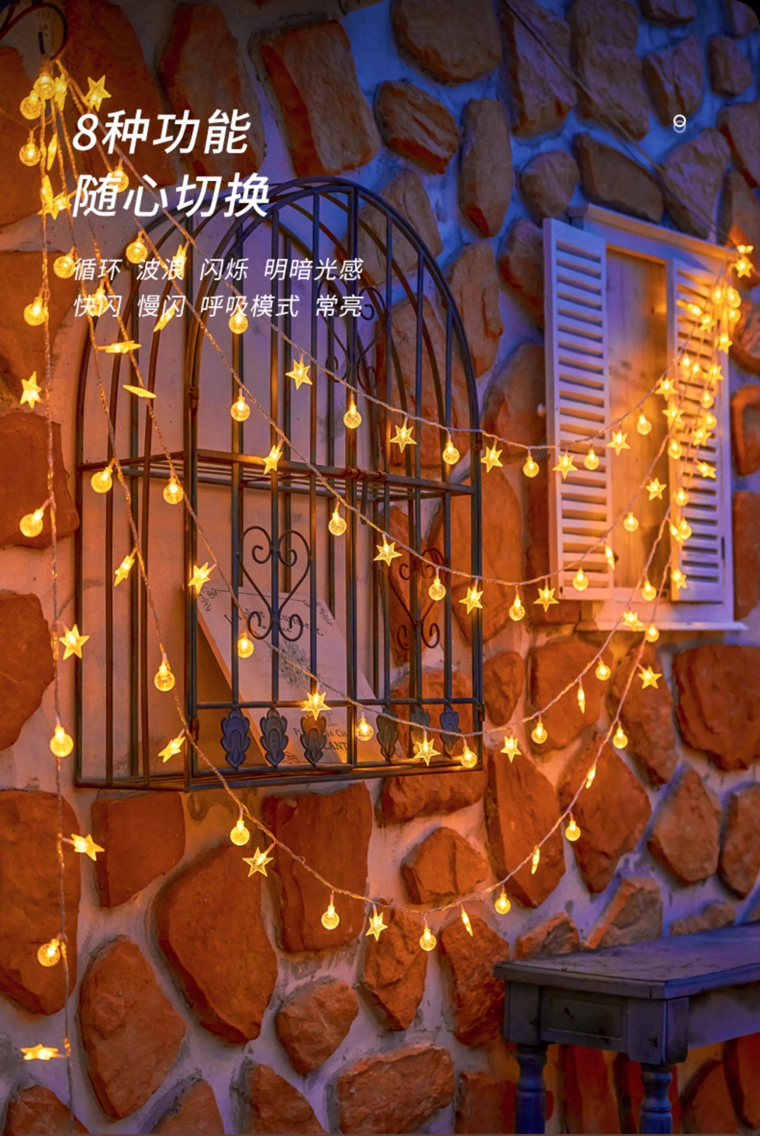 Length Battery model 3 meters 20 lights always on,USB type 3m 20 light always on,Battery model 6 meters 40 lights flashing,USB type 6m 40 light always on,Battery type 10m 80 lights camping canopy tent decoration flashing,Remote control battery model 6 meters 40 lights 8 flash mode,Remote control USB type 6m 40 lamp night market street lamp 8 flash mode,Remote control plug-in model 6 meters 40 lights 8 flash mode,Remote control battery model 10 meters 80 lights 8 flash mode,Remote control USB type 10 meters 80 lights stall car light string 8 flash mode,Remote control plug-in model 10 meters 80 lights 8 flash mode,Plug-in model 10 meters, 100 lights, high brightness, 8 flash mode,Plug-in model, 20 meters, 200 lights, high brightness, 8 flash mode,Plug-in model 30 meters 300 lights high brightness 8 flash mode,Plug-in model 50 meters 400 lights memory controller 8 flash mode,Plug-in model 100 meters 800 lights waterproof male and female interface 8 flash mode,Plug-in model 150 meters 1200 lights can be used in series 8 flash mode,Plug-in model 200 meters 1600 lights flash mode can be synchronized 8 flash mode,Plug-in model 300 meters 2400 lights wedding decoration 8 flash mode,Remote control plug-in model 100 meters 800 lights 8 flash mode,Remote control plug-in model 150 meters 1200 lights 8 flash mode,Remote control plug-in model 200 meters 1600 lights farm river railing decoration 8 flash mode,Remote control plug-in model 300 meters 2400 lights stall market scene 8 flash mode,Outdoor solar 5m20 light, always on + flashing, black line,Outdoor solar 7m 50 light 8 flash mode black line,Outdoor solar 12 meters 100 lights 8 flash mode black line,Outdoor solar 22 meters 200 lights 8 flash mode black line,Outdoor solar 32m 300 lights 8 flash mode black line,Remote control solar charging 100 lights 10 meters large panel 2400 mAh,Remote control, solar charging, 200 lights at 20 meters, 72 hours standby life,Remote control, solar charging, 300 lights at 30 meters, supports USB interface charging on rainy days,Remote control solar charging 50 meters 400 lights the first choice for courtyard gardens and rural yards,Plug-in model, low voltage 24V, 100 lights per 10 meters, outdoor waterproof power supply,Plug-in model, low voltage 24V, 200 lights at 20 meters, 2-year worry-free warranty,Plug-in model, low voltage 24V, 30 meters, 300 lights, silver-plated environmentally friendly wire,Plug-in model, low voltage 24V, 50 meters, 400 lights, commercial advertising lighting