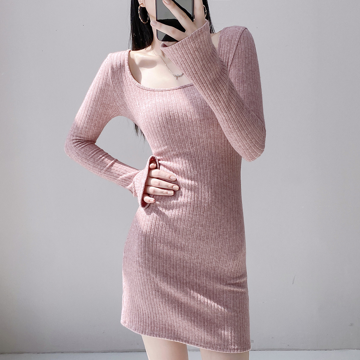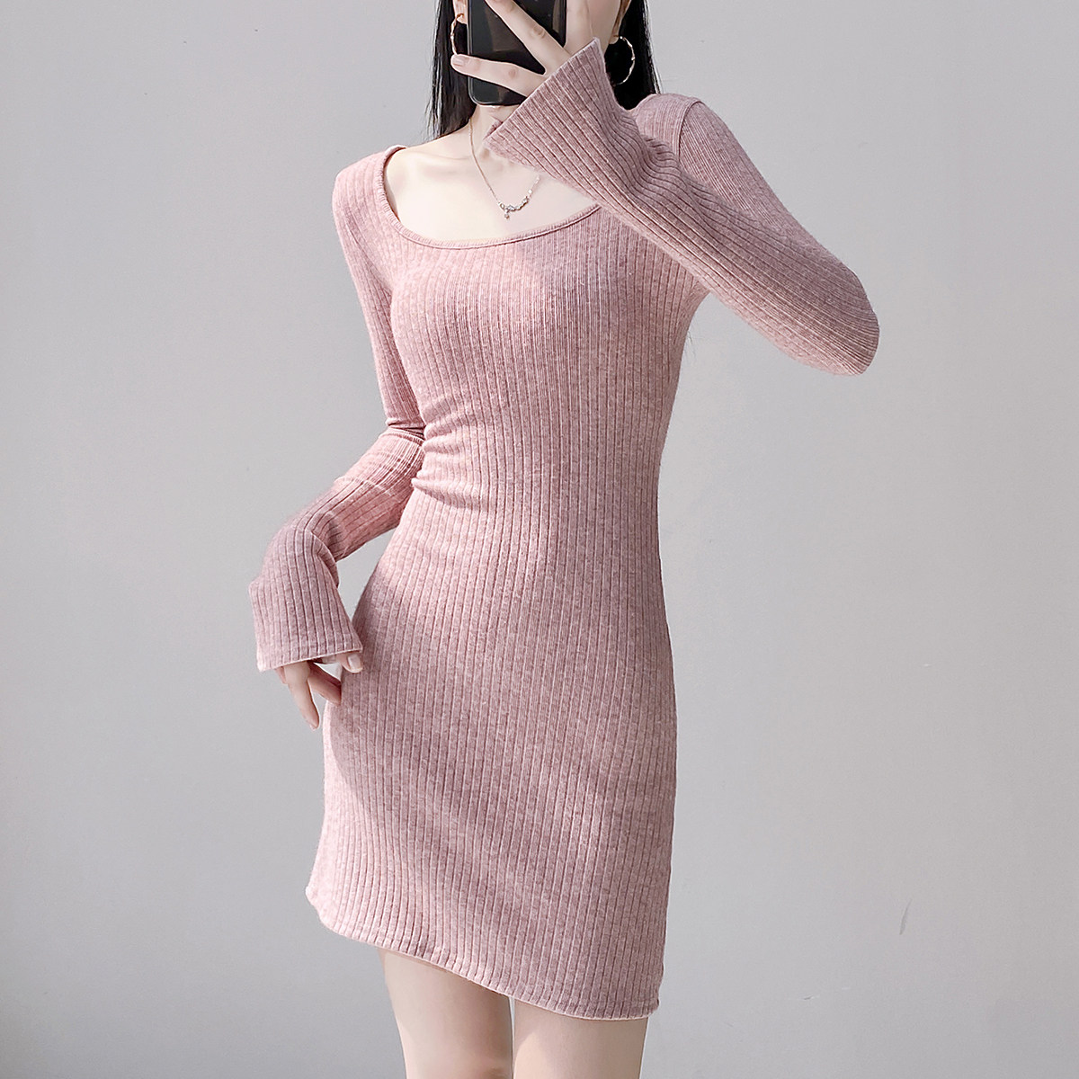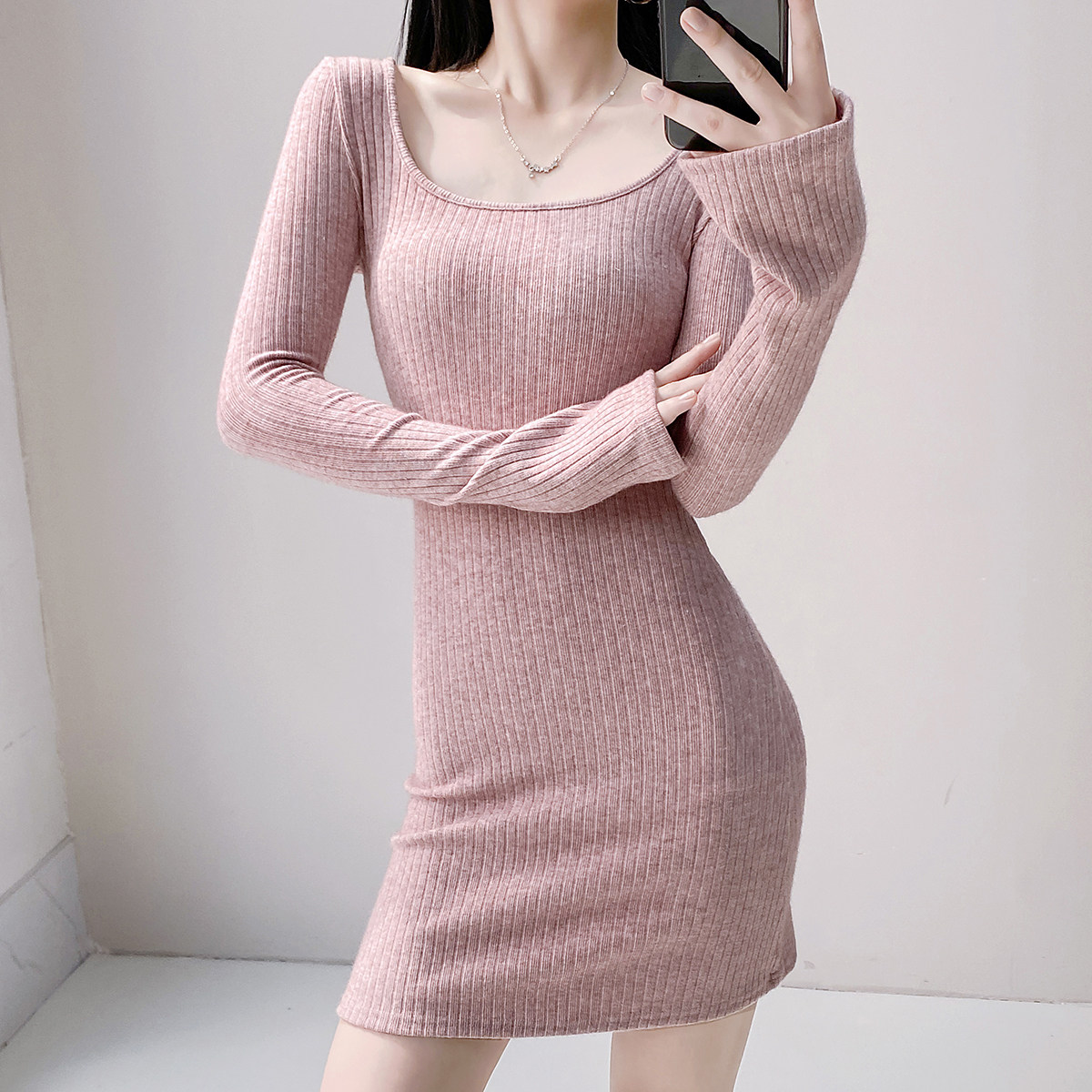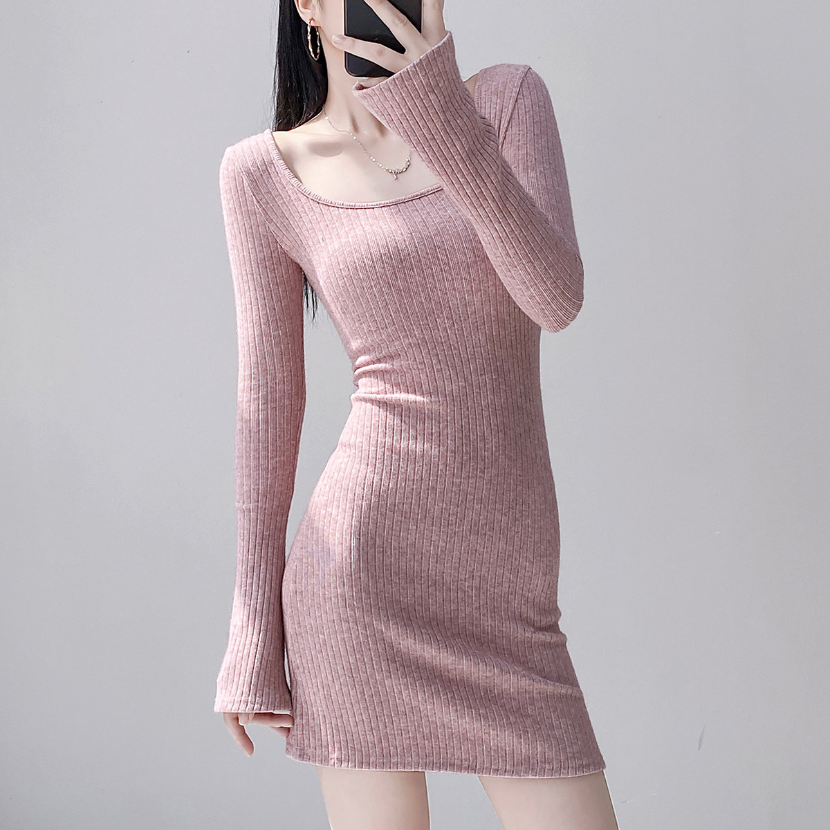Pure Desire Square Neck Long Sleeve Knitted Dress Female Waist Sexy Hip Skirt Slim Threaded Inner Bottoming Short Skirt