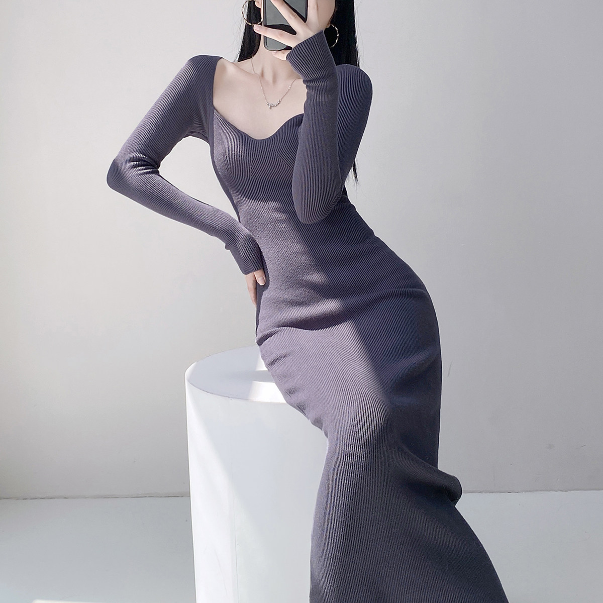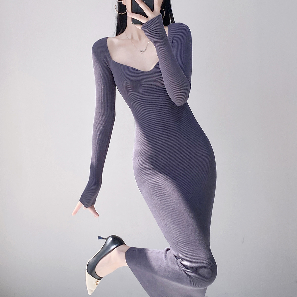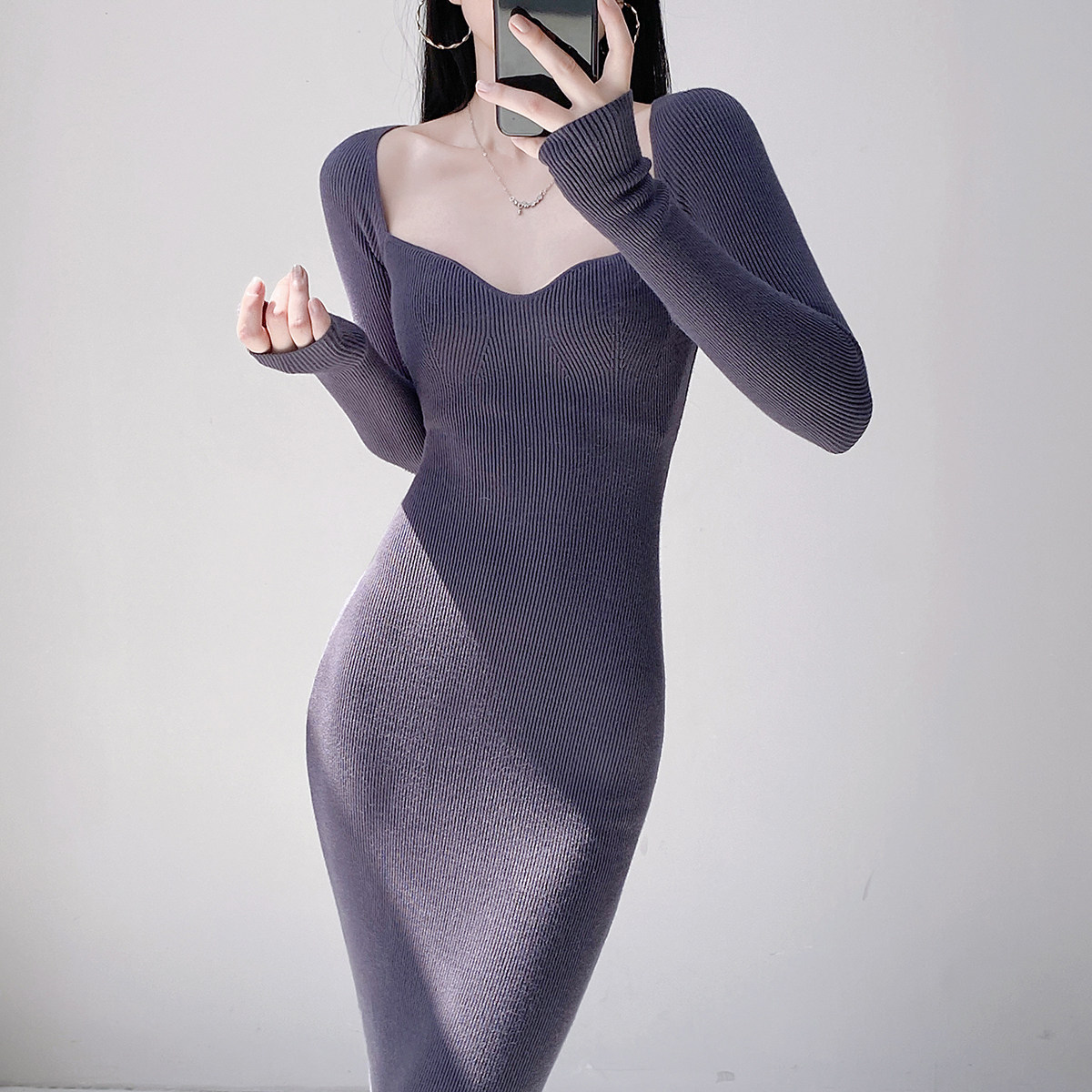 Square neck French sexy long-sleeved knitted dress for women with pure lust style, clavicle temperament, waist-slimming bottoming and hip-covering long skirt