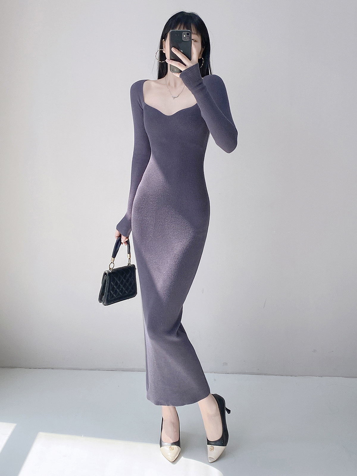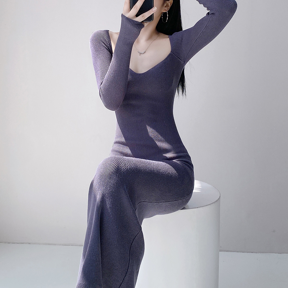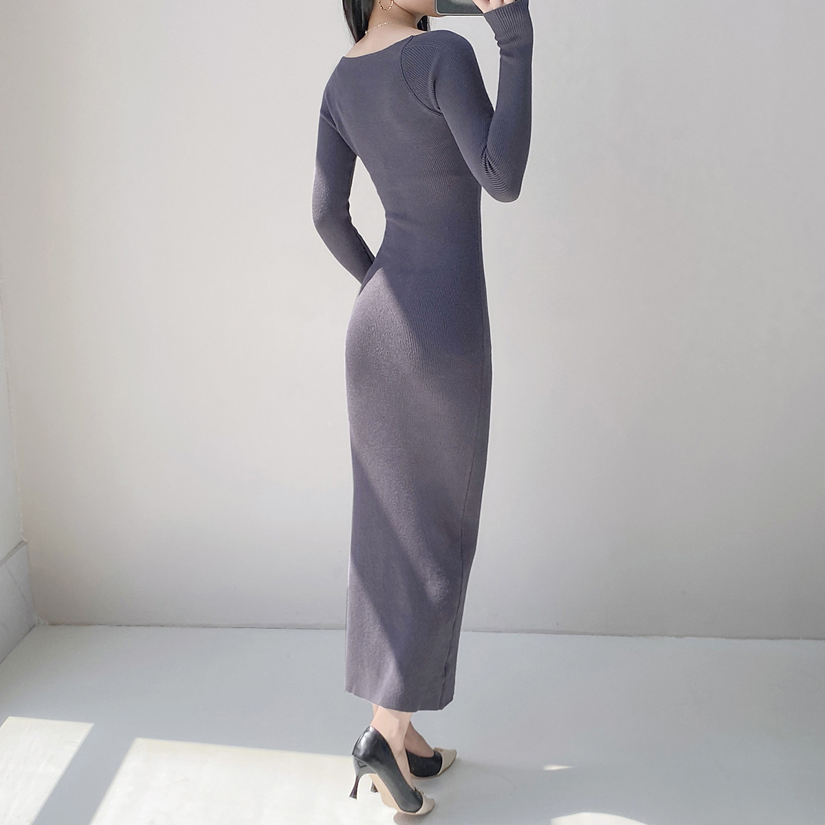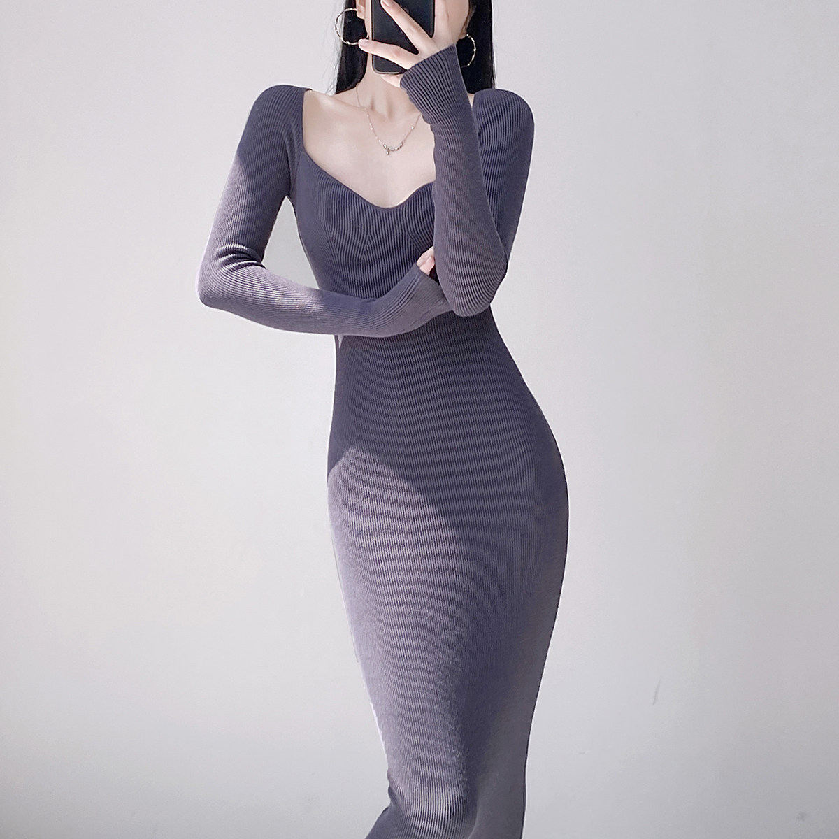 Square neck French sexy long-sleeved knitted dress for women with pure lust style, clavicle temperament, waist-slimming bottoming and hip-covering long skirt