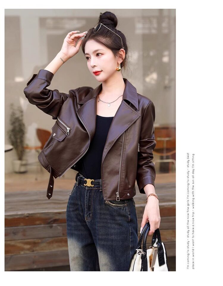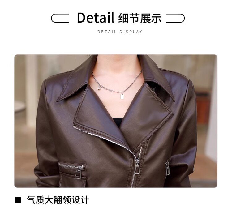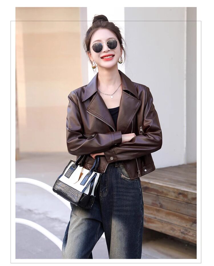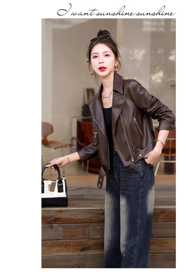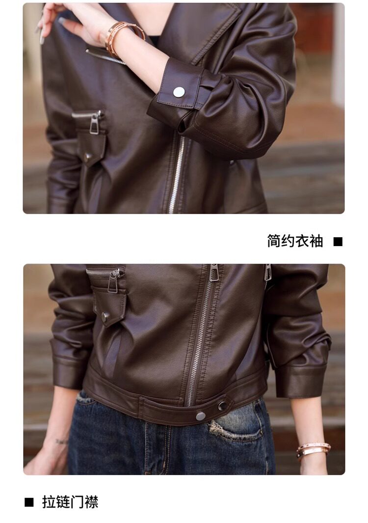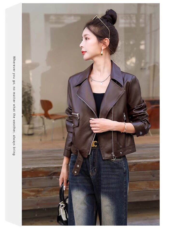 2025 New Autumn and Winter Leather Jacket Women's Short Motorcycle Brown High-Quality Velvet Thickened Small Leather Jacket