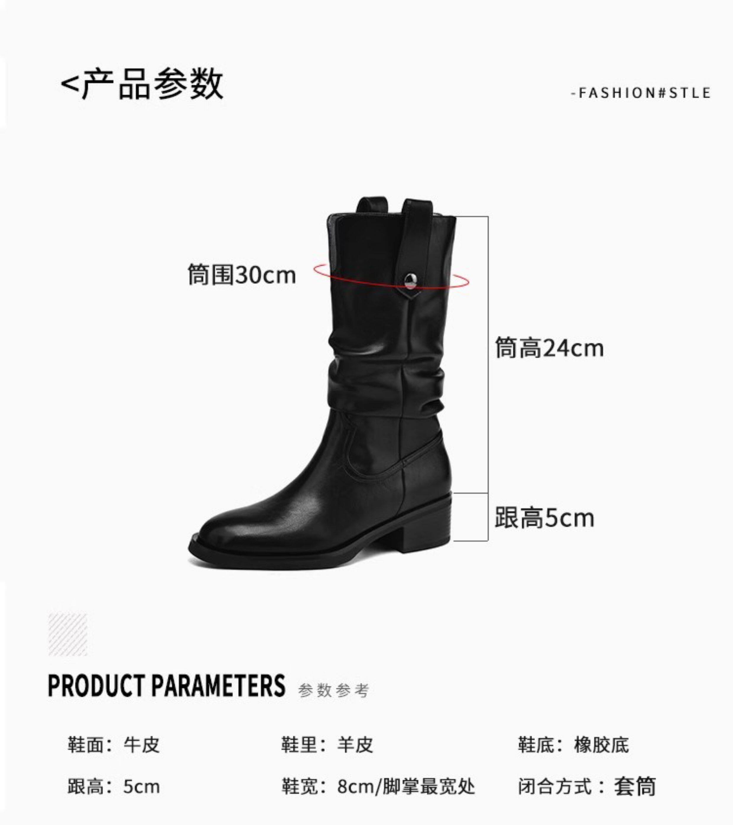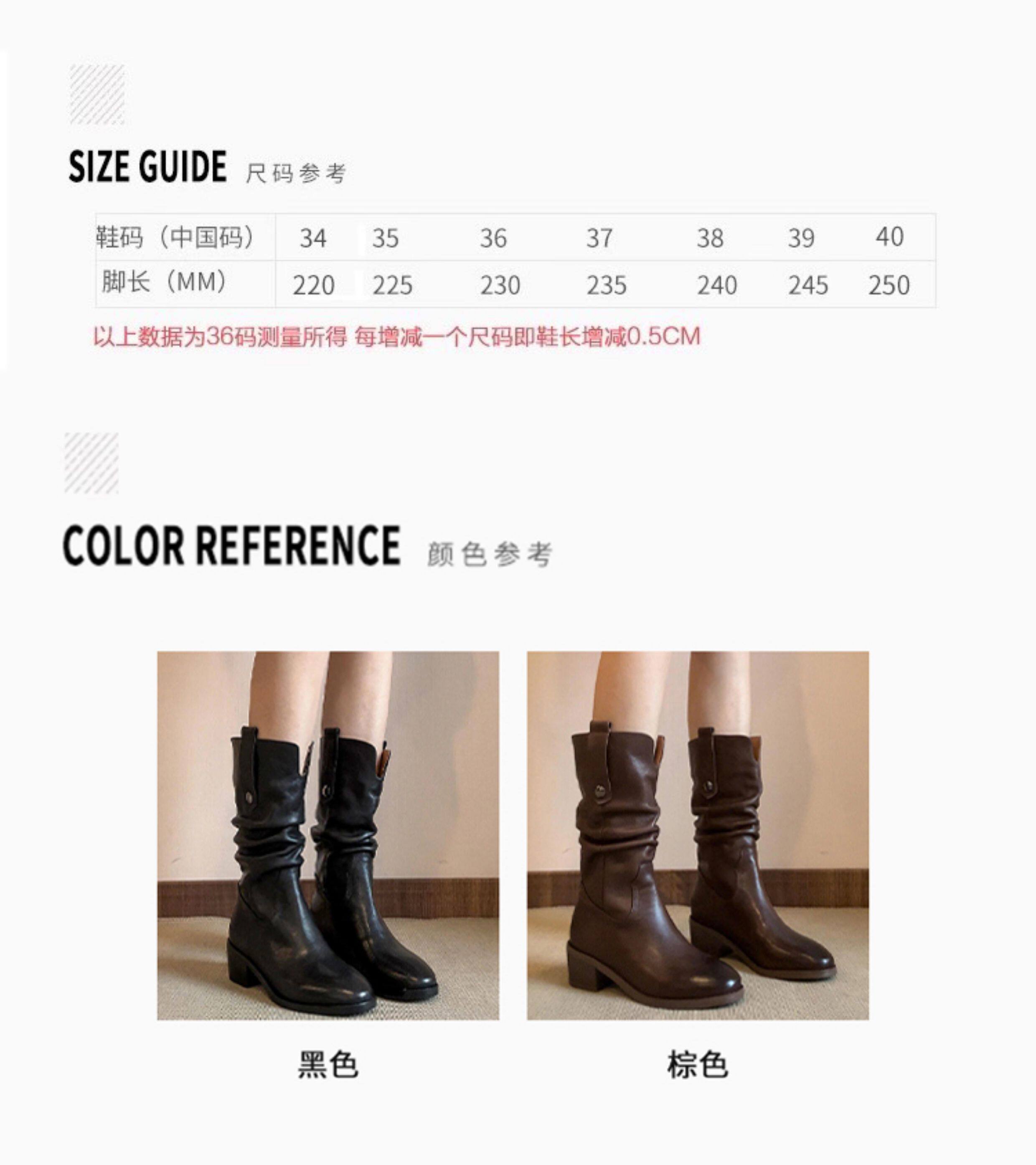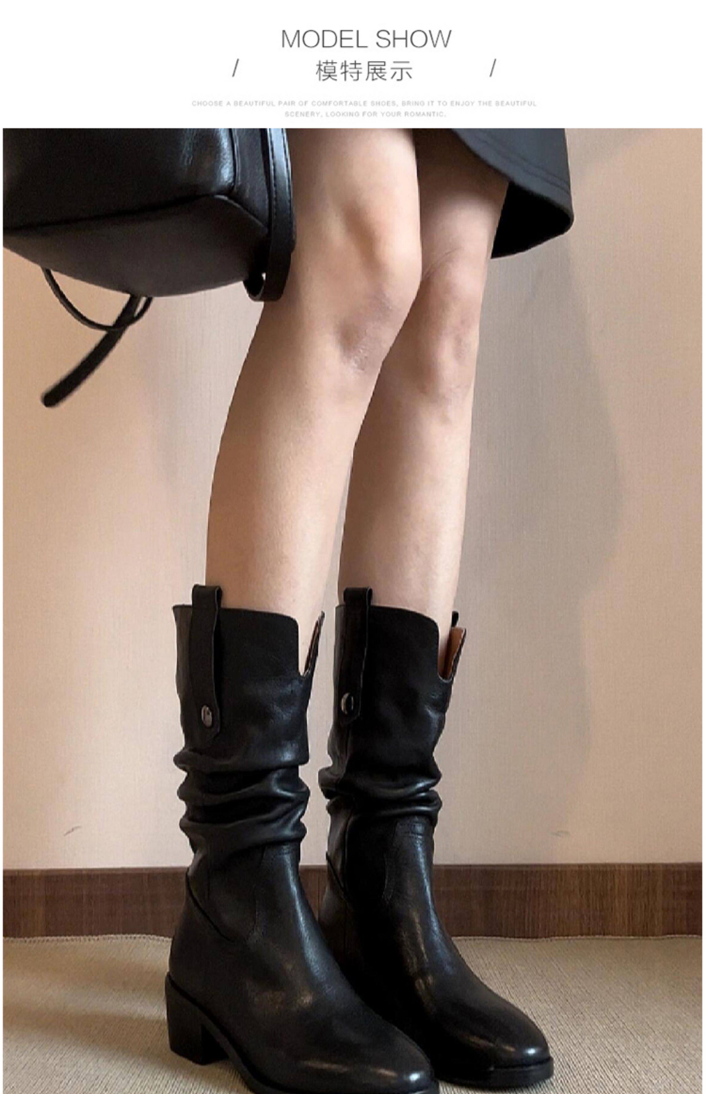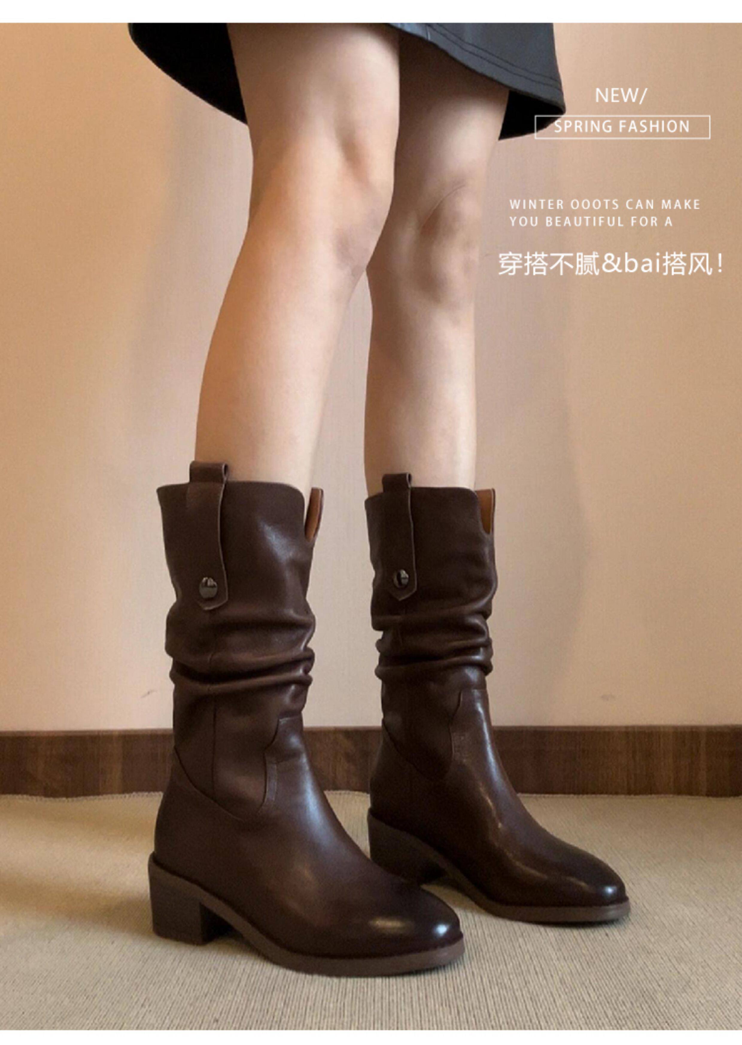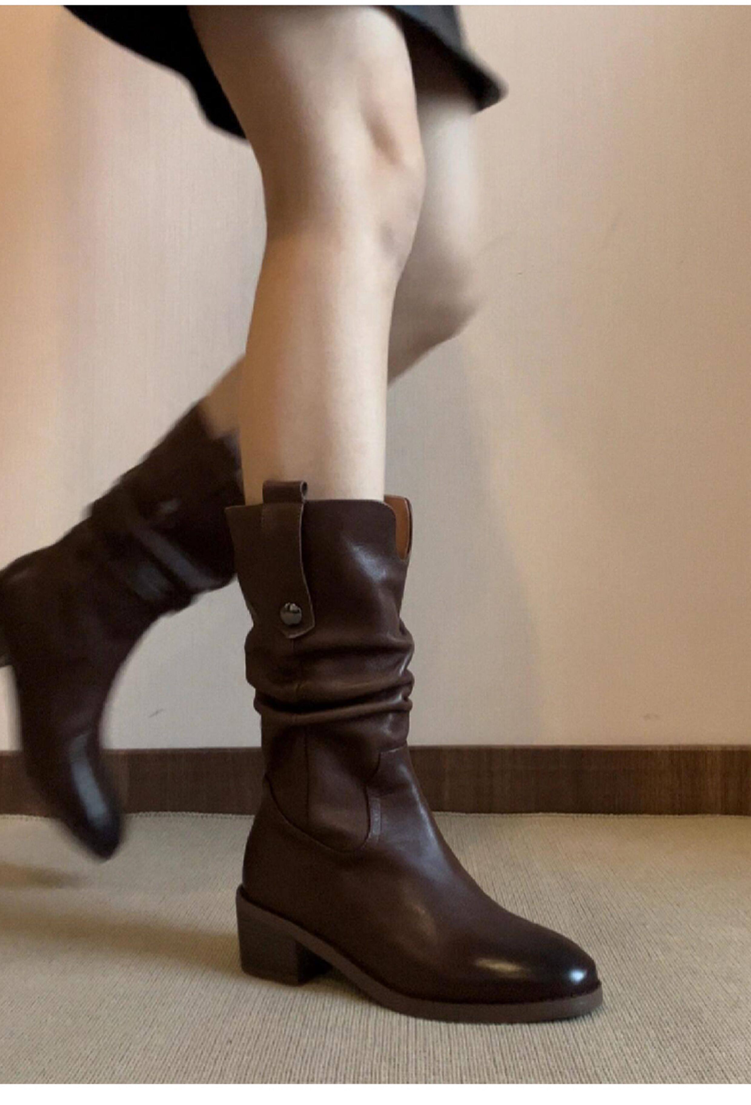 British Style Chunky High-Heeled Boots, Genuine Leather Mid-Calf Boots, Brown Western Cowboy Boots, Mid-Heel Riding Boots, Martin Boots