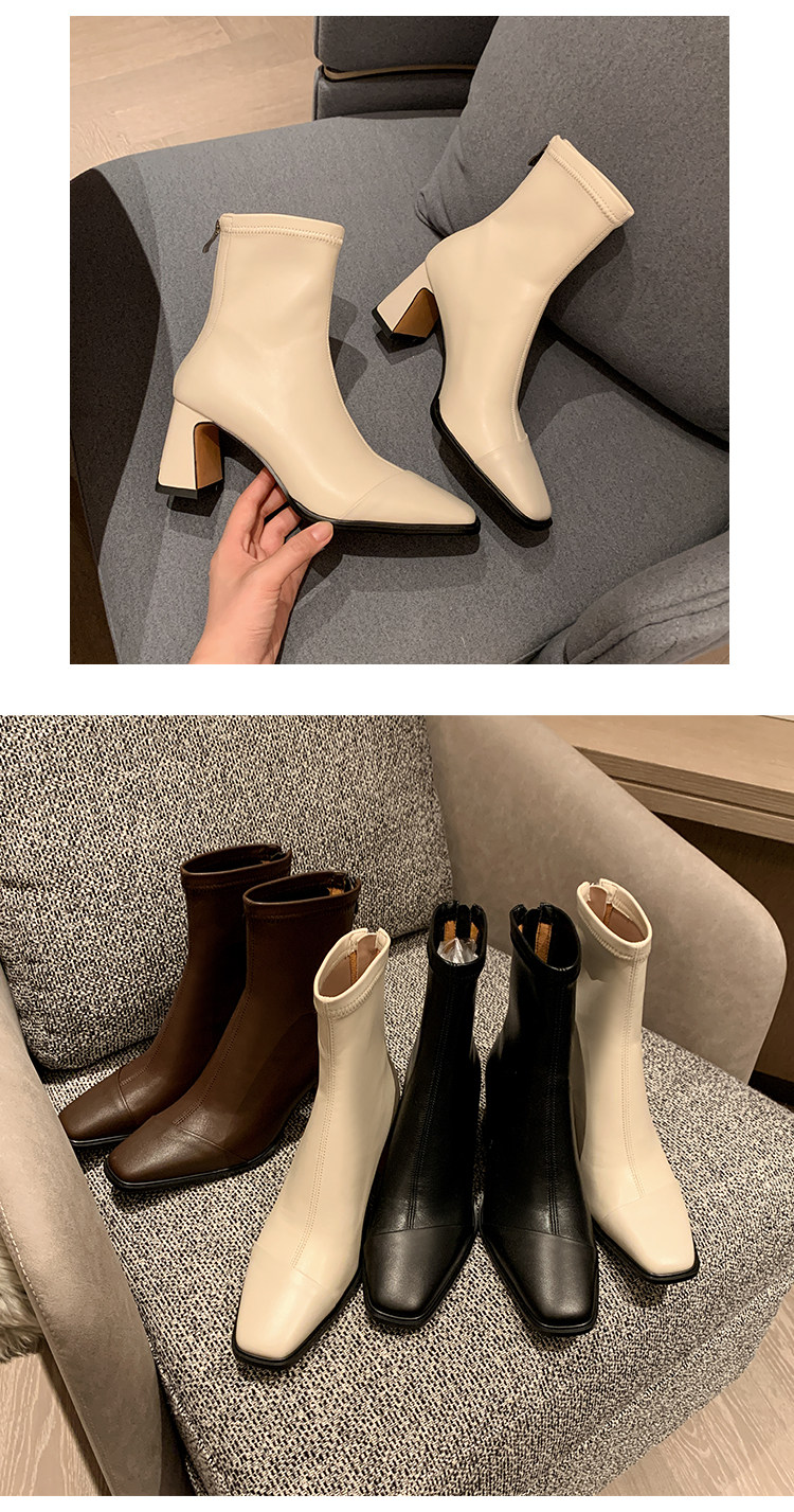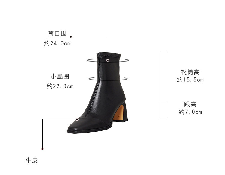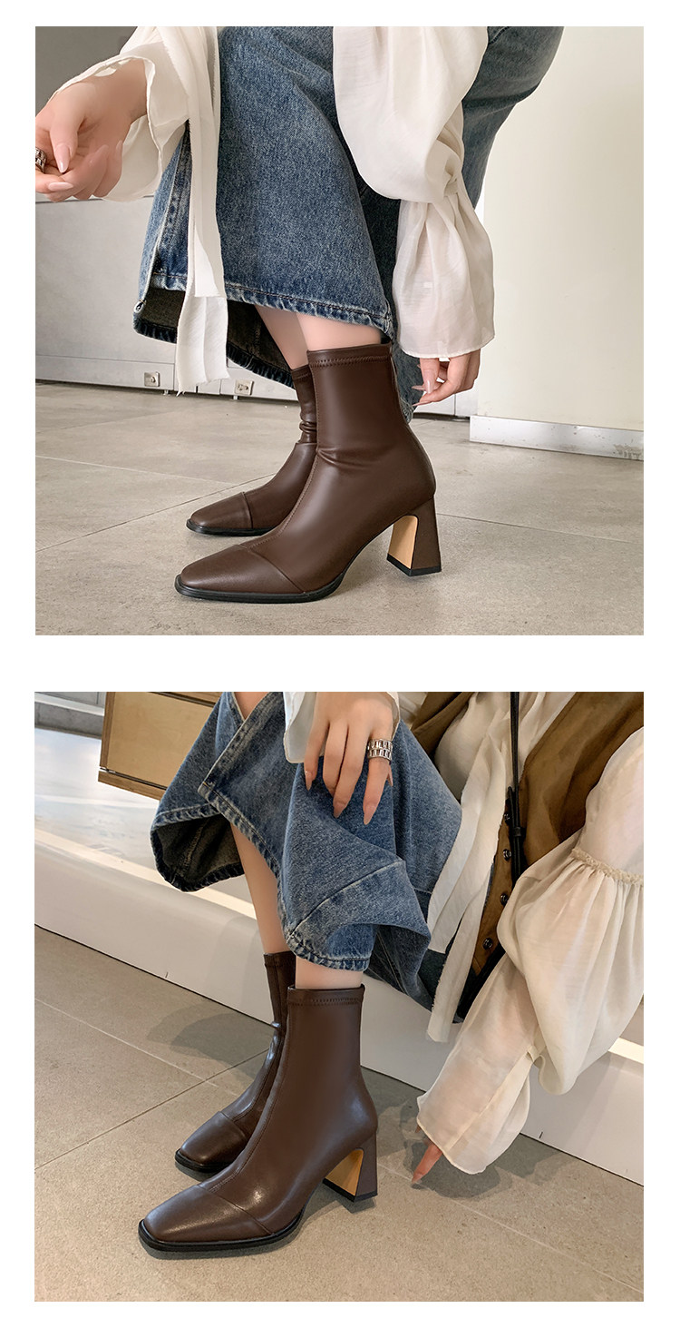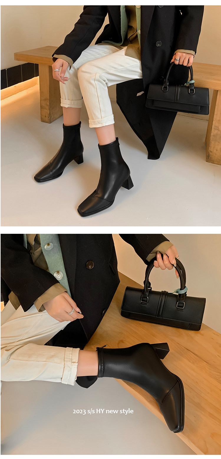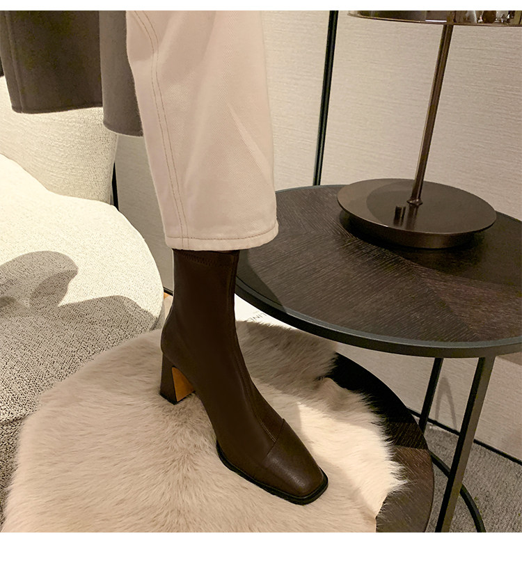 Autumn and Winter Boots, Thick-Heeled French-Style Elastic Slim Boots, Genuine Leather Women's Shoes, Medium-Heeled Large Size Women's Boots, Square-Toe High-Heeled Short Boots for Women