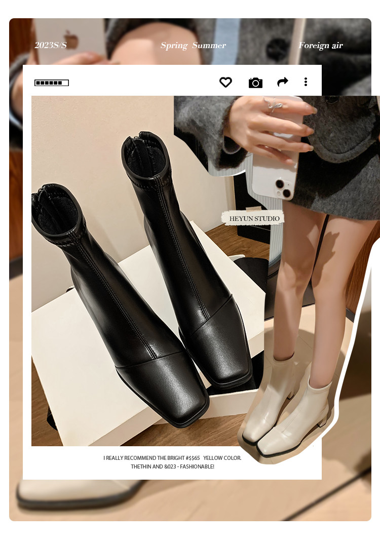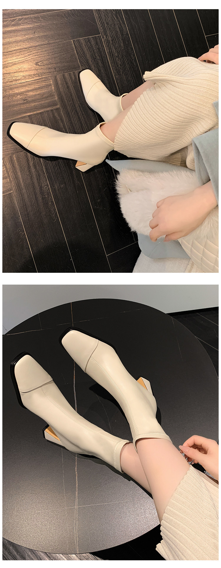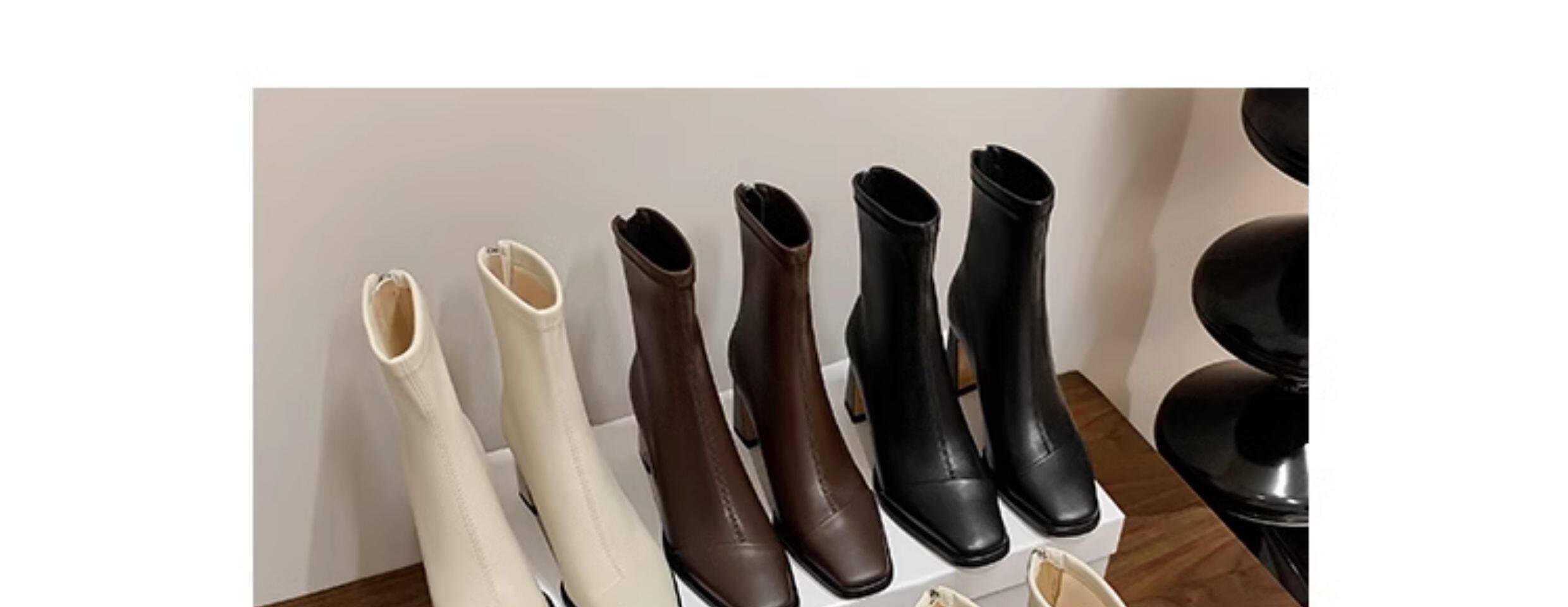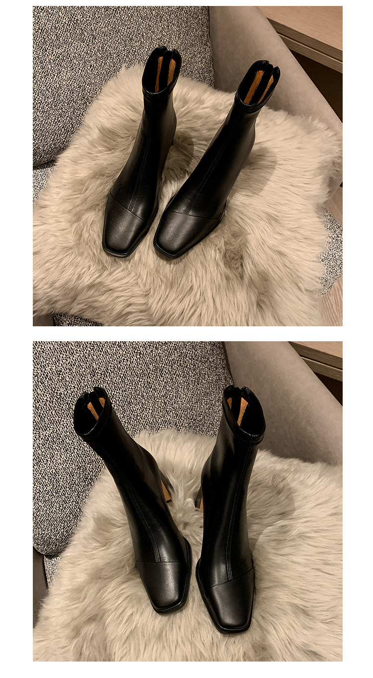 Autumn and Winter Boots, Thick-Heeled French-Style Elastic Slim Boots, Genuine Leather Women's Shoes, Medium-Heeled Large Size Women's Boots, Square-Toe High-Heeled Short Boots for Women