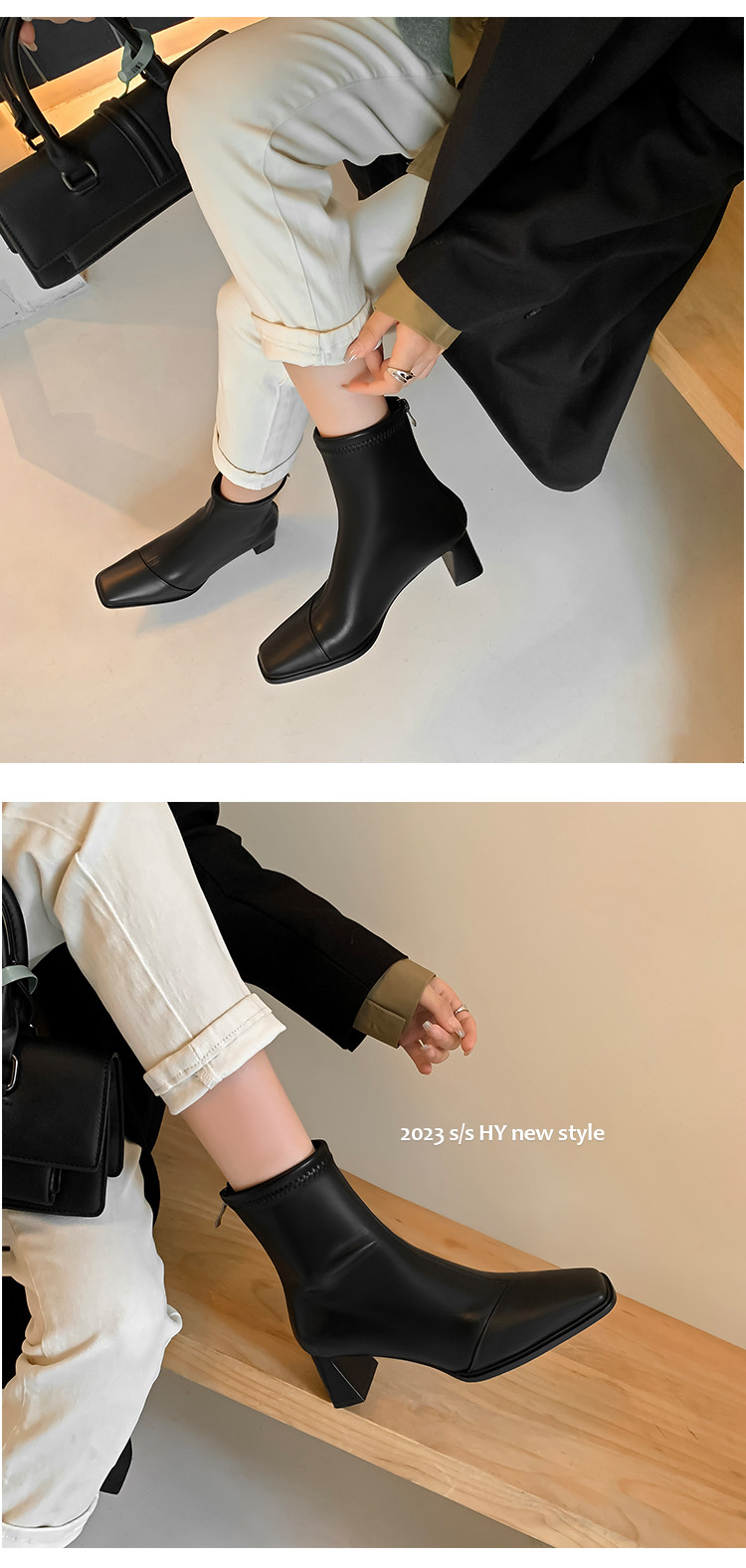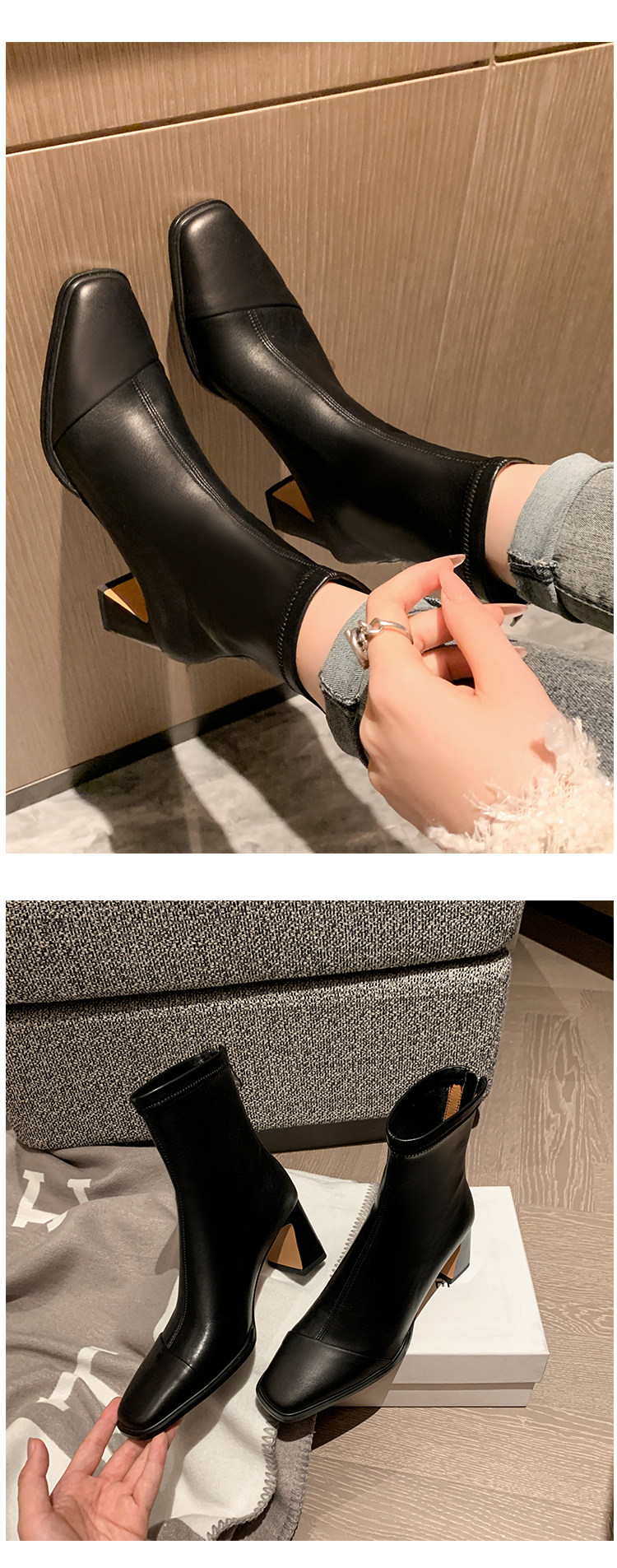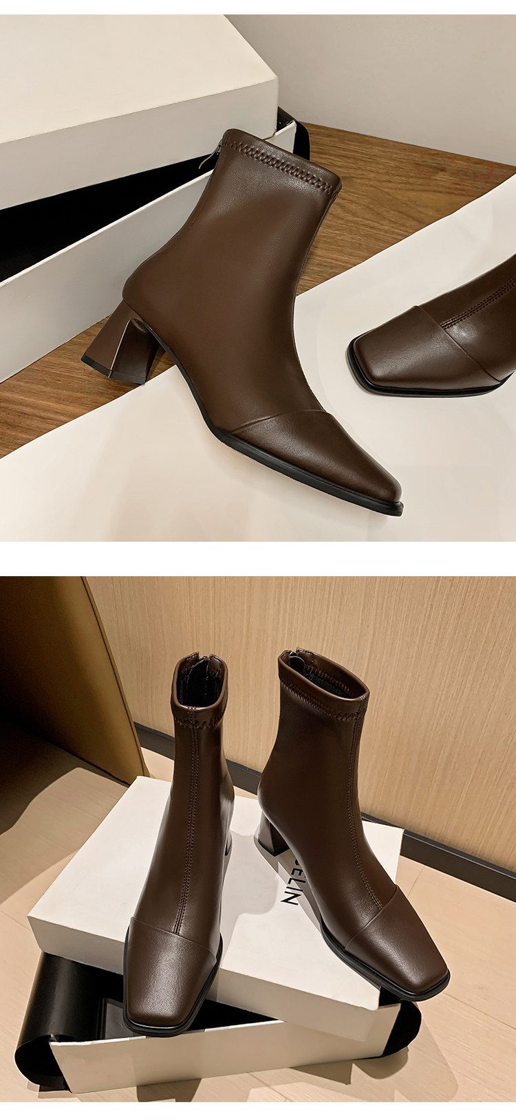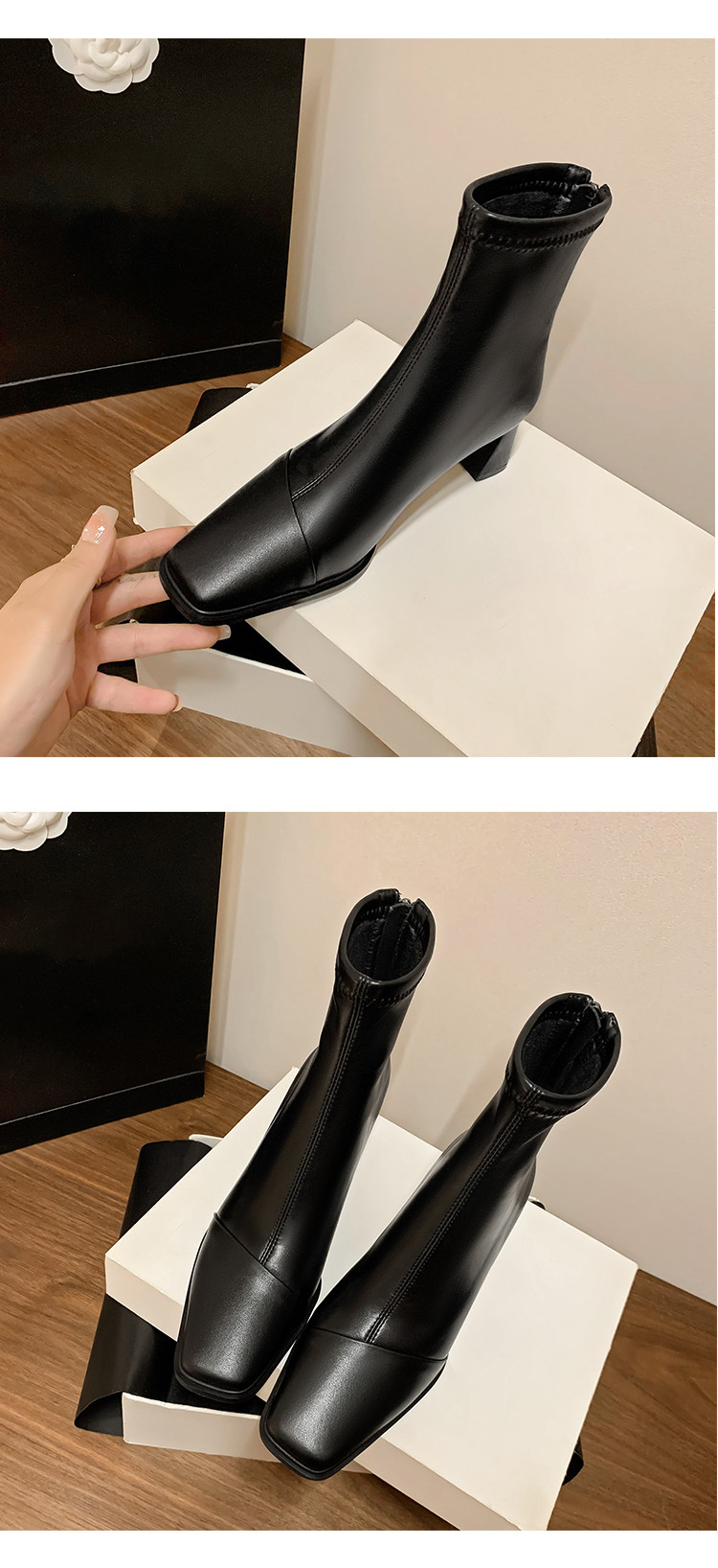 Autumn and Winter Boots, Thick-Heeled French-Style Elastic Slim Boots, Genuine Leather Women's Shoes, Medium-Heeled Large Size Women's Boots, Square-Toe High-Heeled Short Boots for Women