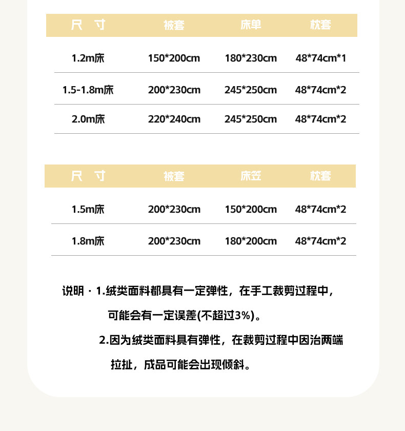 适用床尺寸 0.9m床【床单款三件套】-适合150x200cm被芯,1.2m床【床单款三件套】-适合150x200cm被芯,1.5m床【床单款四件套】-适合200x230cm被芯,1.8m床【床单款四件套】-适合200x230cm被芯,2.0m床【床单款四件套】-适合220x240cm被芯,床笠款-1.5m床四件套【适合200x230cm被芯】,床笠款-1.8m床四件套【适合200x230cm被芯】