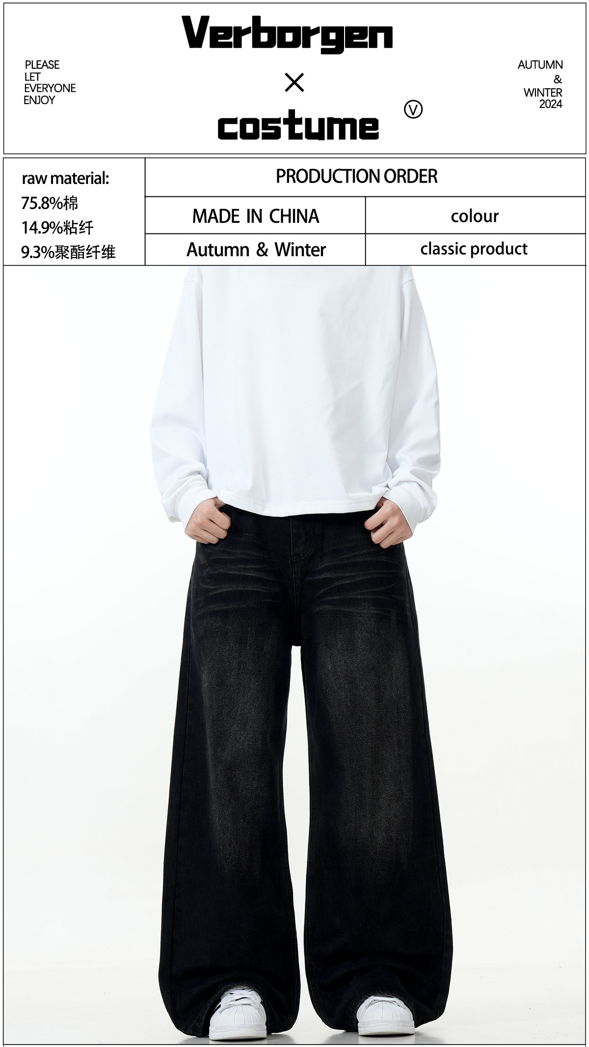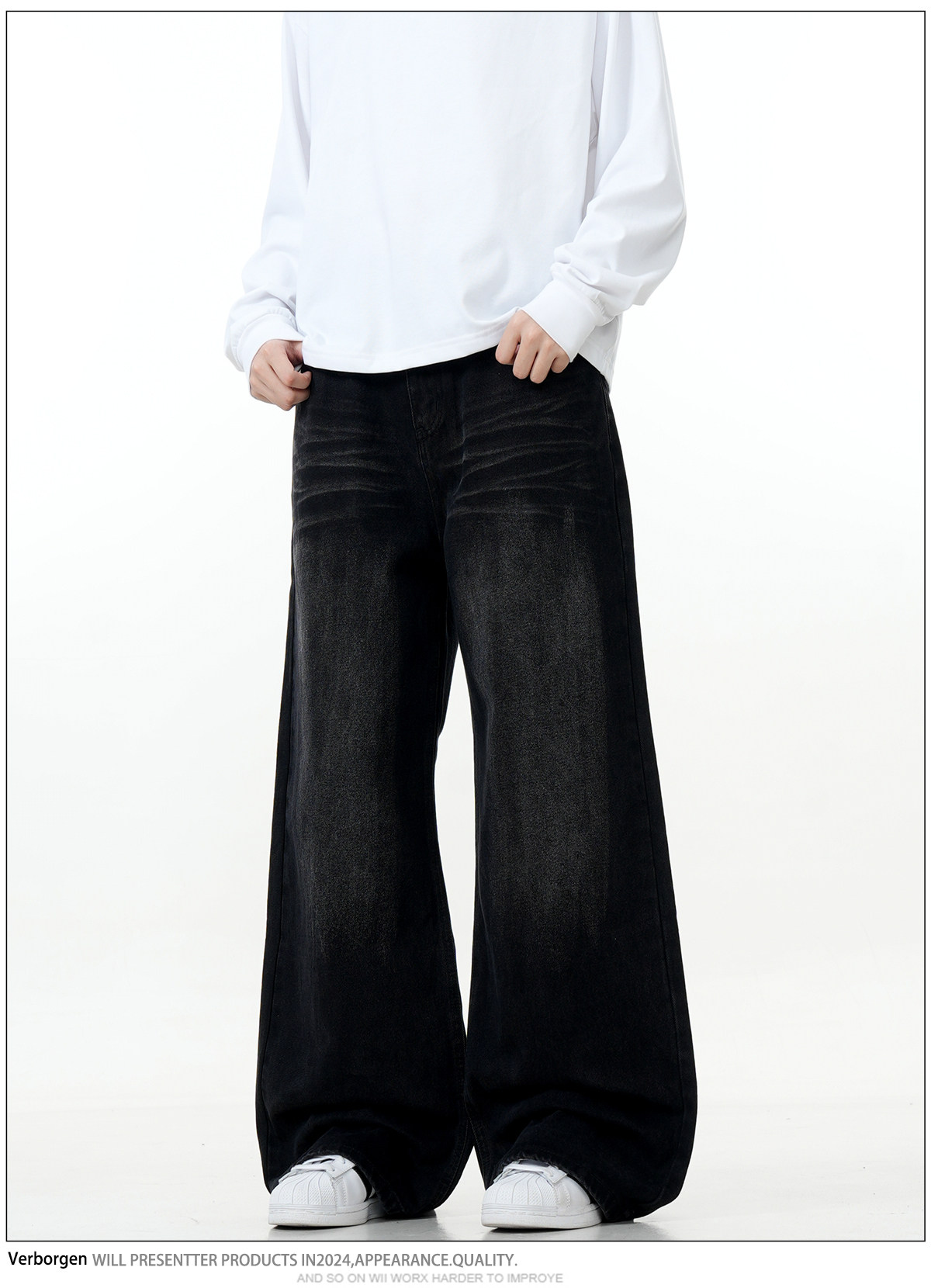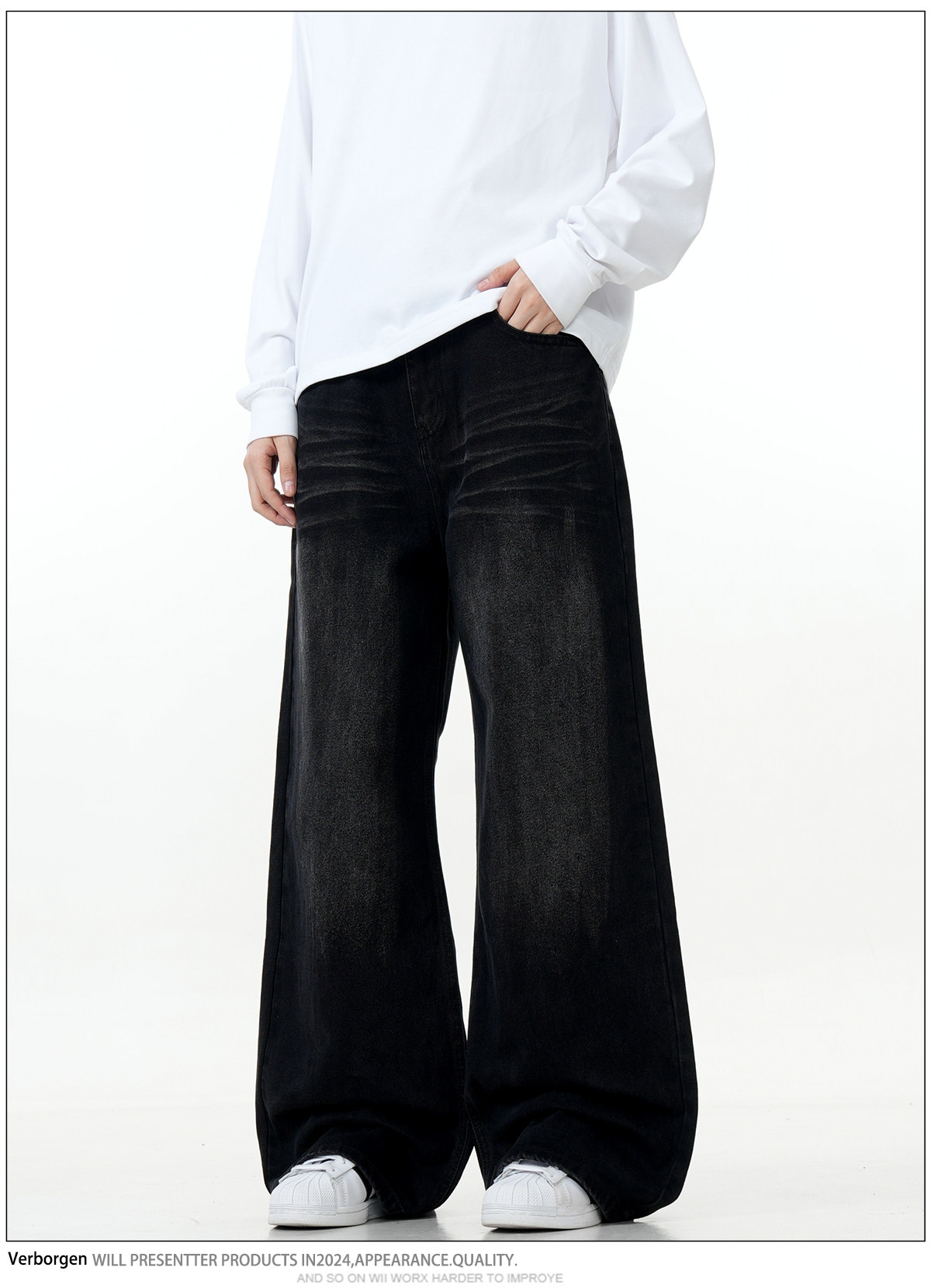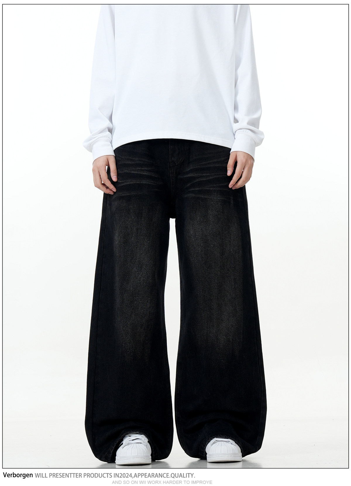 Verborgen American Retro Whiskered Black Jeans, Simple and Versatile, Loose Straight-Leg Wide-Leg Cleanfit