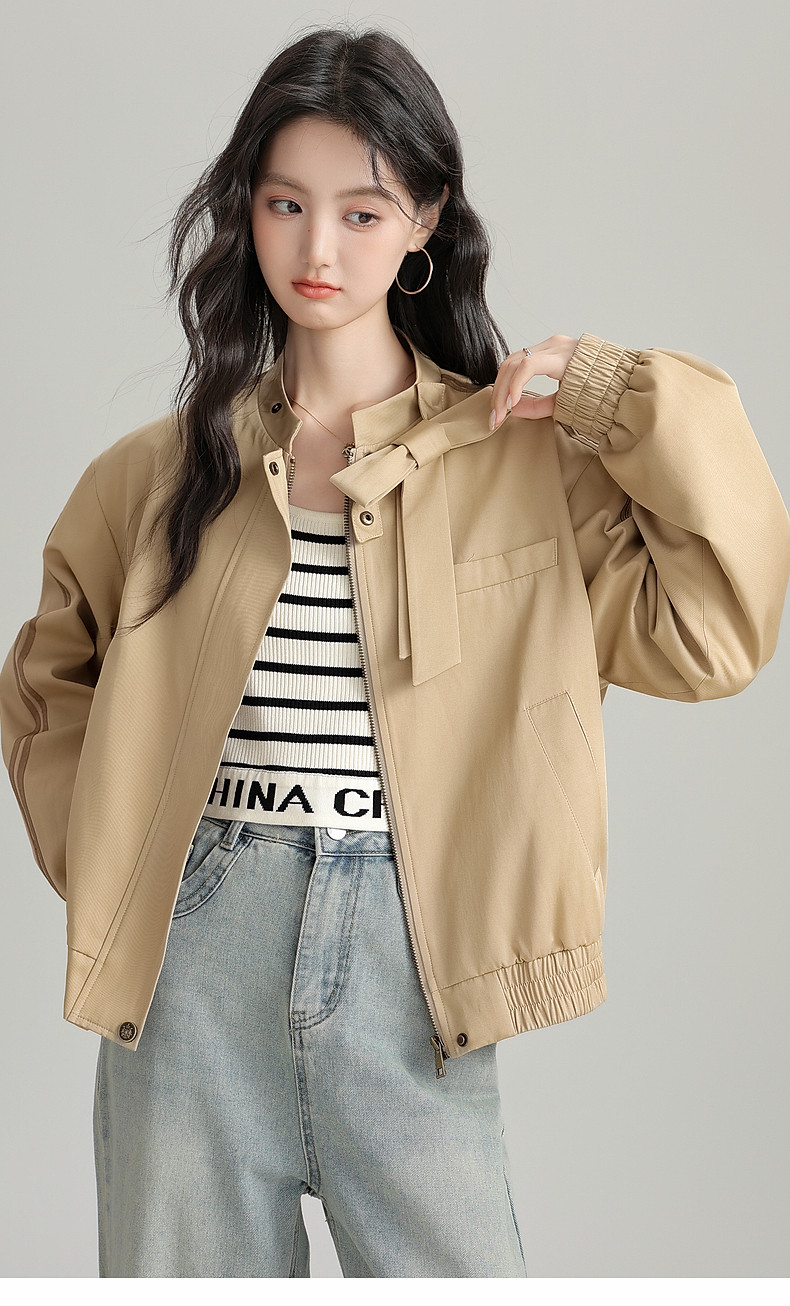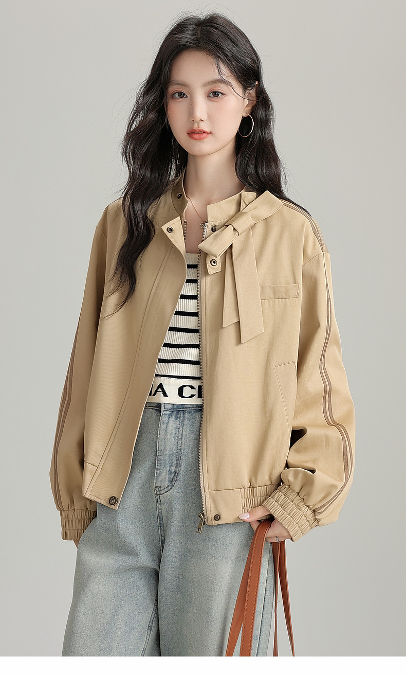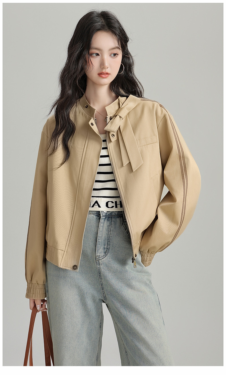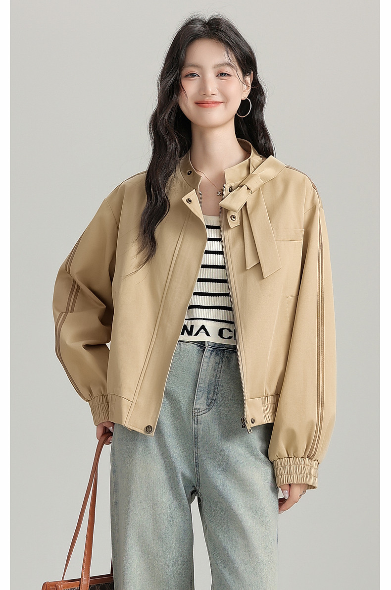 2025 Autumn New Stand Collar Zipper Jacket Women's Loose Bow Design Casual Cardigan Top Long Sleeve Jacket