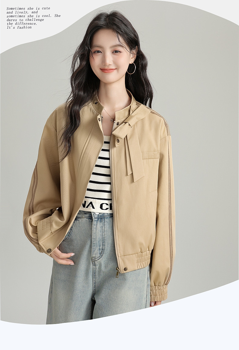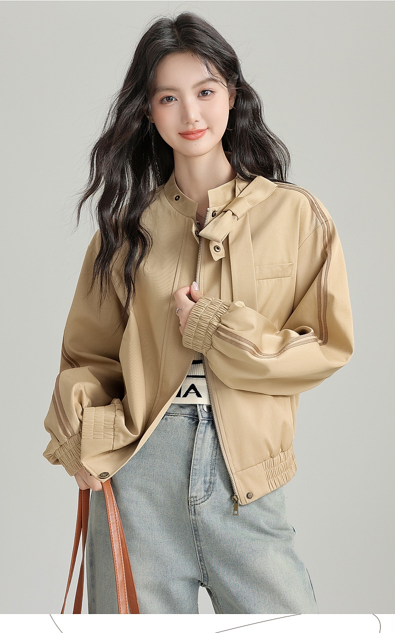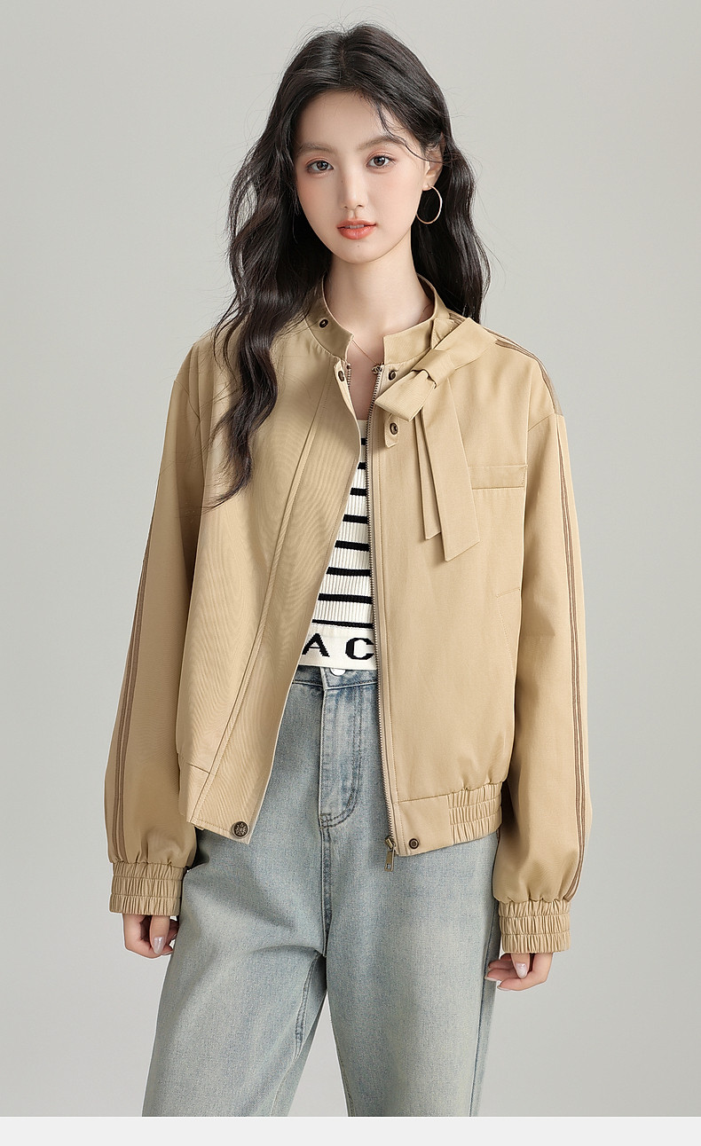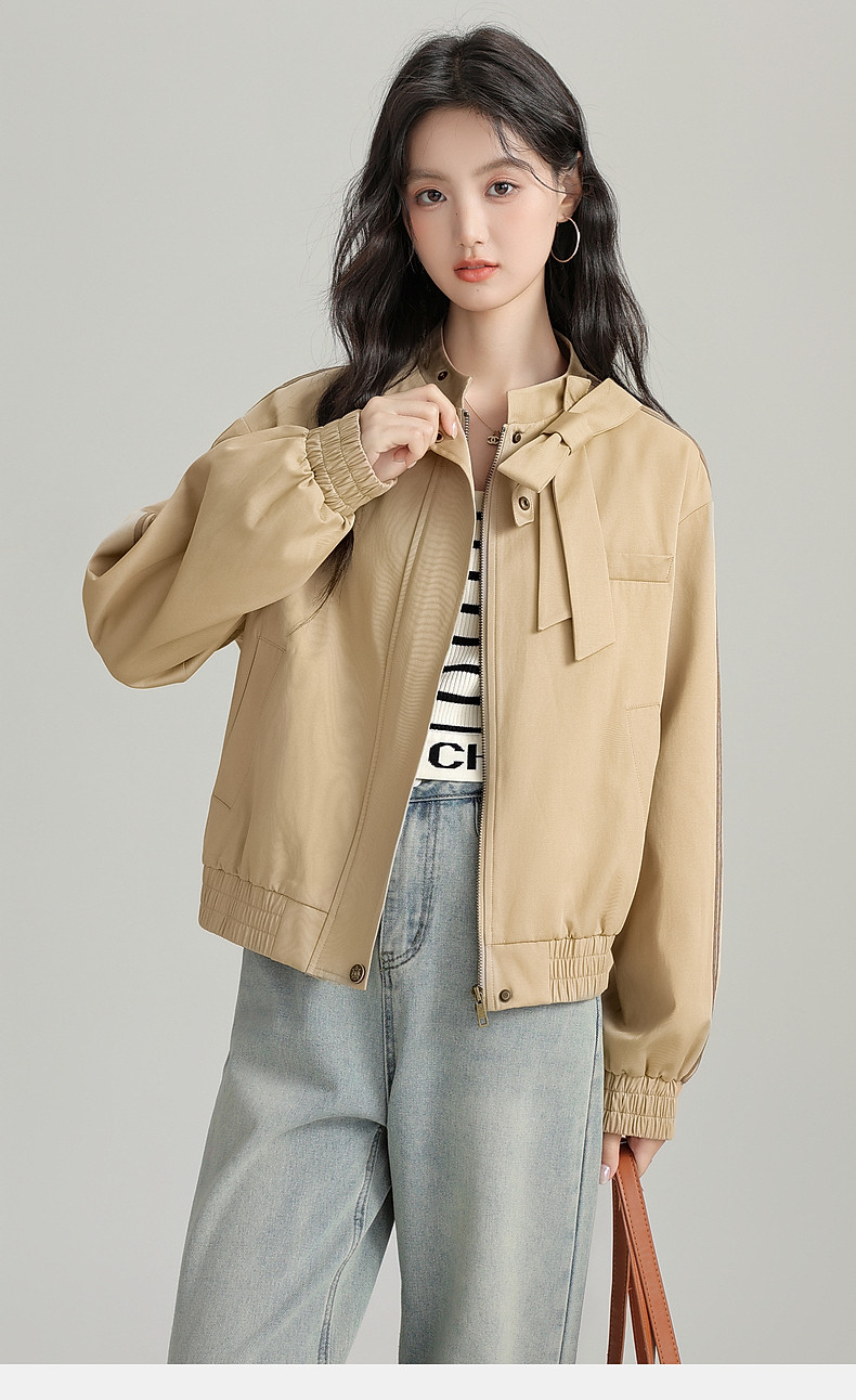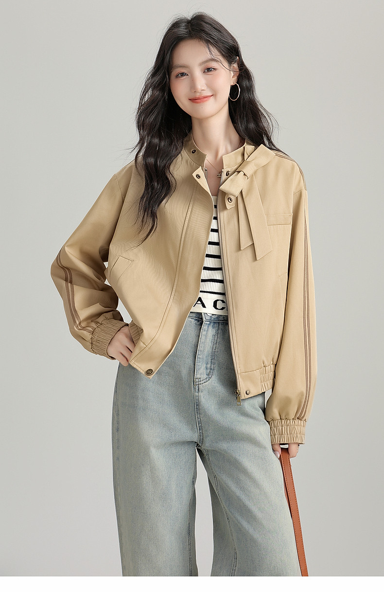 2025 Autumn New Stand Collar Zipper Jacket Women's Loose Bow Design Casual Cardigan Top Long Sleeve Jacket