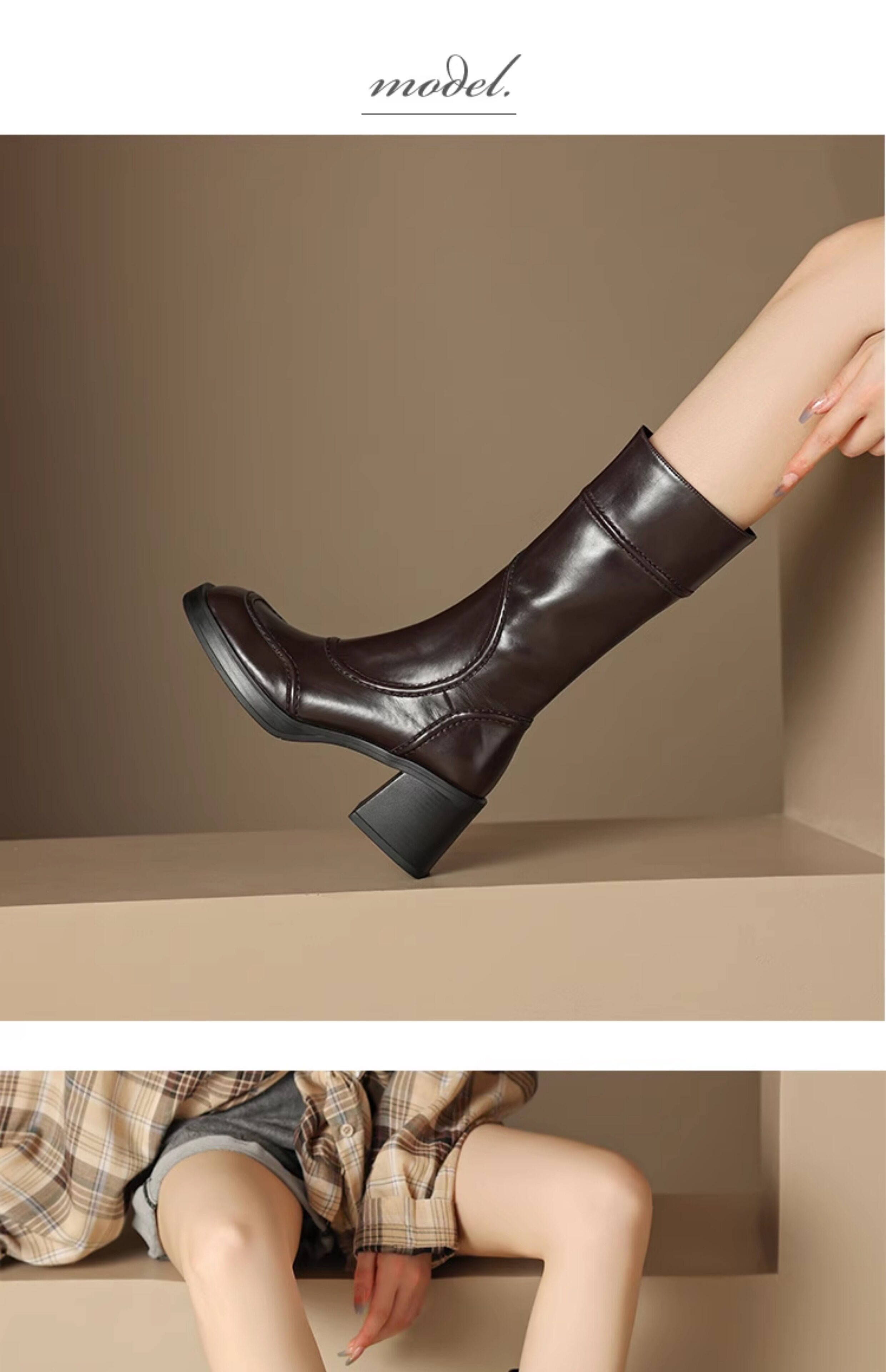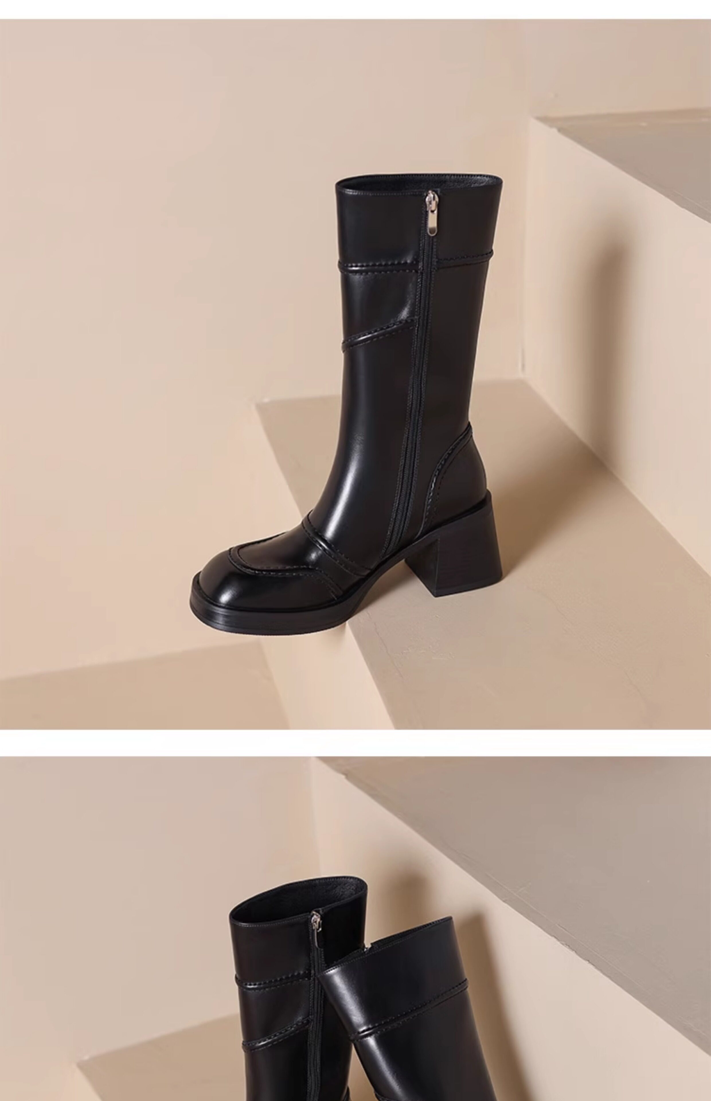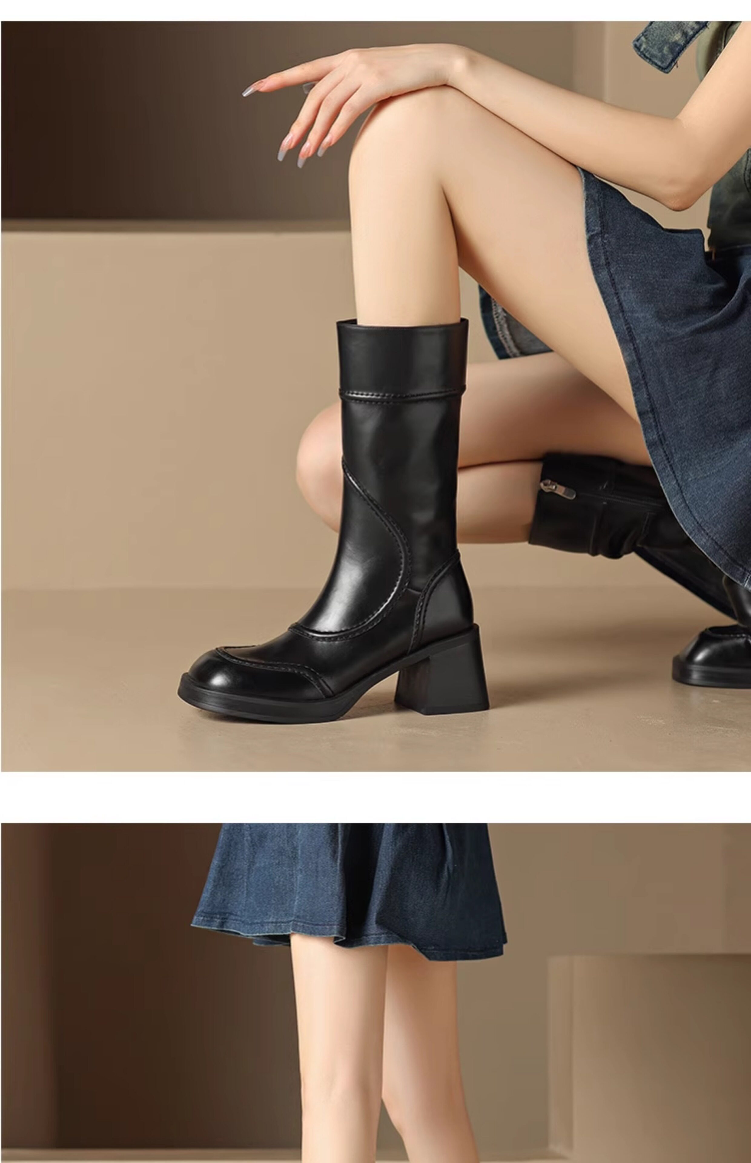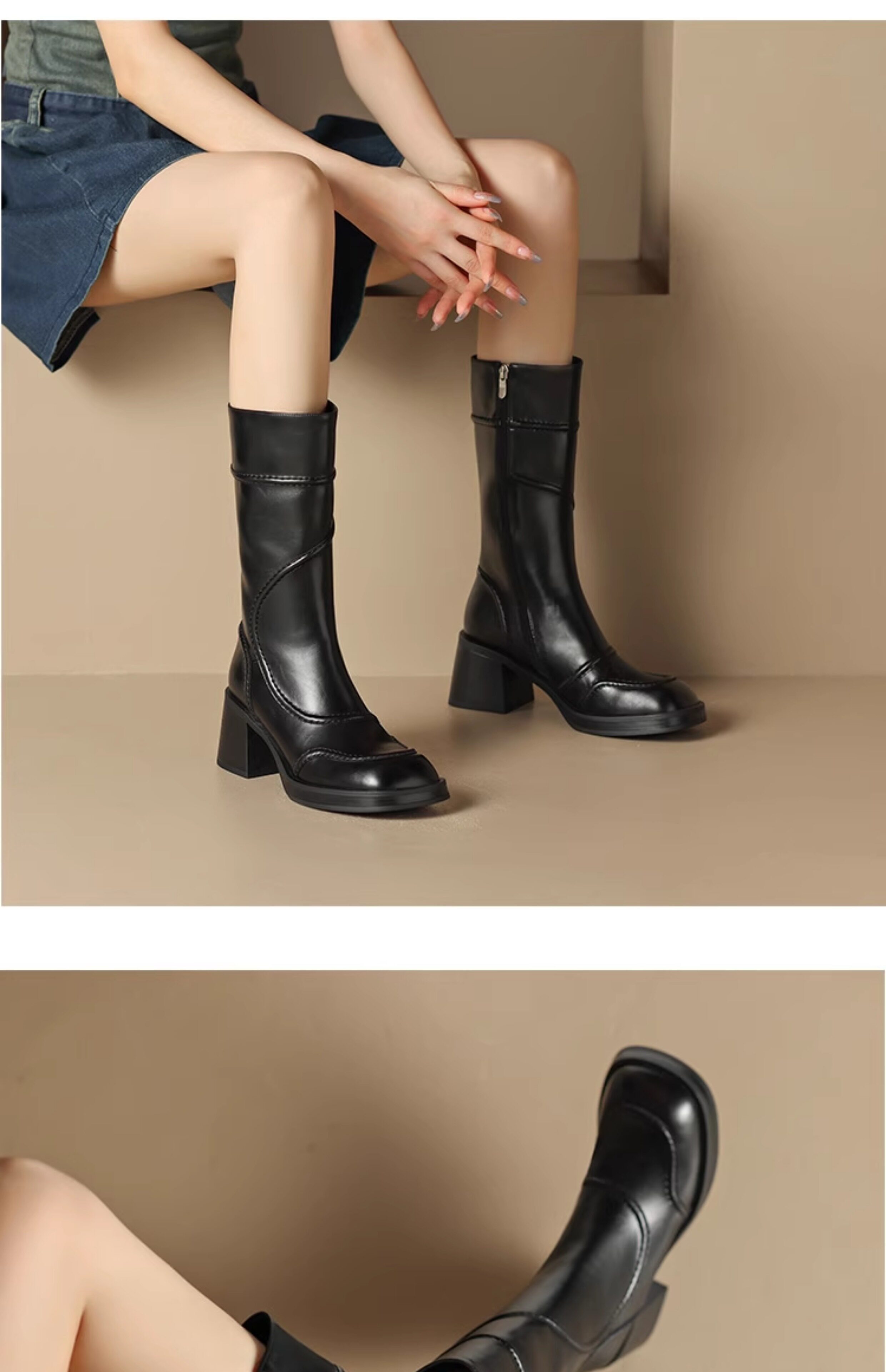 Genuine Leather Mid-Calf Boots for Women 2026 New Popular Style Slimming Martin Boots Chunky Heel Riding Boots Biker Boots Melard Style