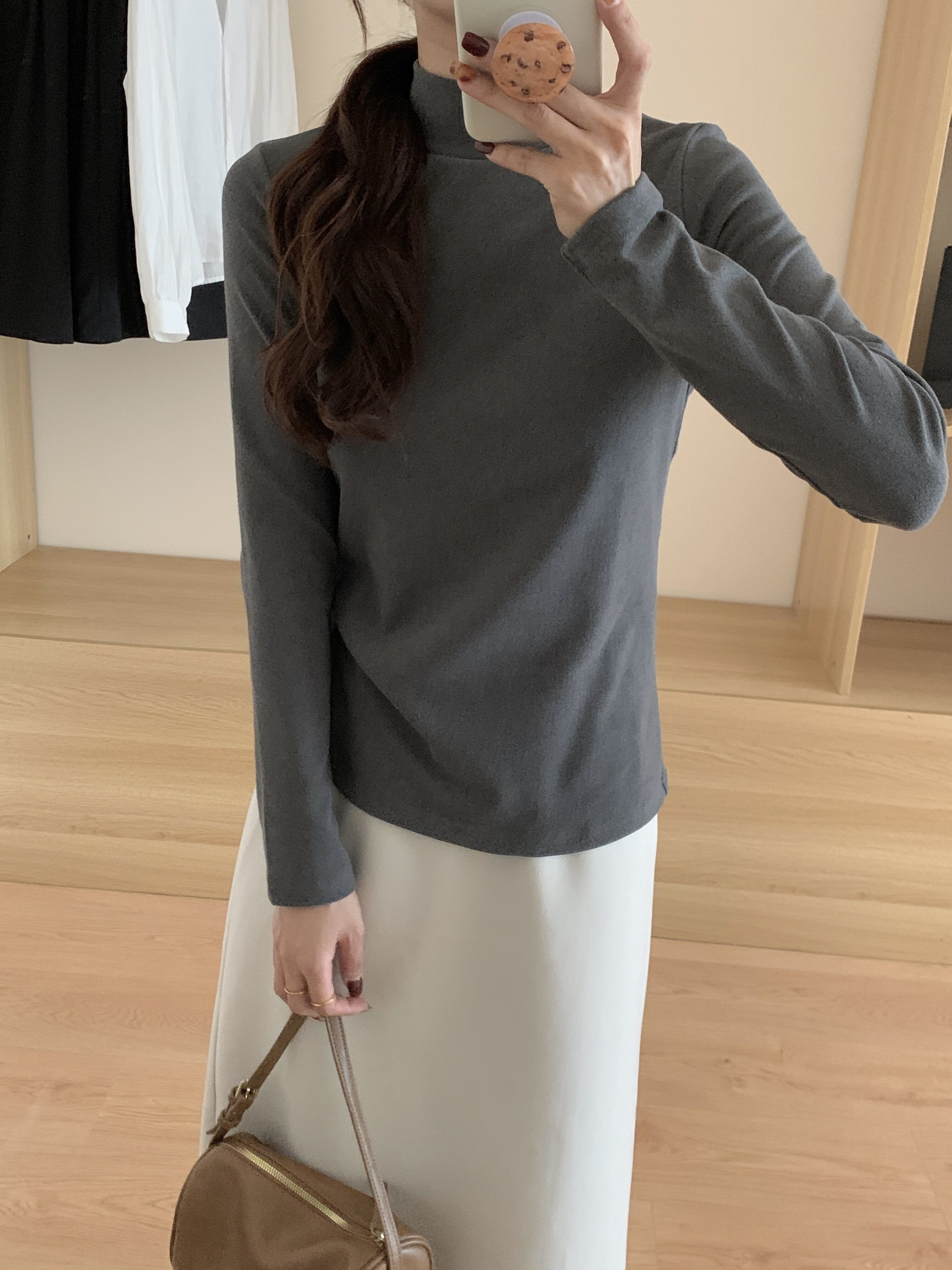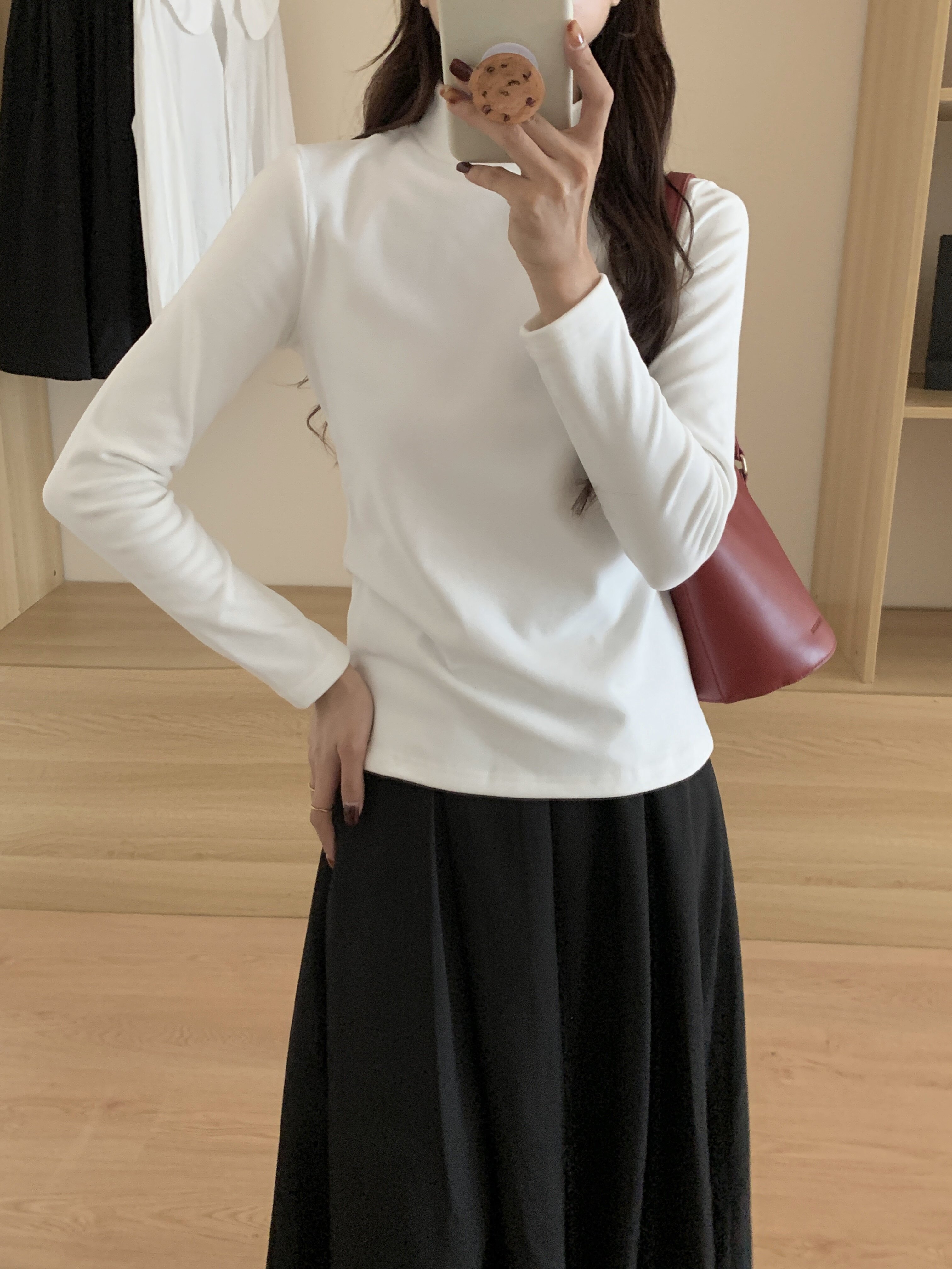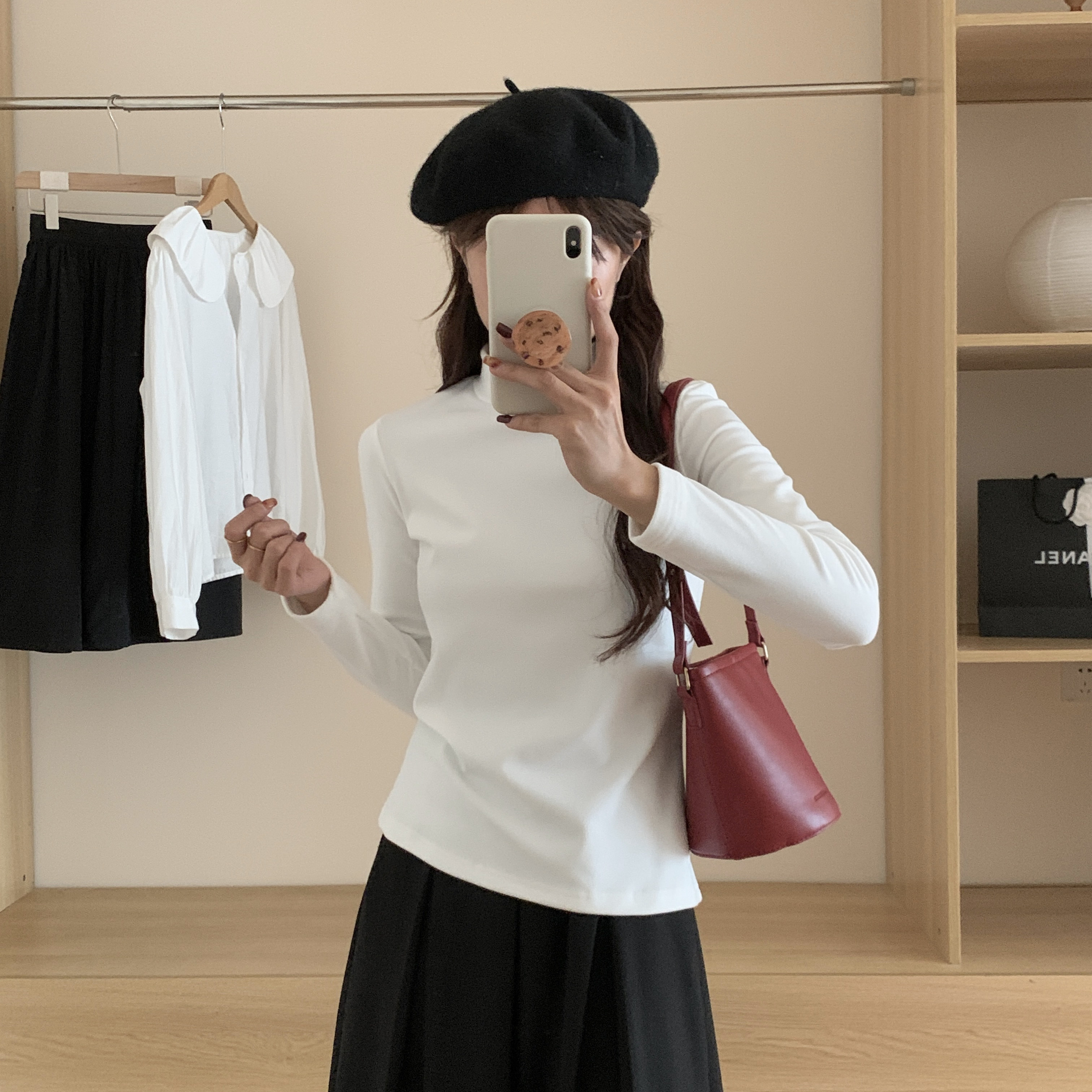 Double-sided brushed thickened warm long-sleeved T-shirt for women in autumn and winter slim-fitting half turtleneck bottoming shirt outer wear fleece top