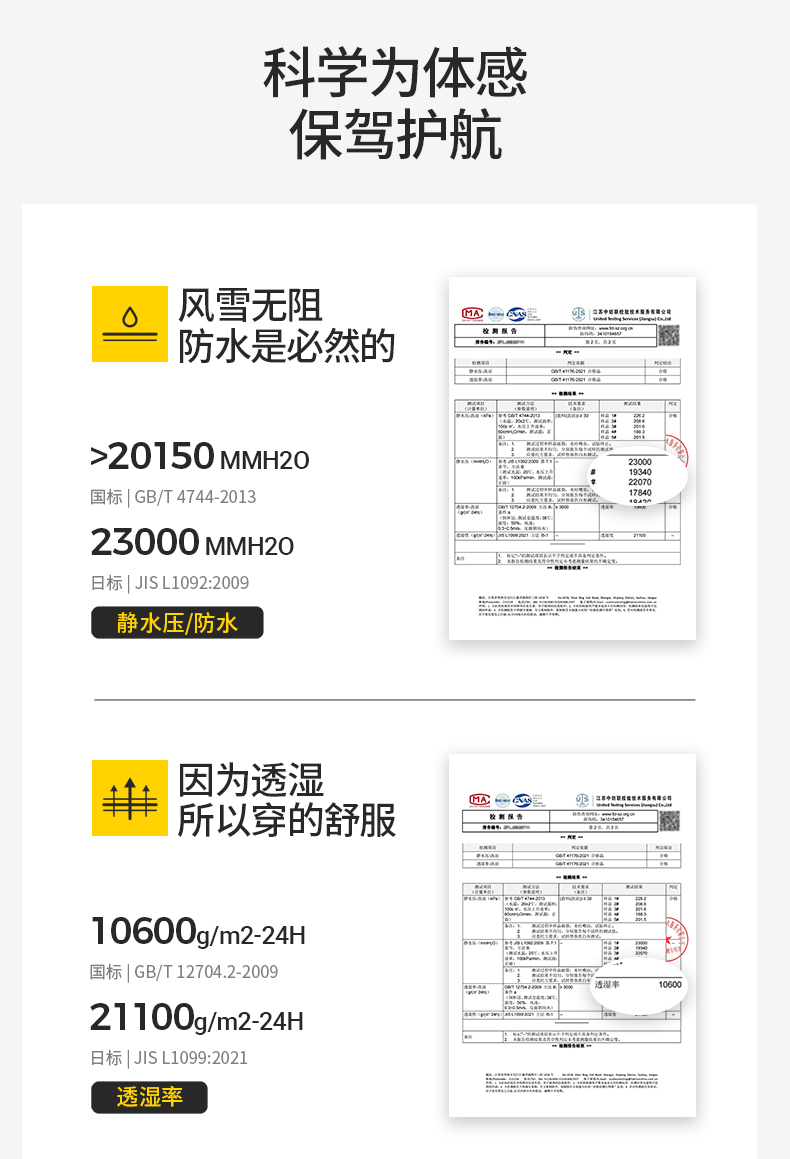 Waterproof Surface Moisture Resistance: ≥4-5 Levels before Washing, ≥3-4 Levels after Washing,Hydrostatic Pressure: before Washing - Fabric ≥ 50Kpa, Fabric Seams ≥ 40Kpa after Washing - Fabric ≥ 40Kpa, Fabric Seams ≥ 30Kpa