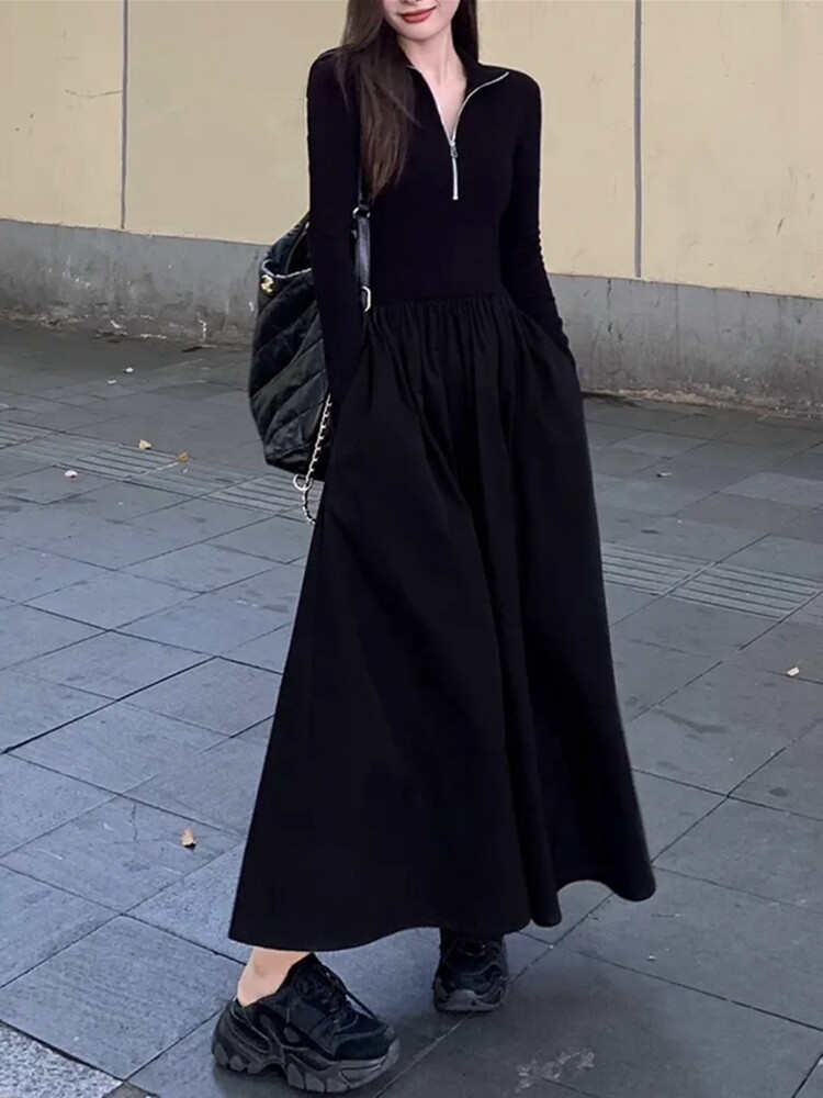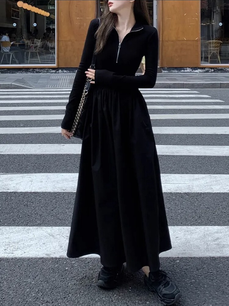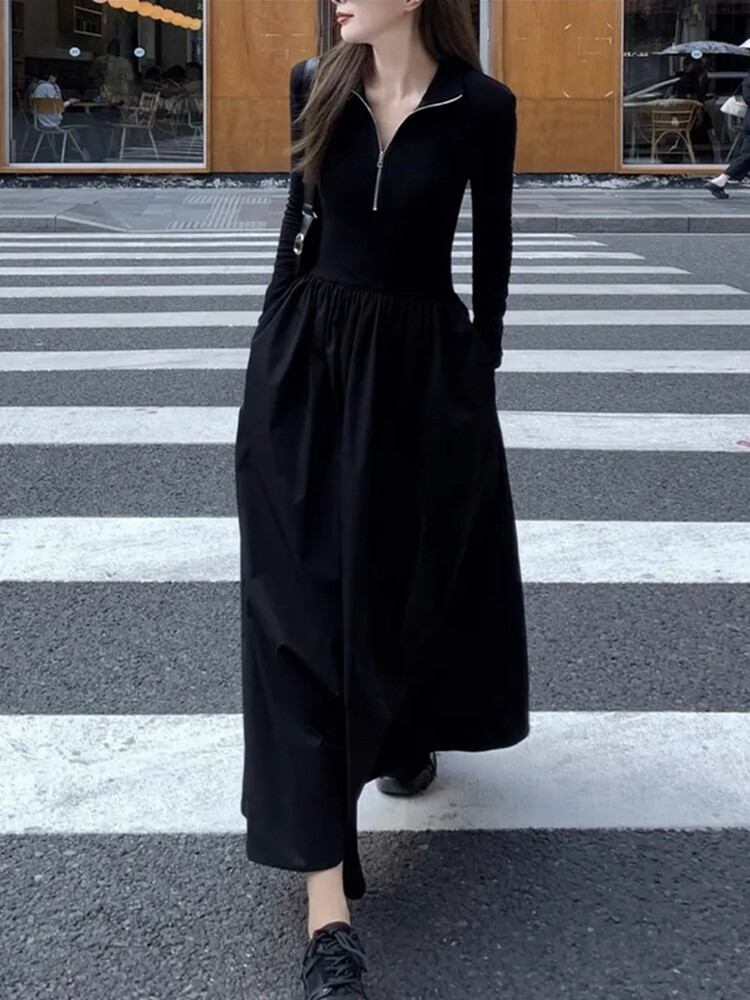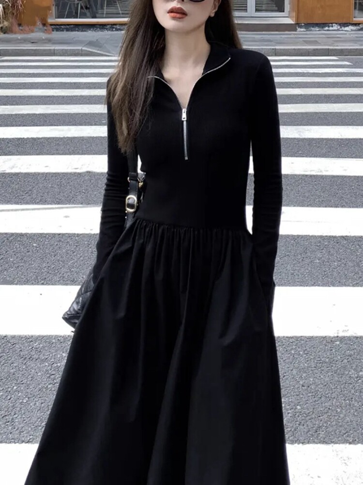 2025 New Hepburn-Style French High-End Long-Sleeved Knitted Spring and Autumn Slim-Fit Waist-Cinching Black Dress for Women