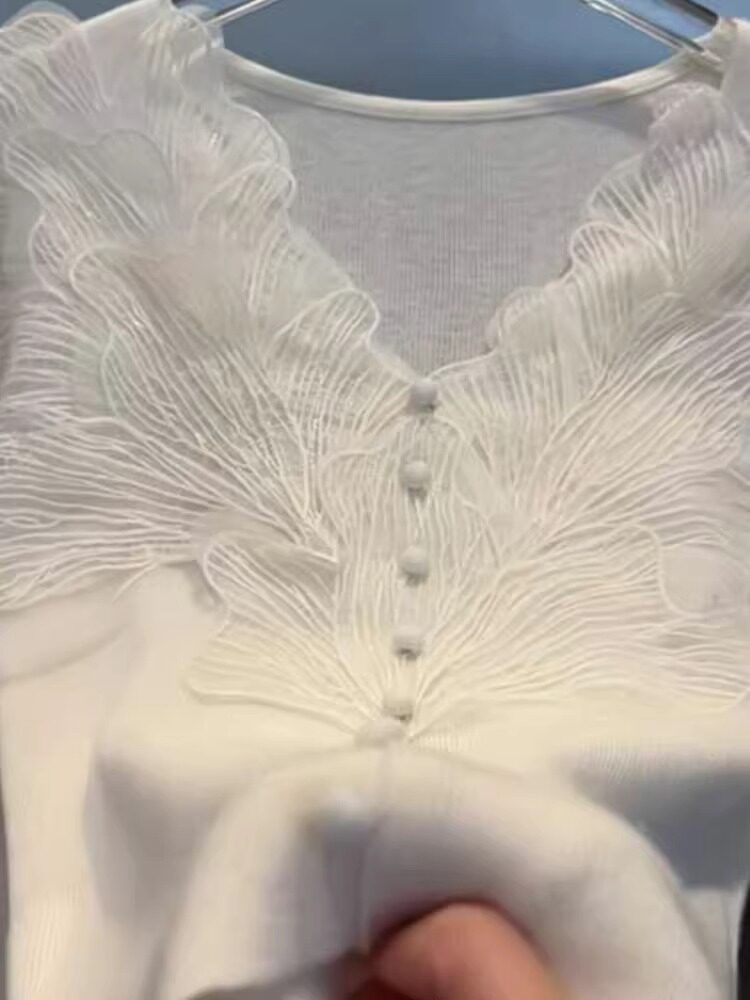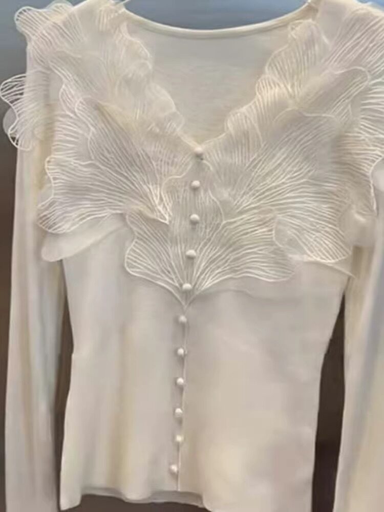 Women's long-sleeved knitted bottoming shirt 2024 early autumn and winter new style inner French v-neck lace splicing design top
