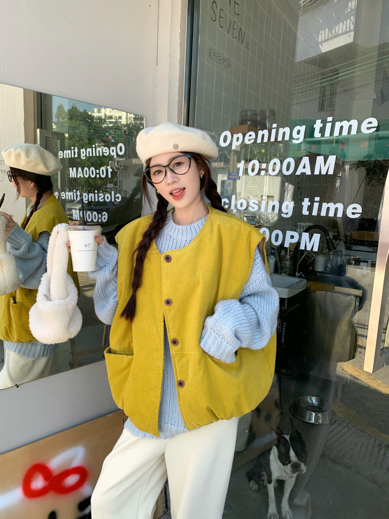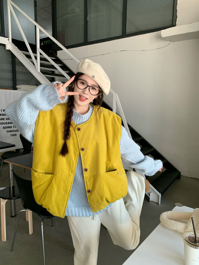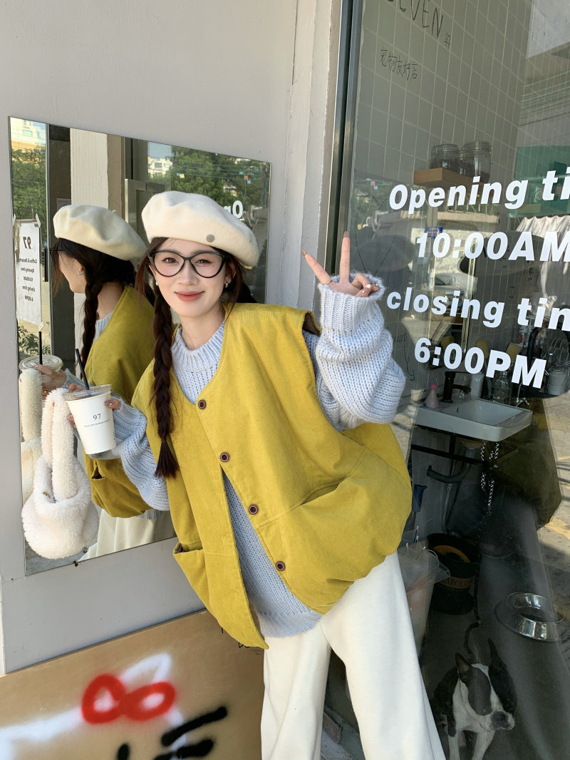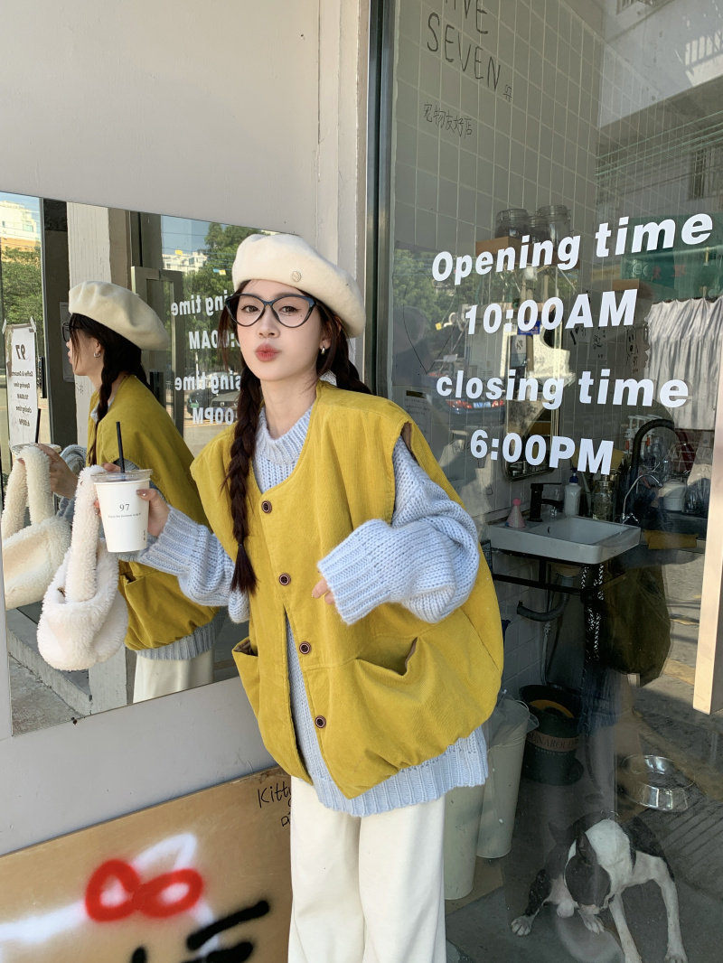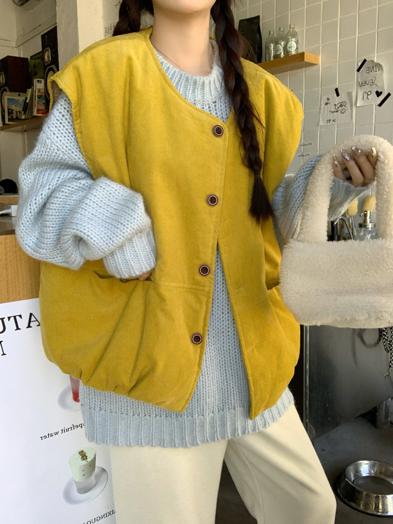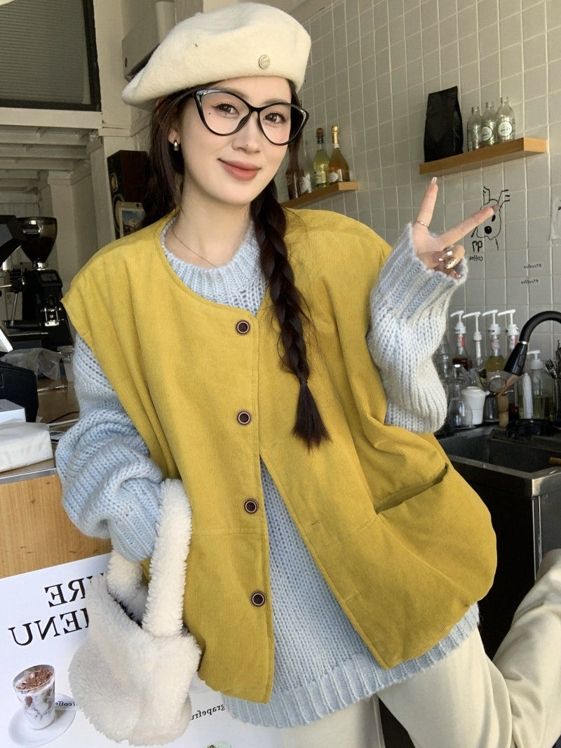 Japanese Retro Yellow Corduroy Vest Jacket for Women, Autumn and Winter Layered Loose Vest Outerwear Cardigan Top