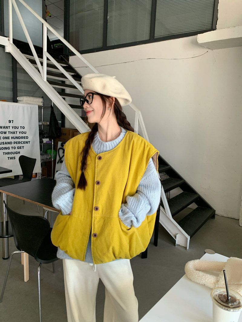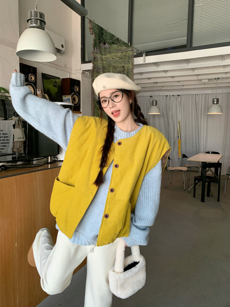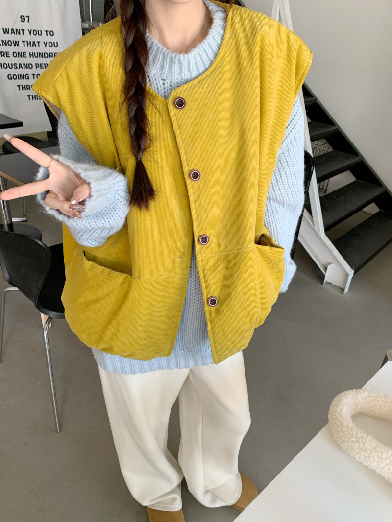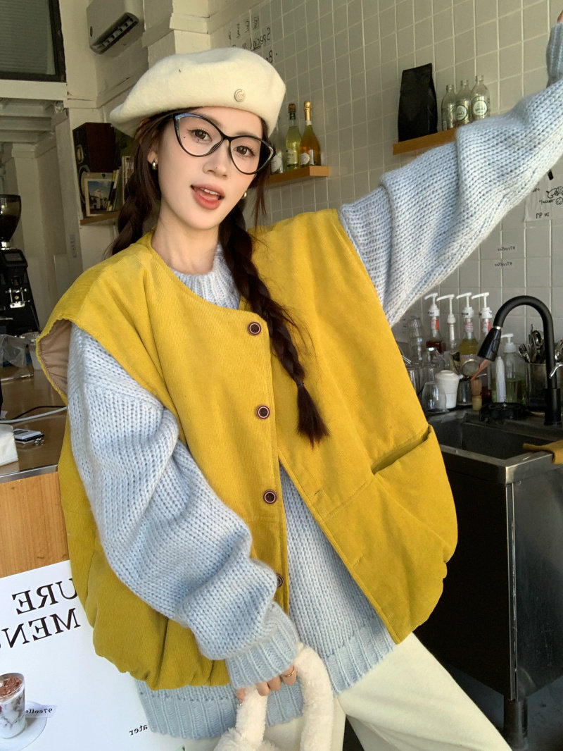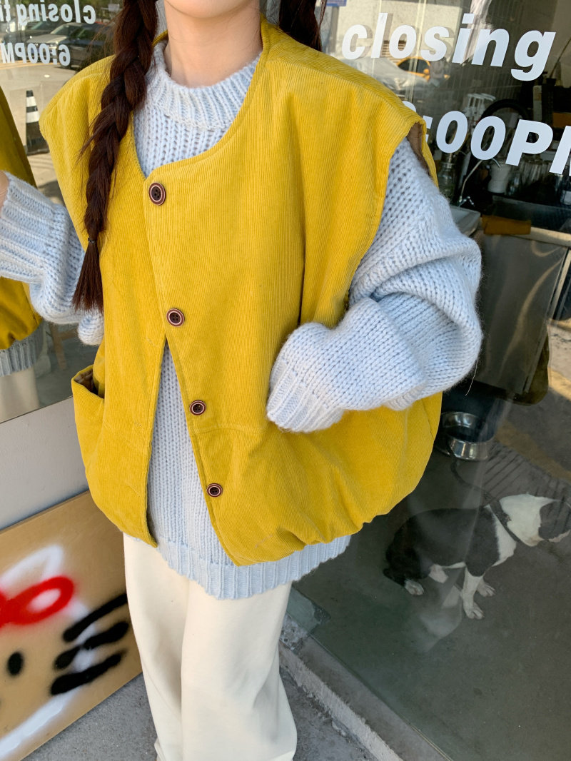 Japanese Retro Yellow Corduroy Vest Jacket for Women, Autumn and Winter Layered Loose Vest Outerwear Cardigan Top