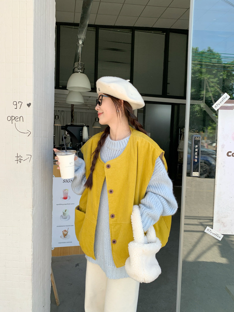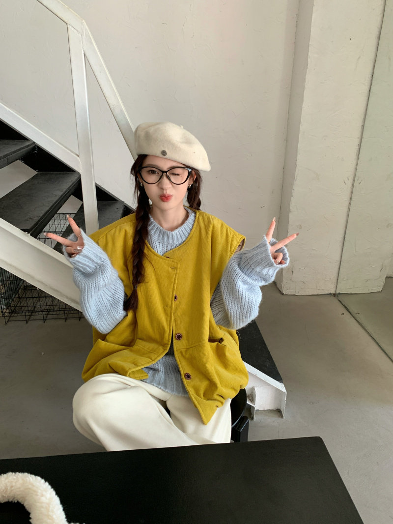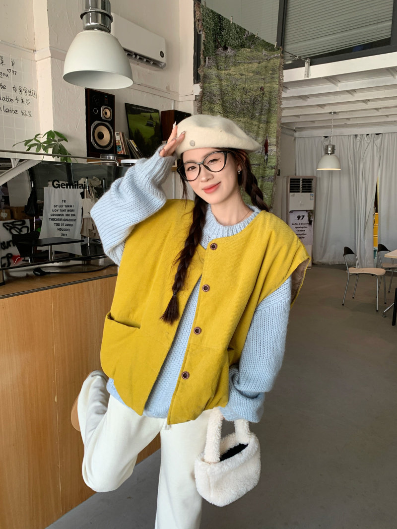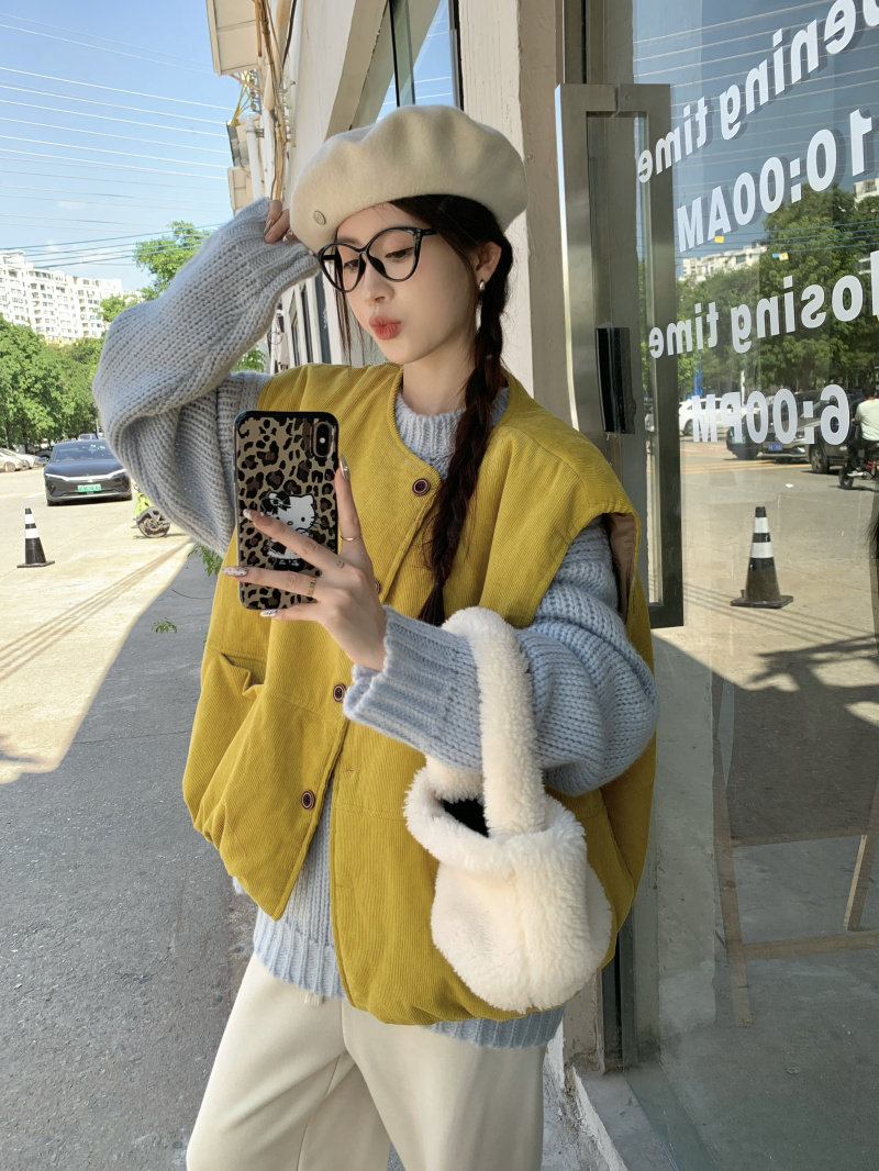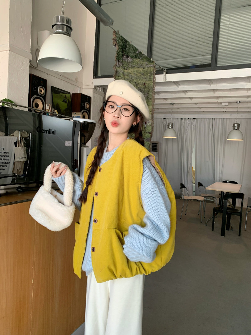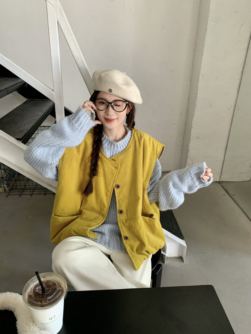 Japanese Retro Yellow Corduroy Vest Jacket for Women, Autumn and Winter Layered Loose Vest Outerwear Cardigan Top