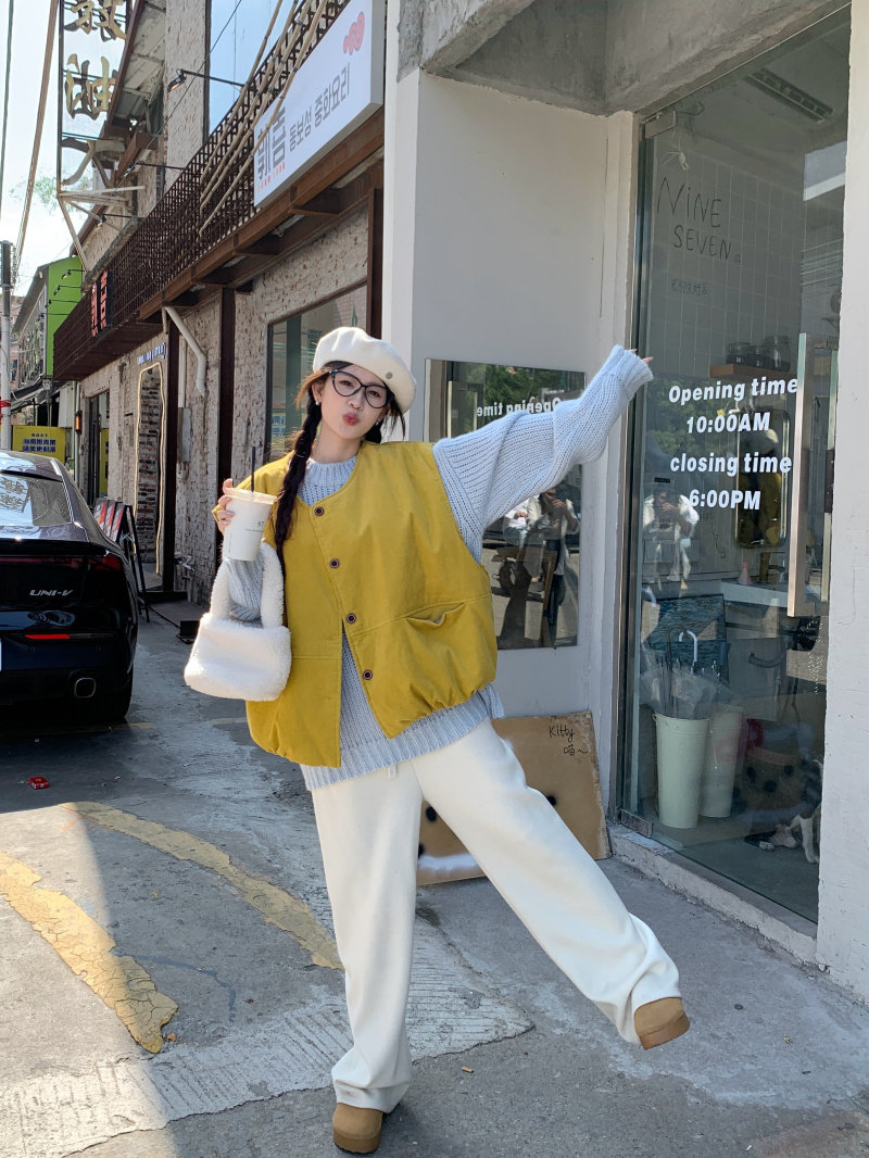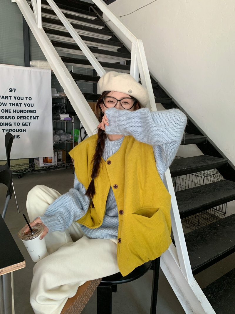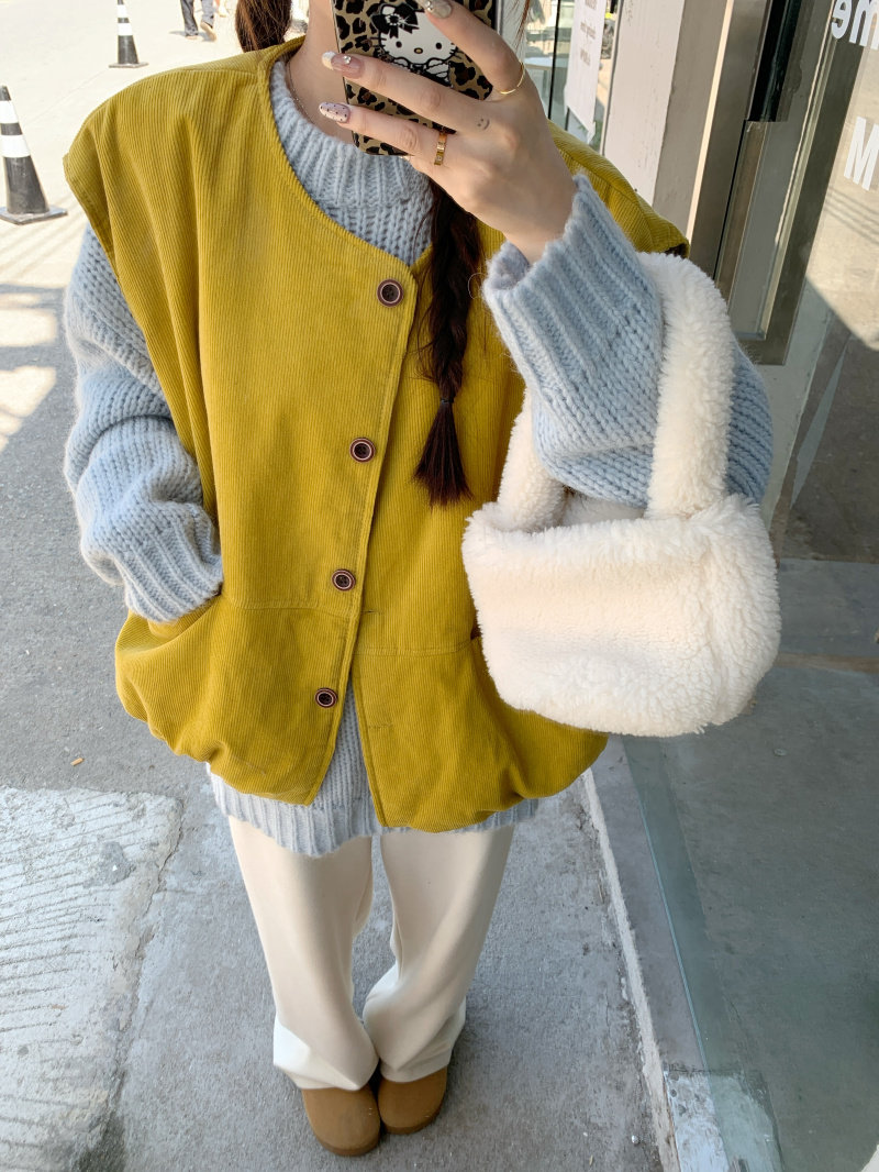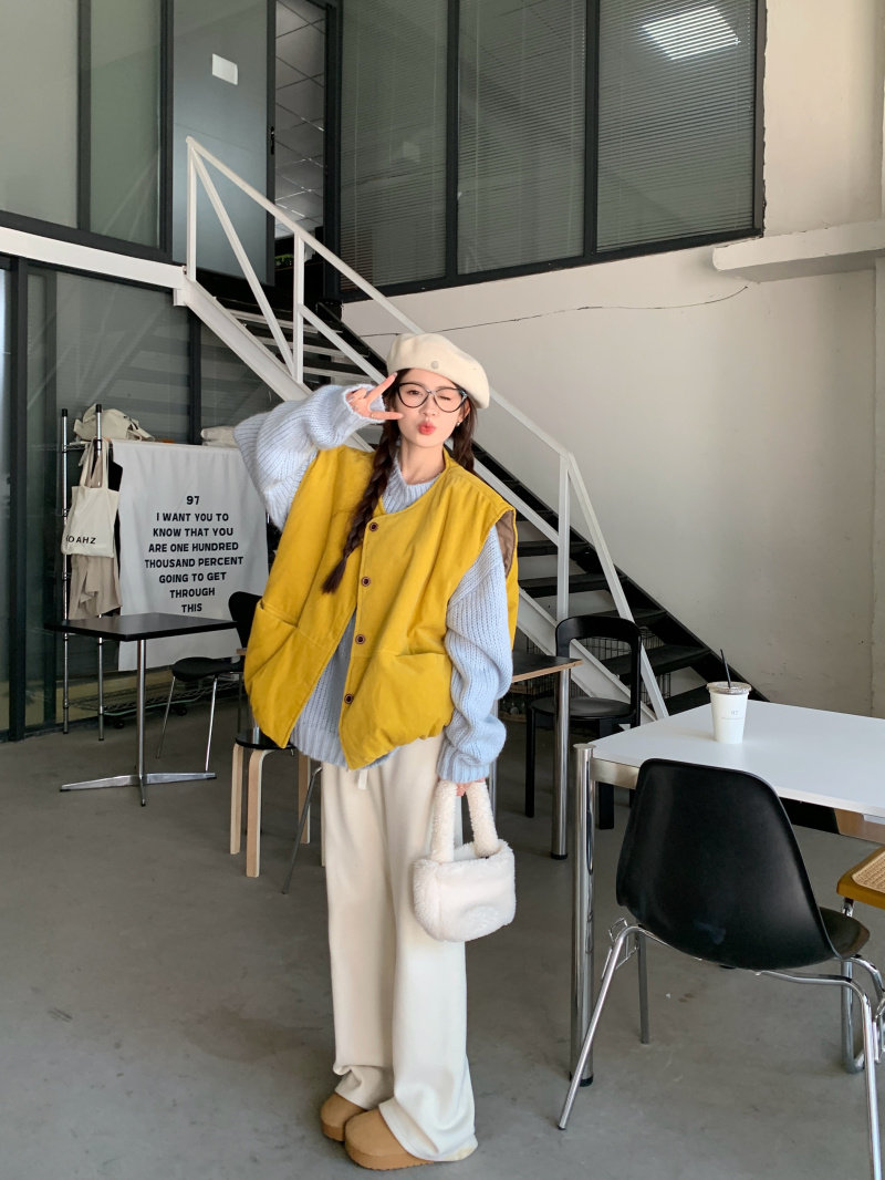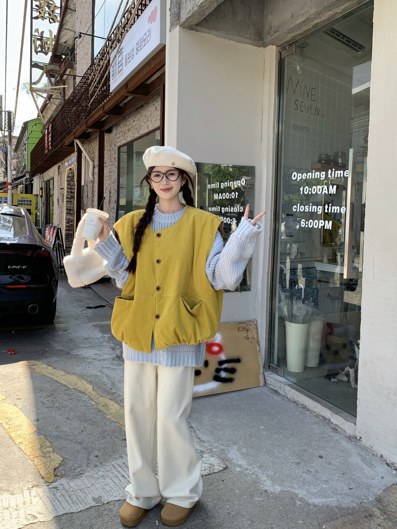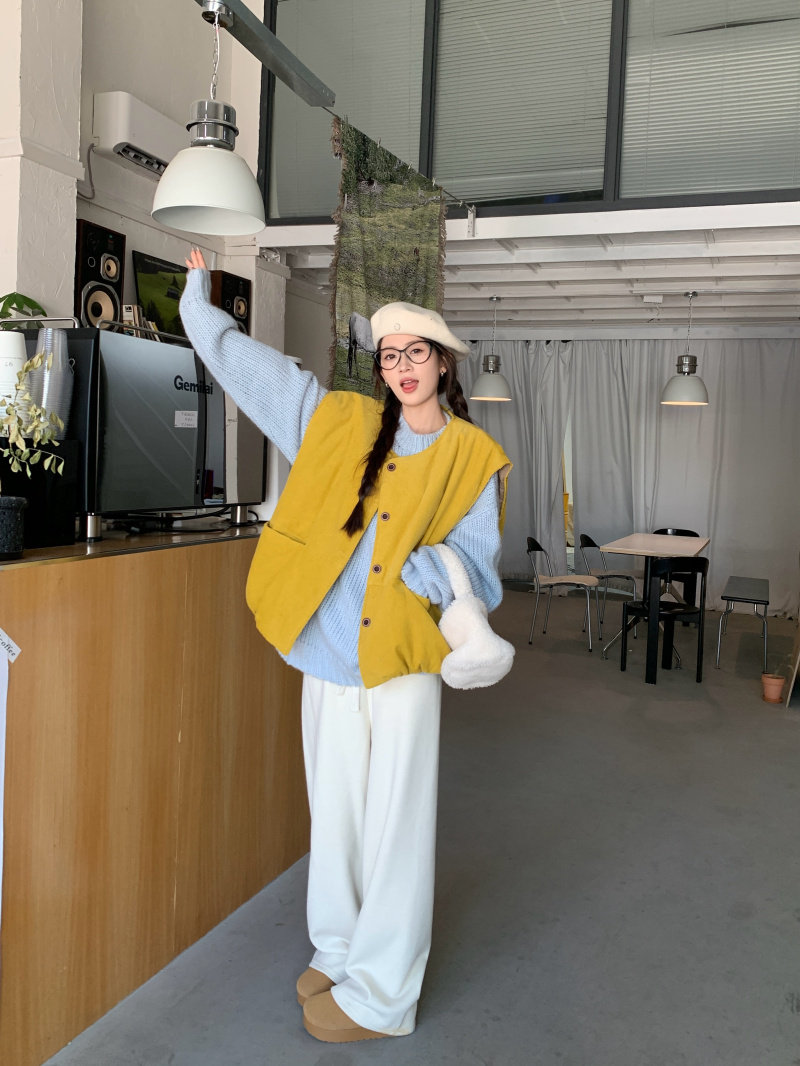 Japanese Retro Yellow Corduroy Vest Jacket for Women, Autumn and Winter Layered Loose Vest Outerwear Cardigan Top