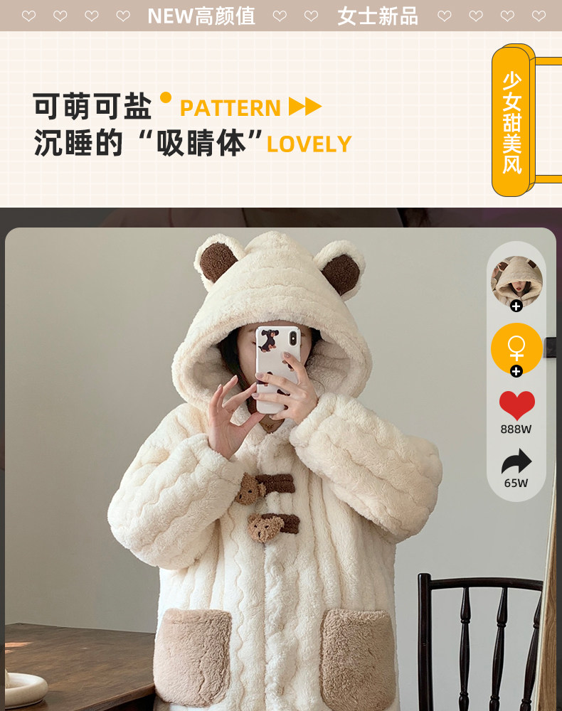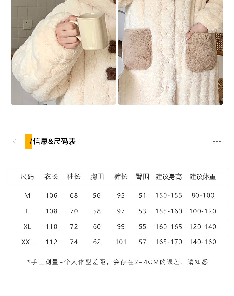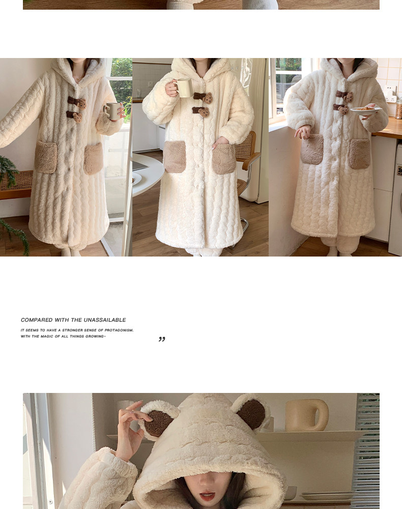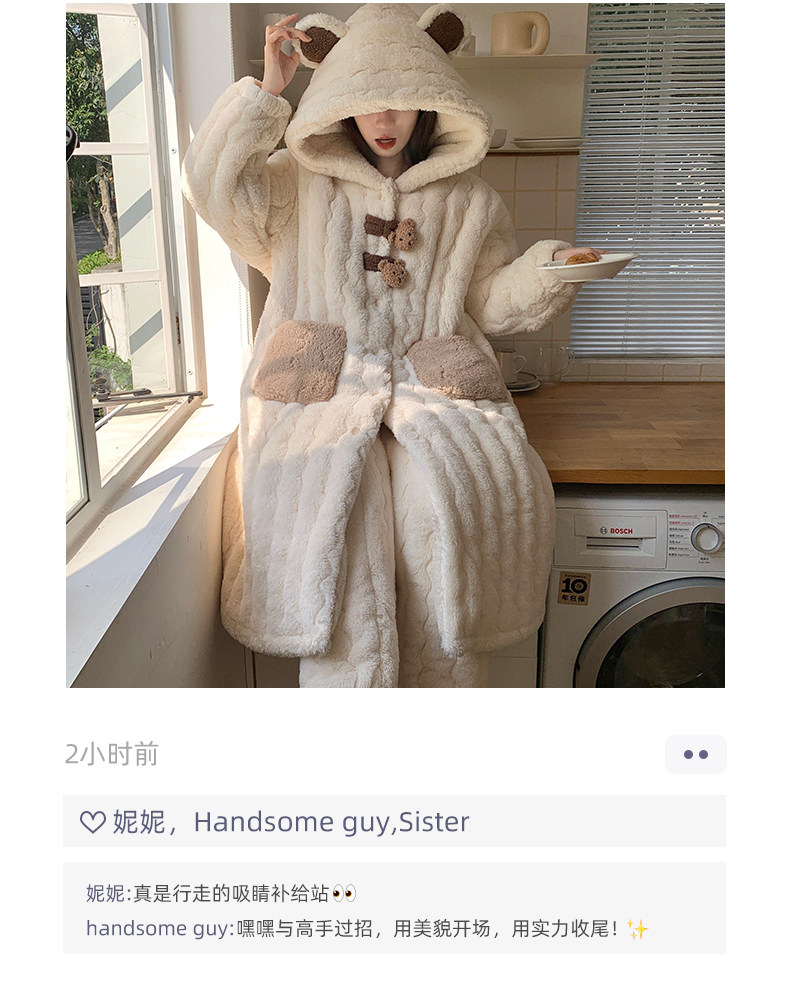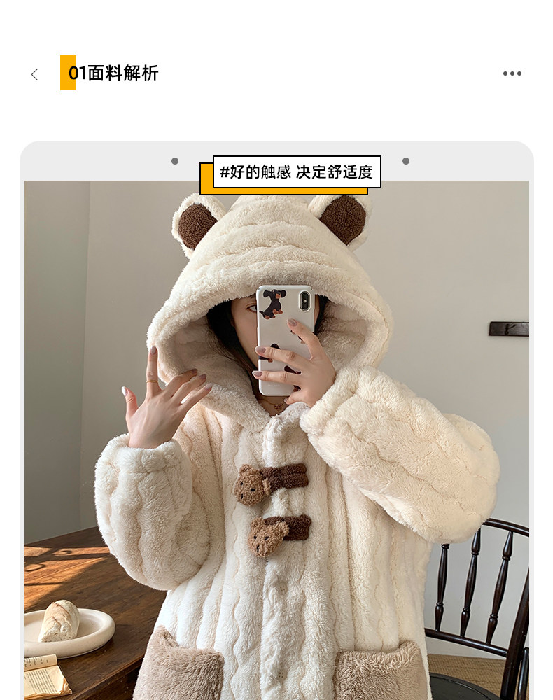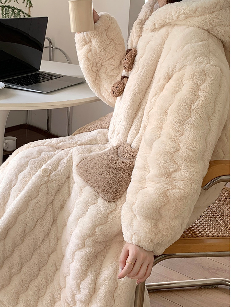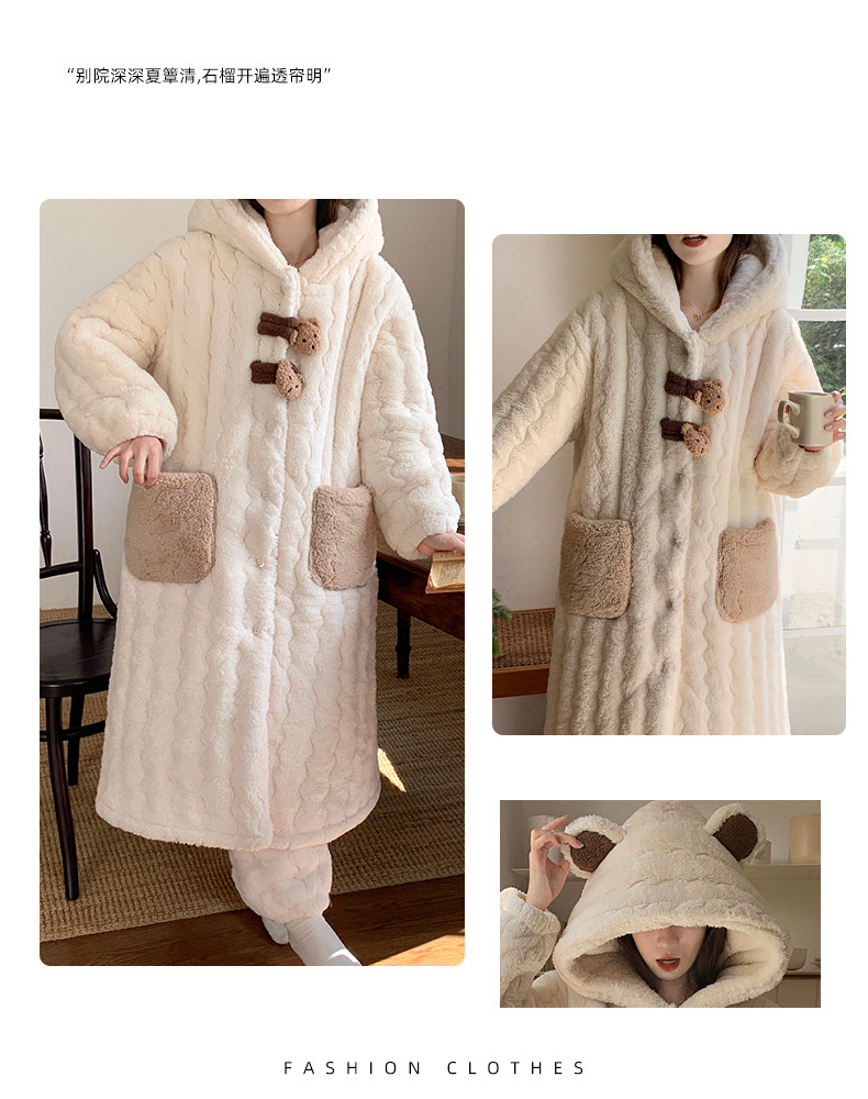 Three-Layer Quilted New Bear-Themed Women's Nightgown, Autumn and Winter Fleece-Lined Thickened Coral Fleece Pajama Set, Loungewear