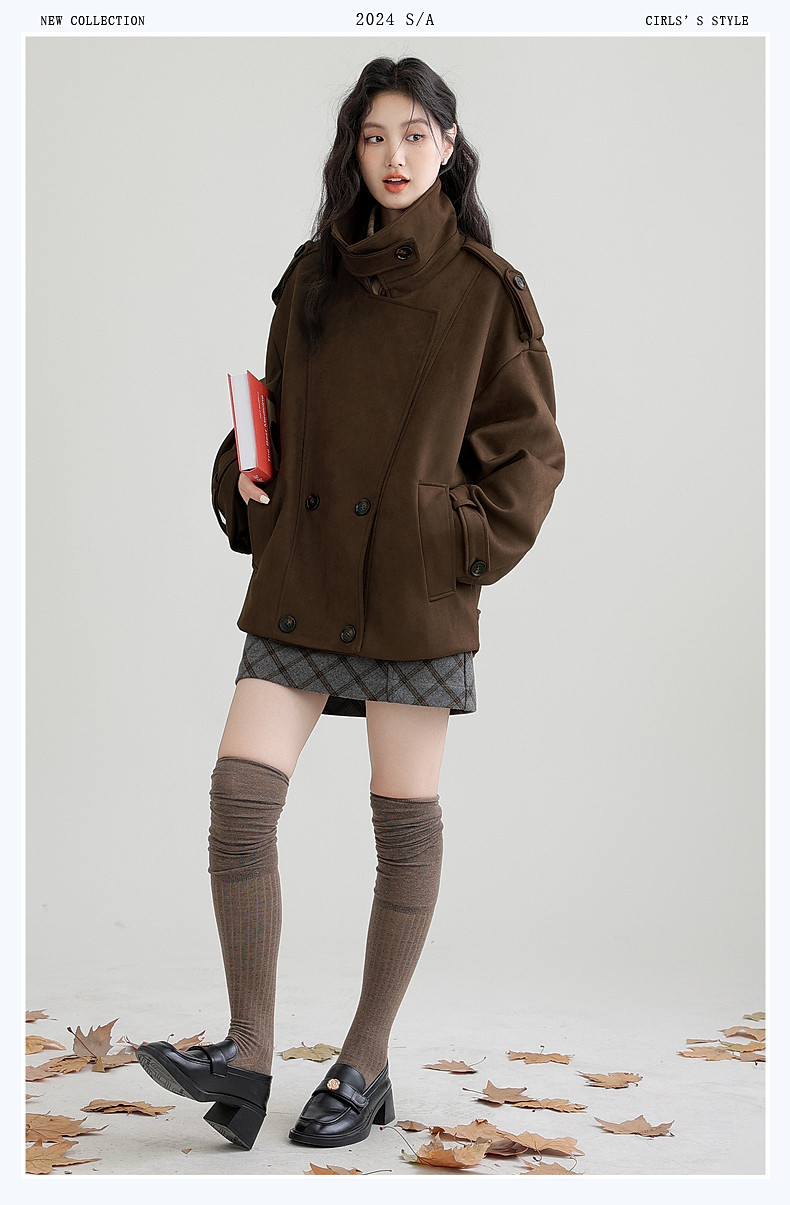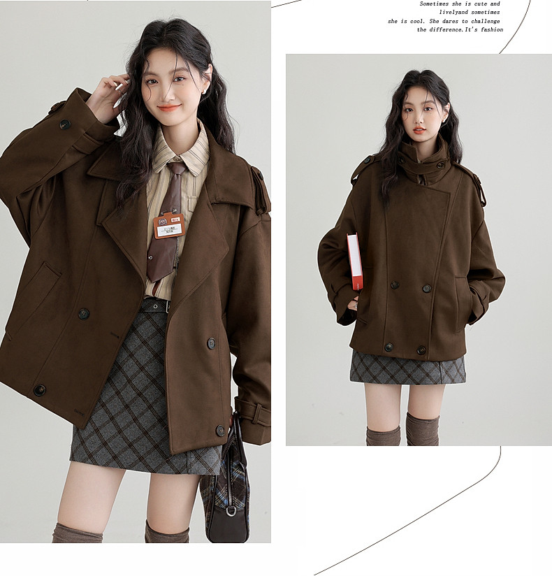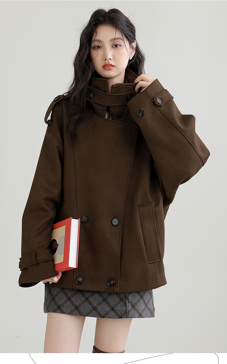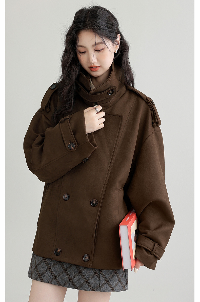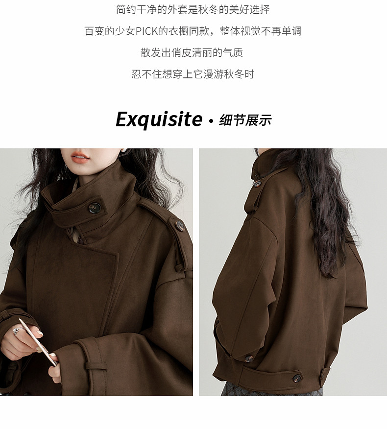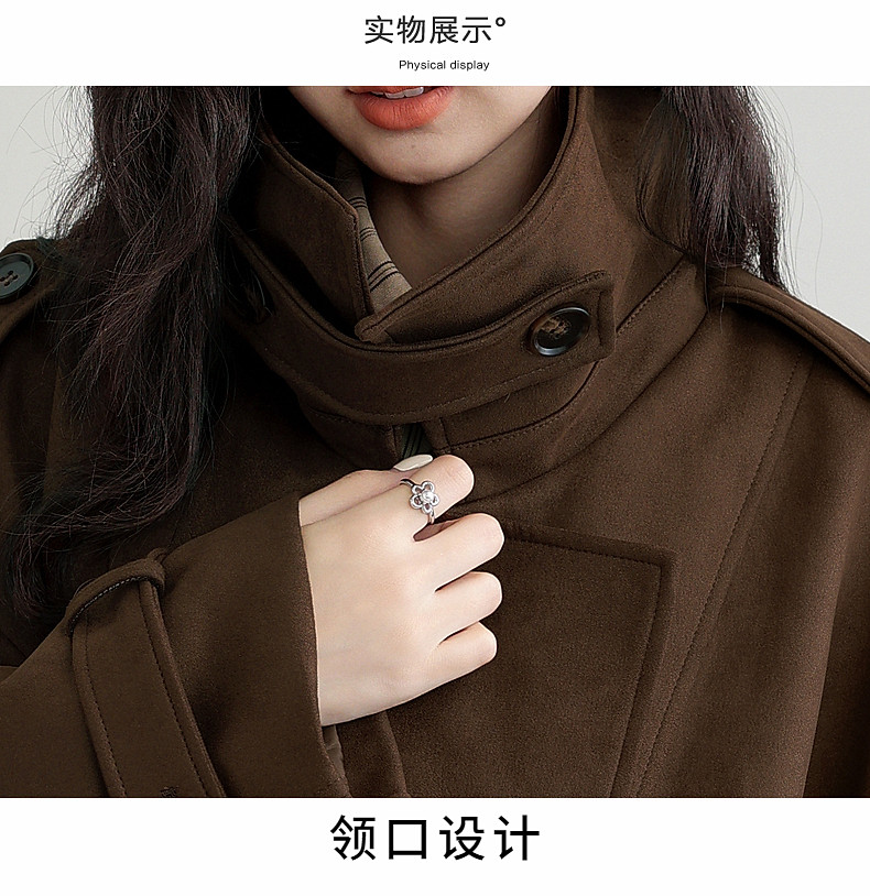 2024 Early Winter New Style Coffee-Colored Suede Cardigan Jacket for Women with a Unique Design, Stand Collar, Short Workwear Trench Coat Trend