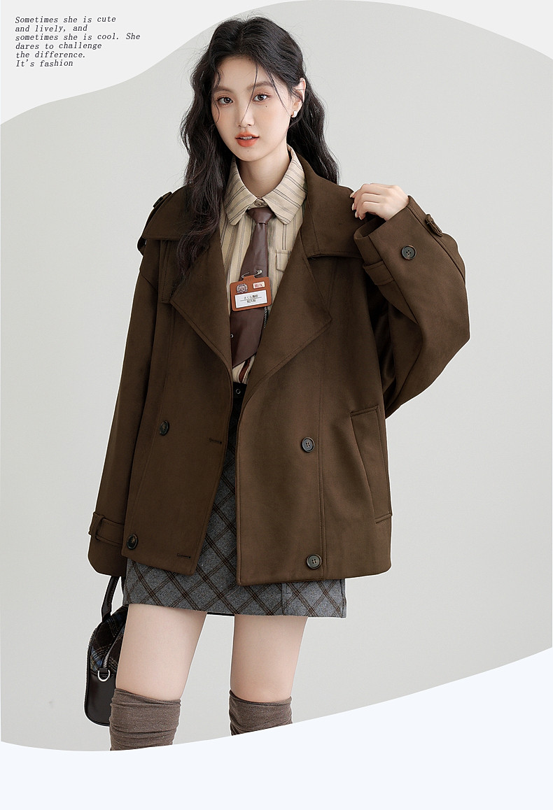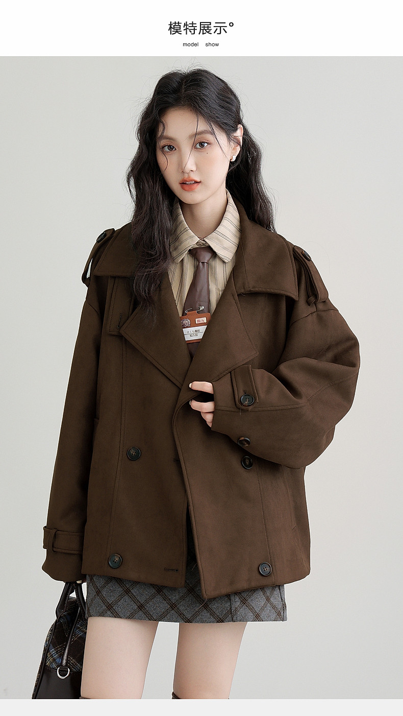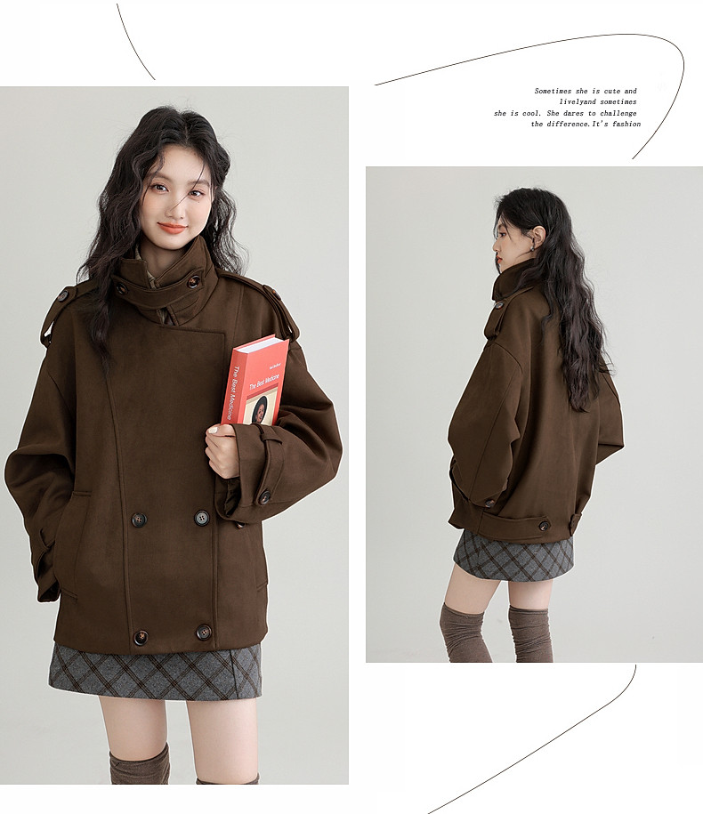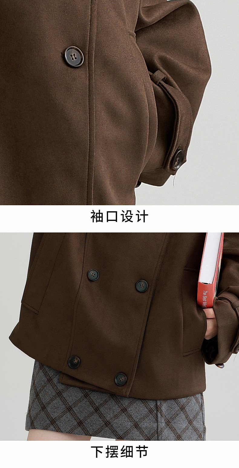 2024 Early Winter New Style Coffee-Colored Suede Cardigan Jacket for Women with a Unique Design, Stand Collar, Short Workwear Trench Coat Trend