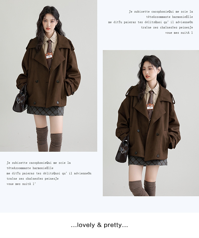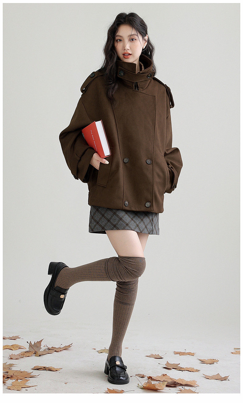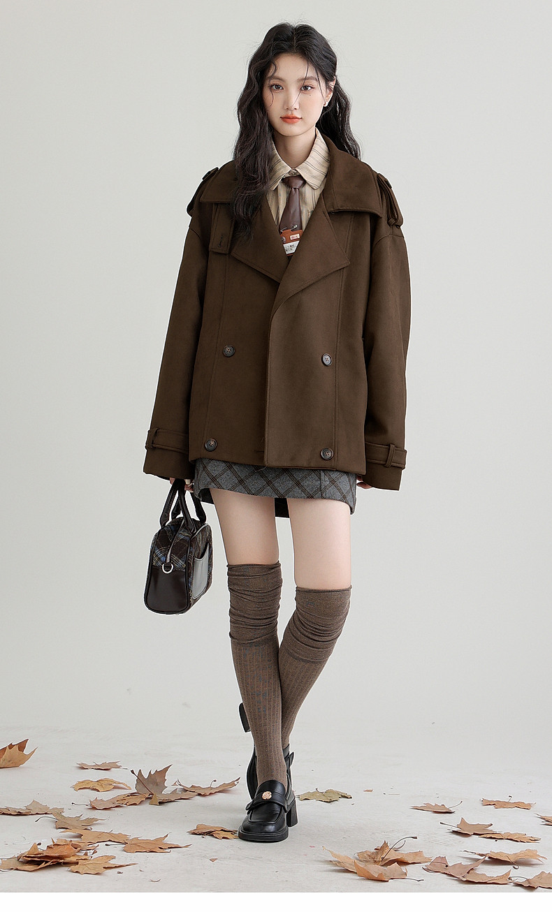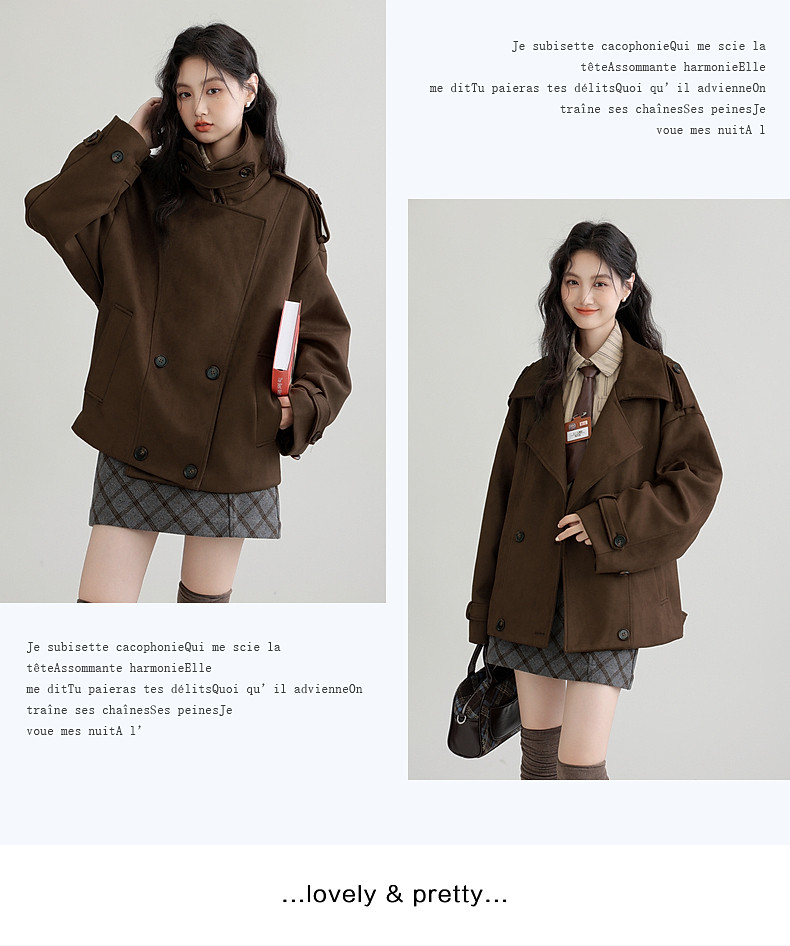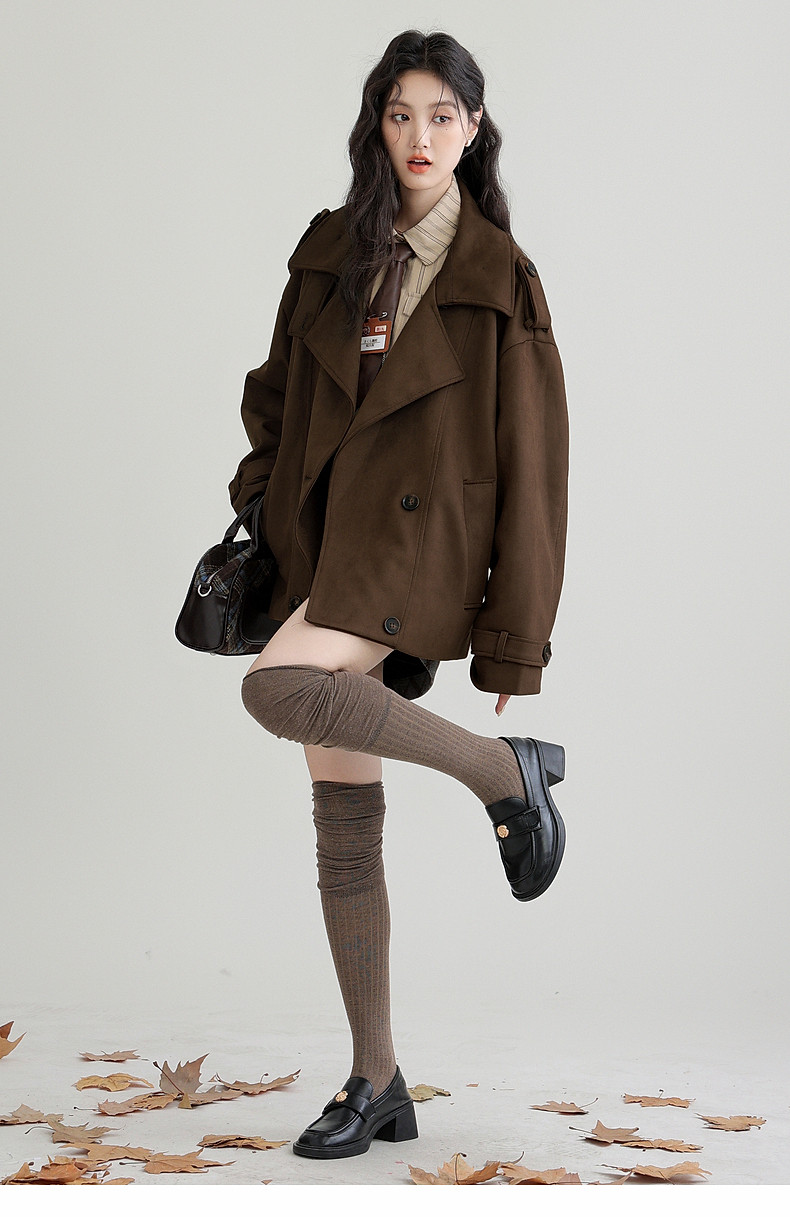 2024 Early Winter New Style Coffee-Colored Suede Cardigan Jacket for Women with a Unique Design, Stand Collar, Short Workwear Trench Coat Trend