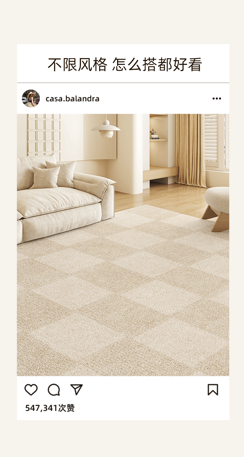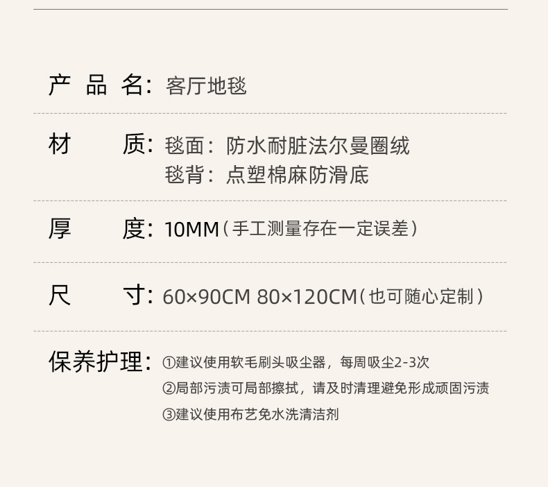 Carpet size 120cm*160cm Try new size, waterproof and thickened upgrade,140cm*200cm, suitable for 2-3 people, small sofa, floor heating available,150cm*200cm, suitable for 2-3 people, small sofa, breathable and soundproof,160cm*230cm, suitable for small and medium-sized living rooms, non-slip and stain-resistant,180cm*250cm suitable for small and medium-sized living rooms, 0 formaldehyde and 0 odor,180cm*280cm, suitable for 3 people or L-shaped sofa, sound insulation and noise reduction,200cm*300cm suitable for 3 people or L-shaped sofa. The best-selling size recommended by the store manager,200cm*340cm, suitable for 4 people or L-shaped sofa, original designer,240cm*360cm, suitable for 4 people or L-shaped sofa, environmentally friendly knitted back,Free customized consultation and customer service, no refunds or exchanges