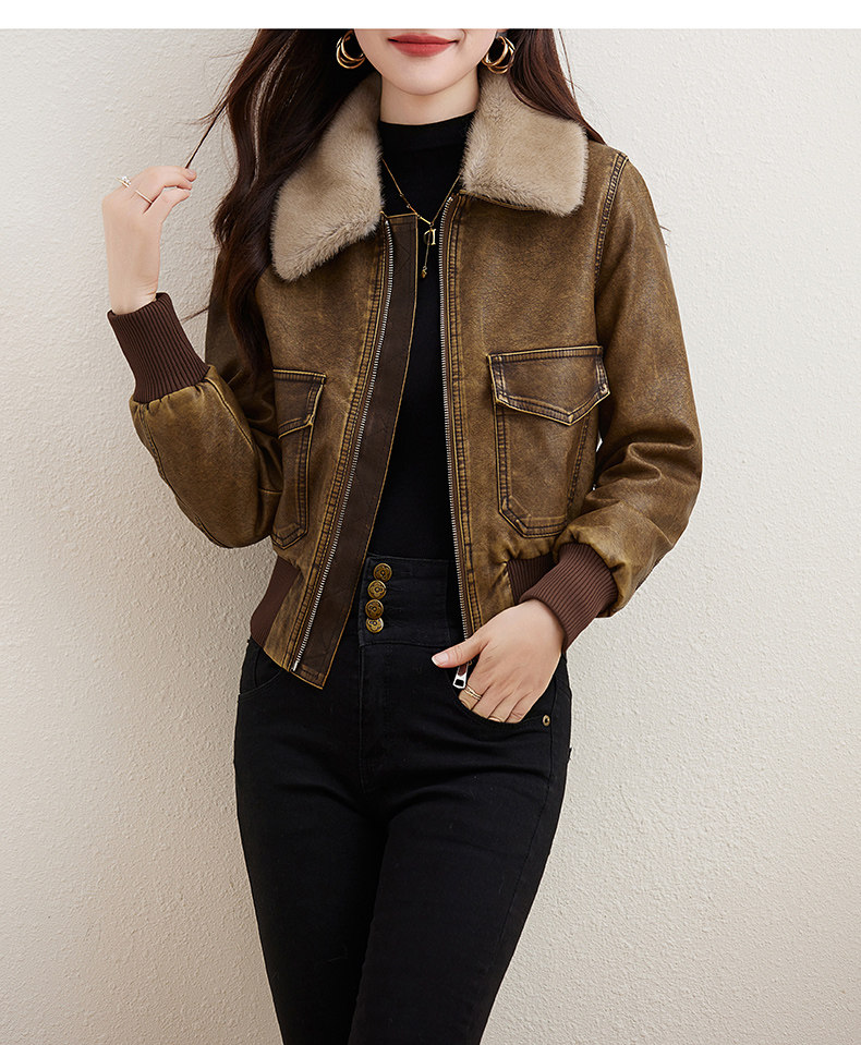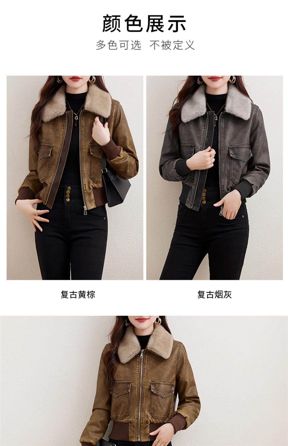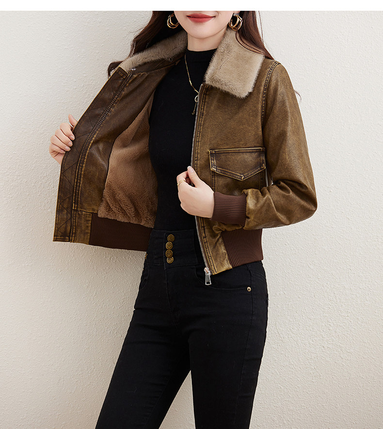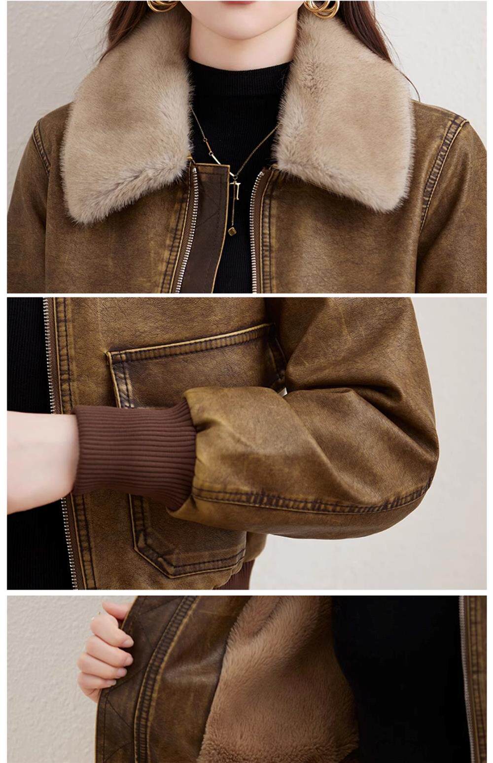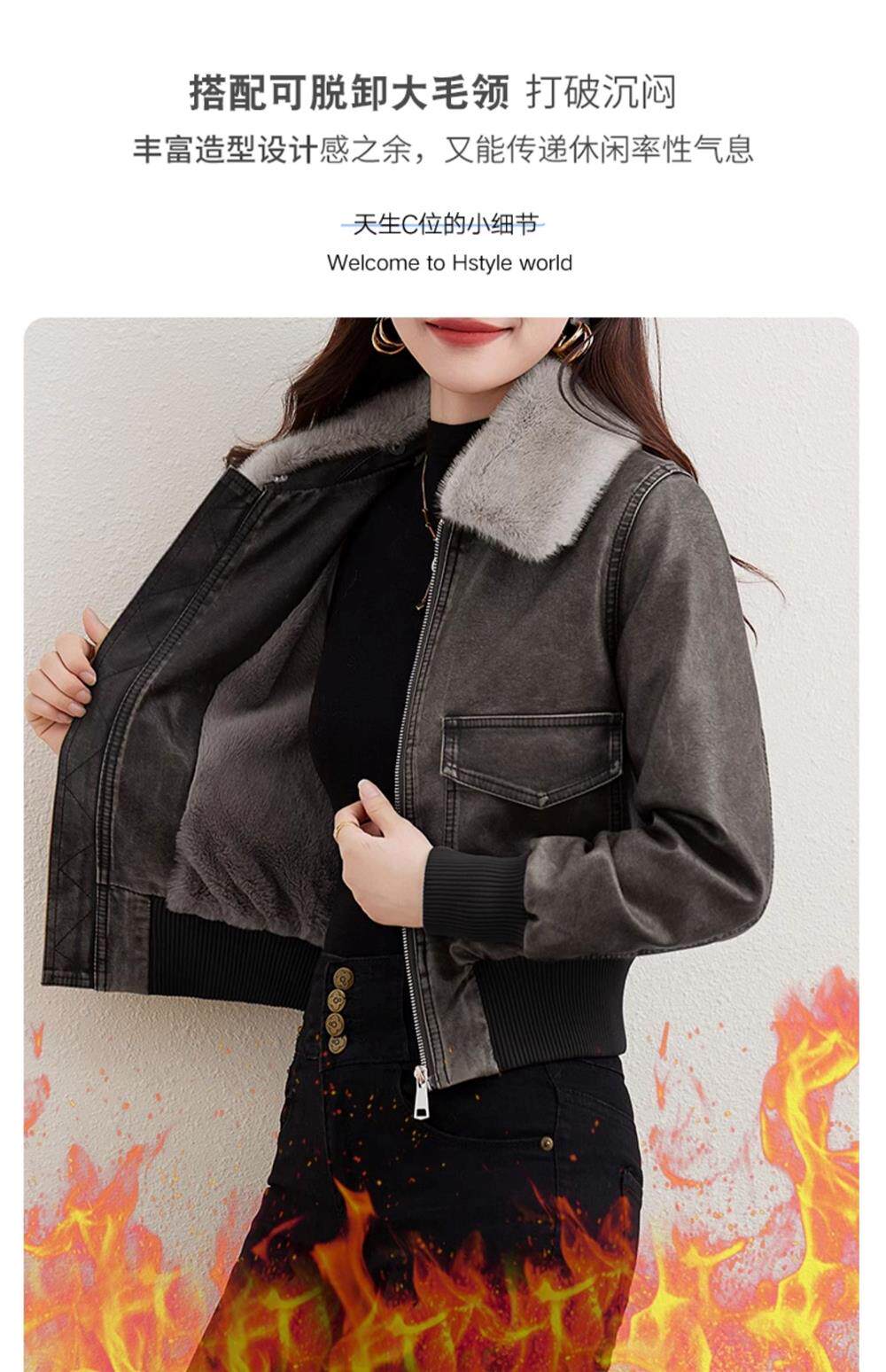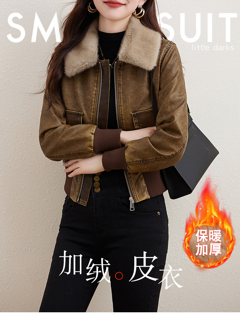 Retro frosted plus velvet leather jacket for women 2025 winter new style small short style trendy motorcycle jacket leather jacket