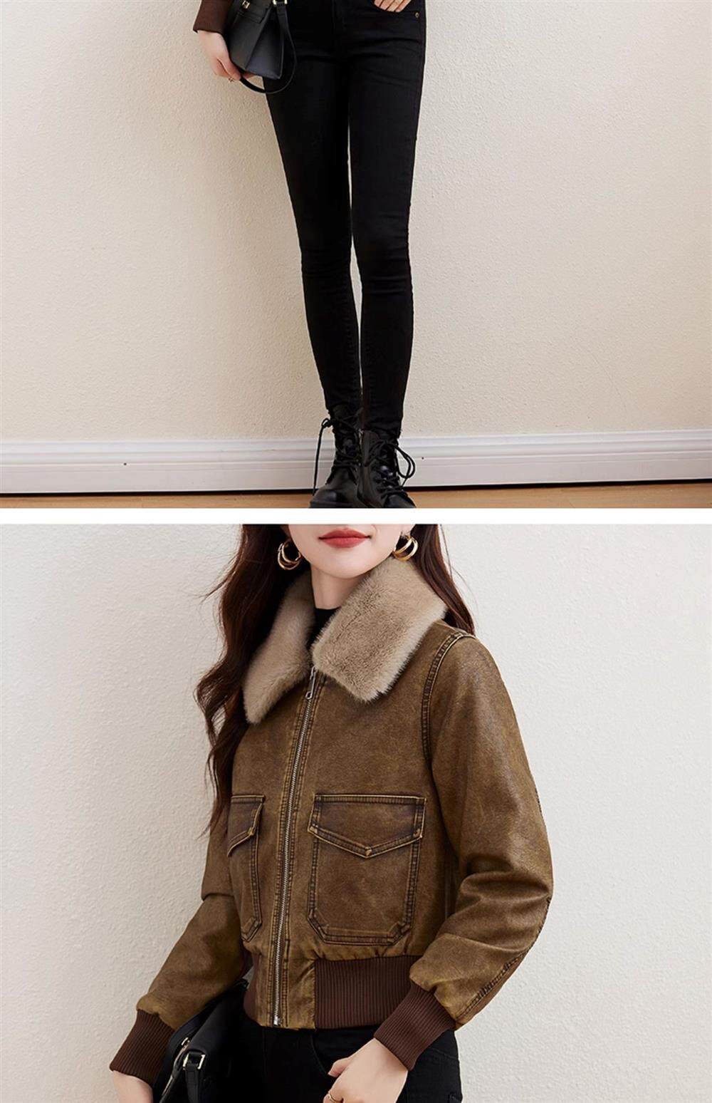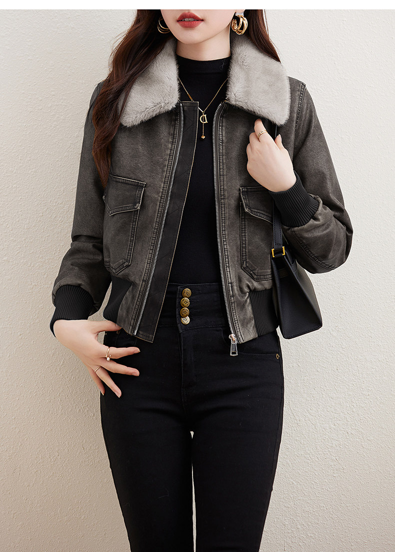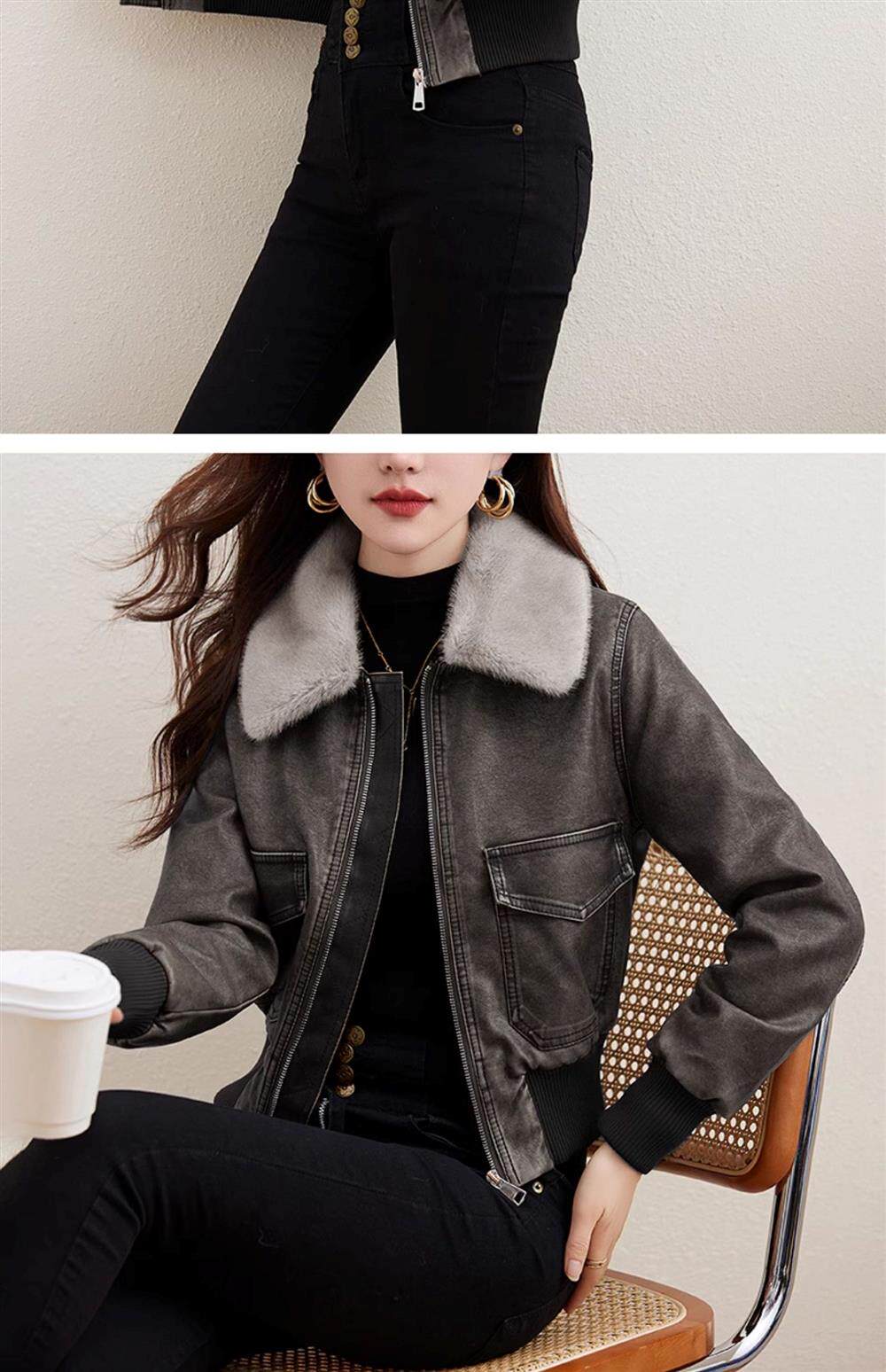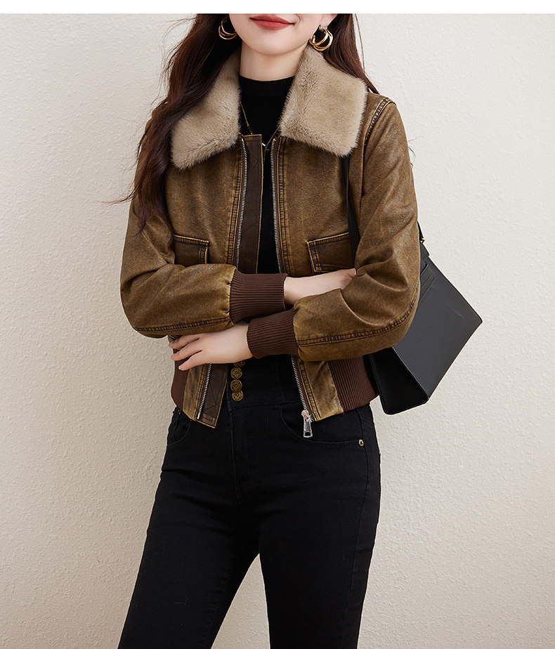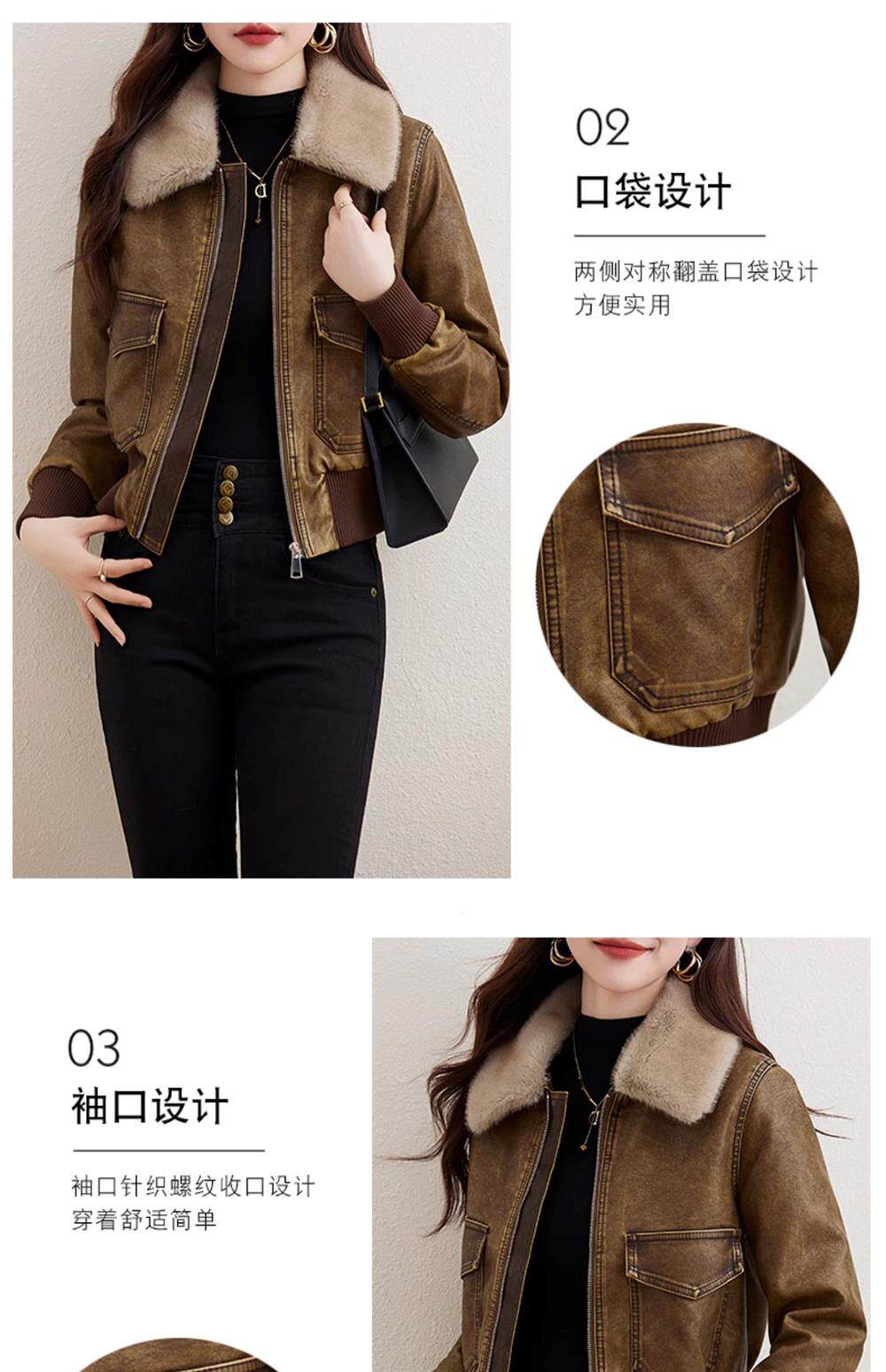 Retro frosted plus velvet leather jacket for women 2025 winter new style small short style trendy motorcycle jacket leather jacket