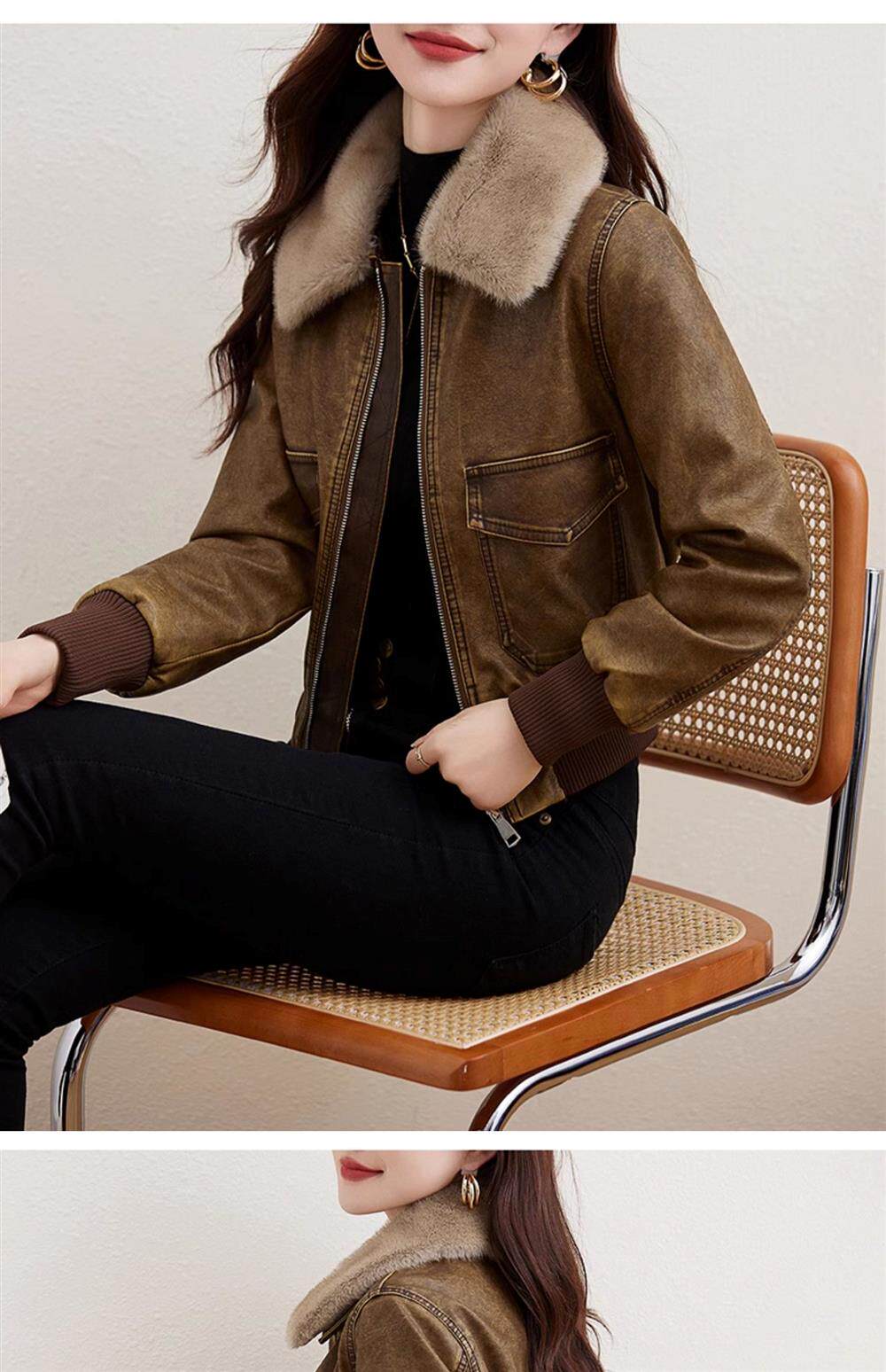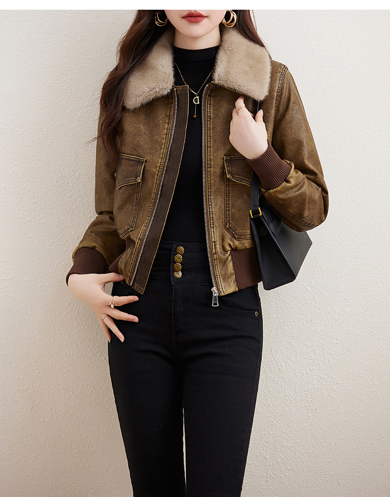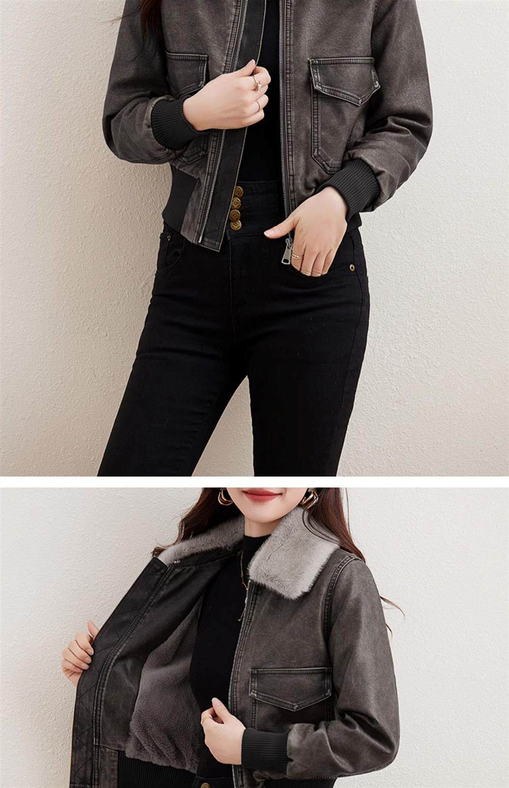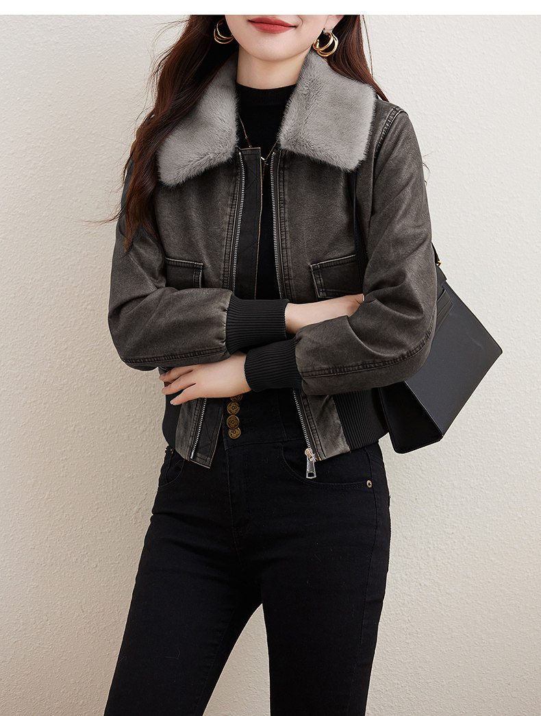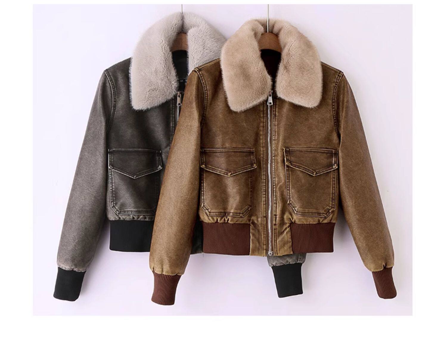 Retro frosted plus velvet leather jacket for women 2025 winter new style small short style trendy motorcycle jacket leather jacket