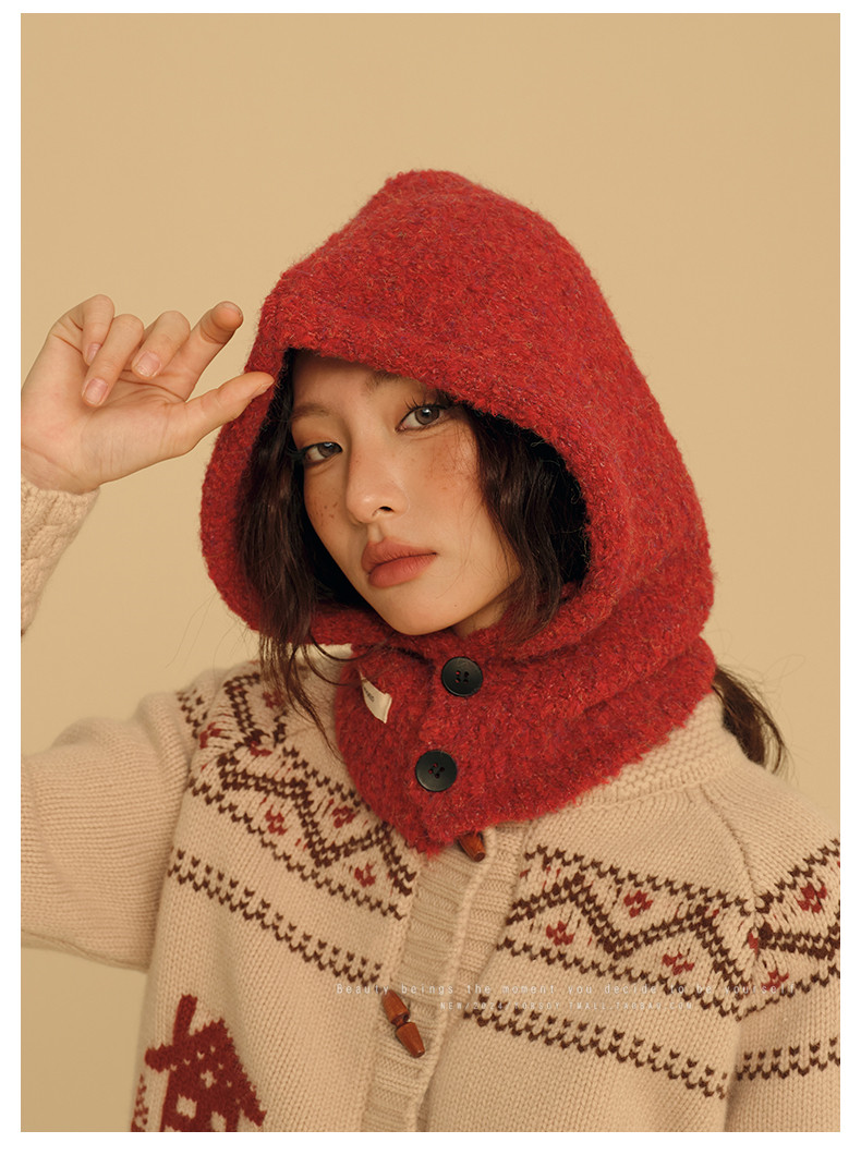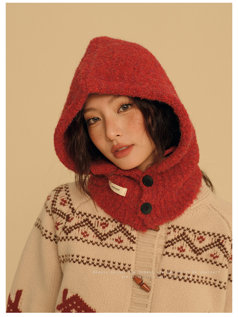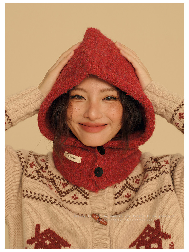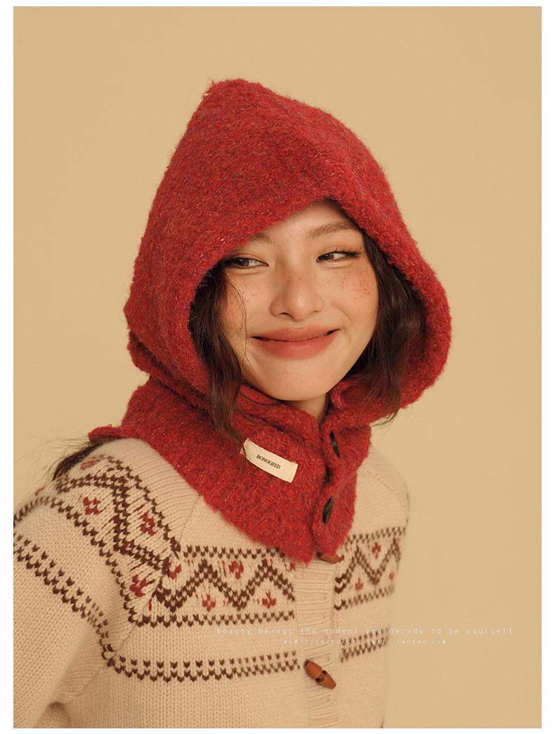 New Year Red Hat for Women, Winter Ear Protection Balaclava, Warm Retro Scarf Integrated Knitted Wool Hat